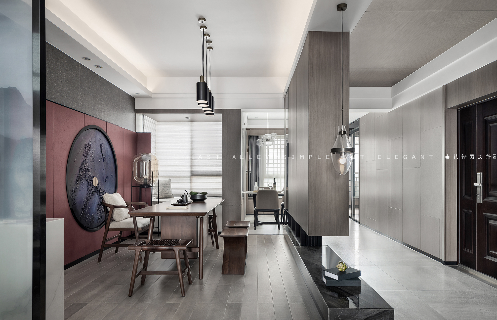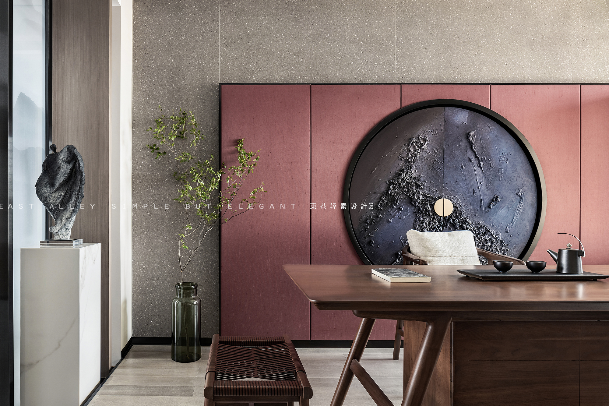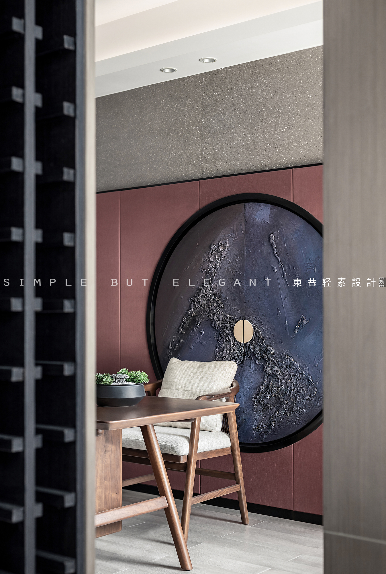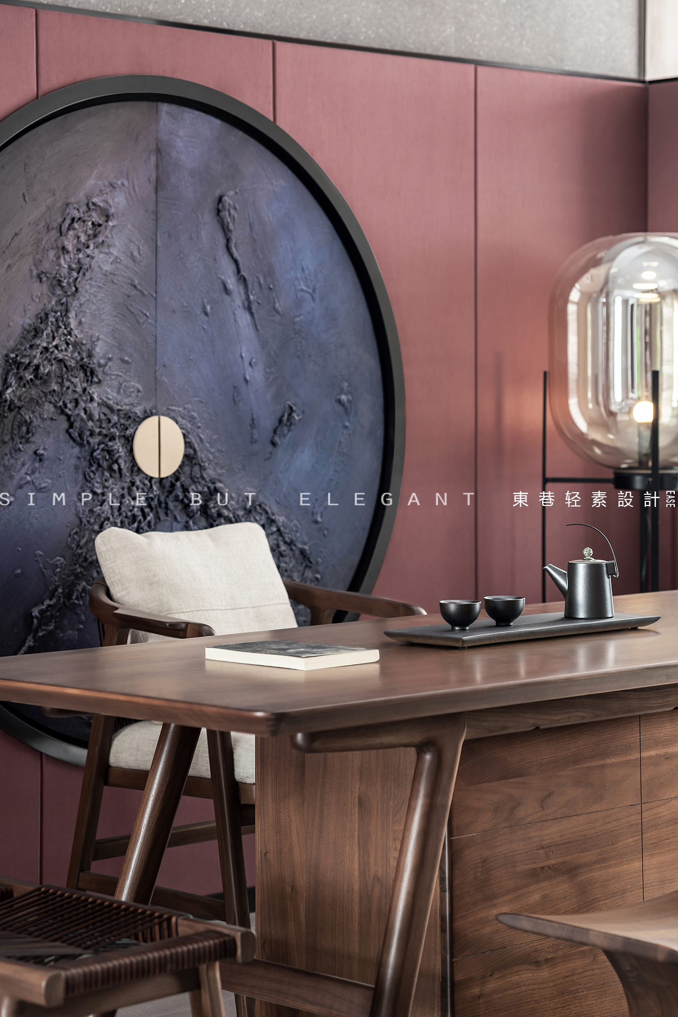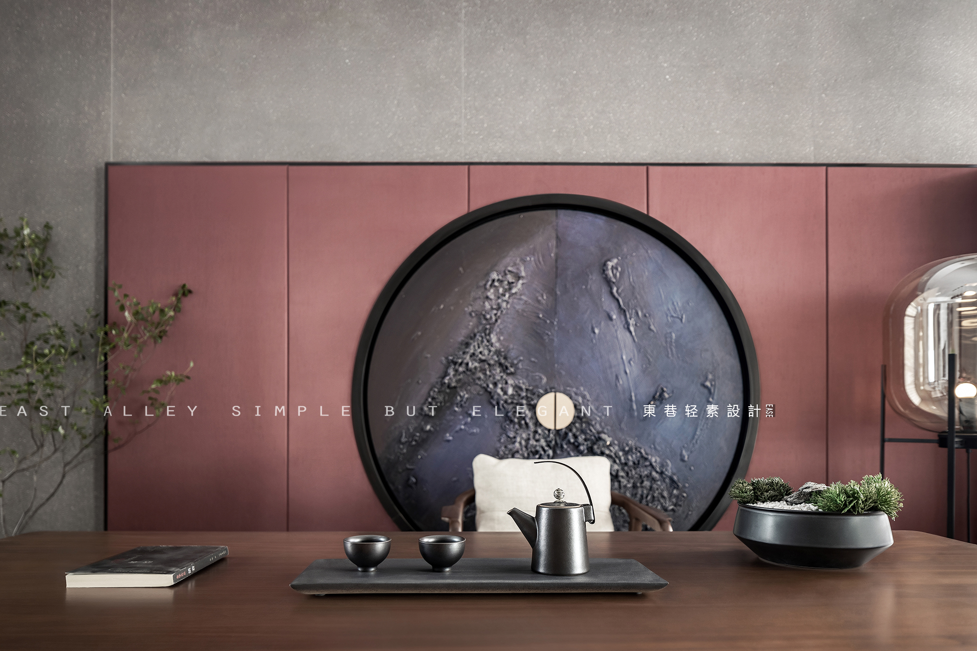 茶室背景墙采用朱砂色硬包材质,凸显出中式典雅花饰的质朴美感,自然与文化紧密相连,茶香之中等你细细品味。净心素雅,不污不垢,淡看浮华。清墨茗香木合玉之温润 温润中散发着盈盈古韵 三四杯盏 文仕风雅围坐其间 烹茶细抿。