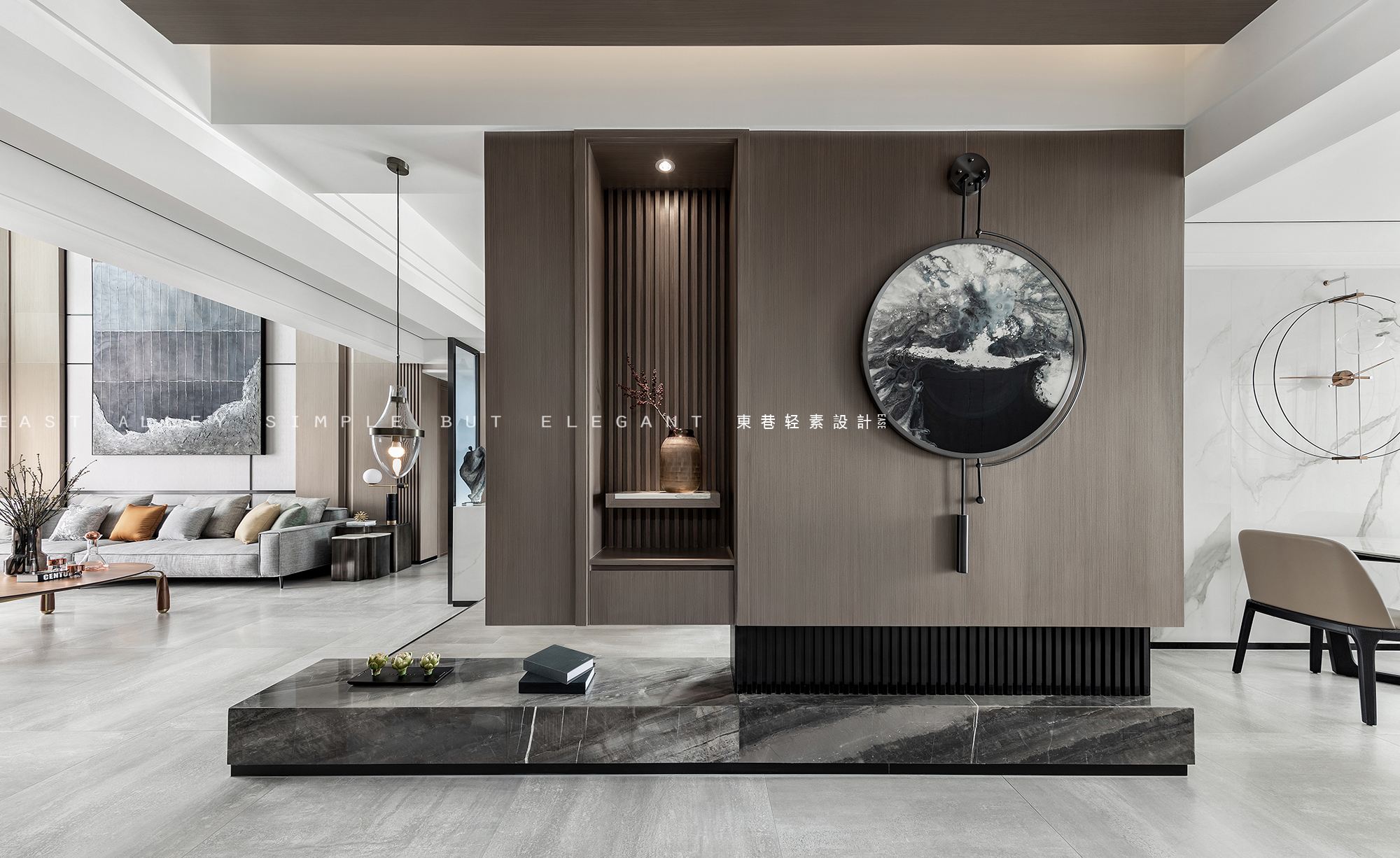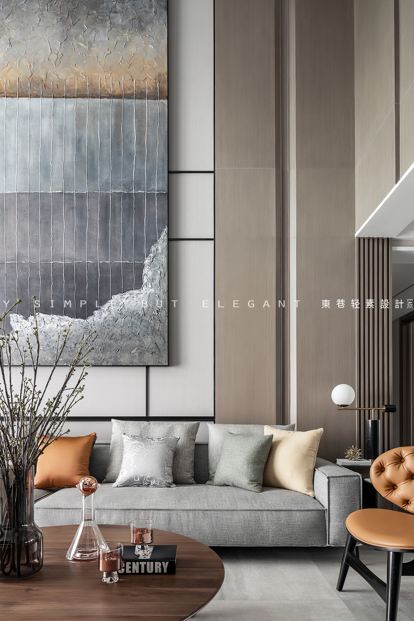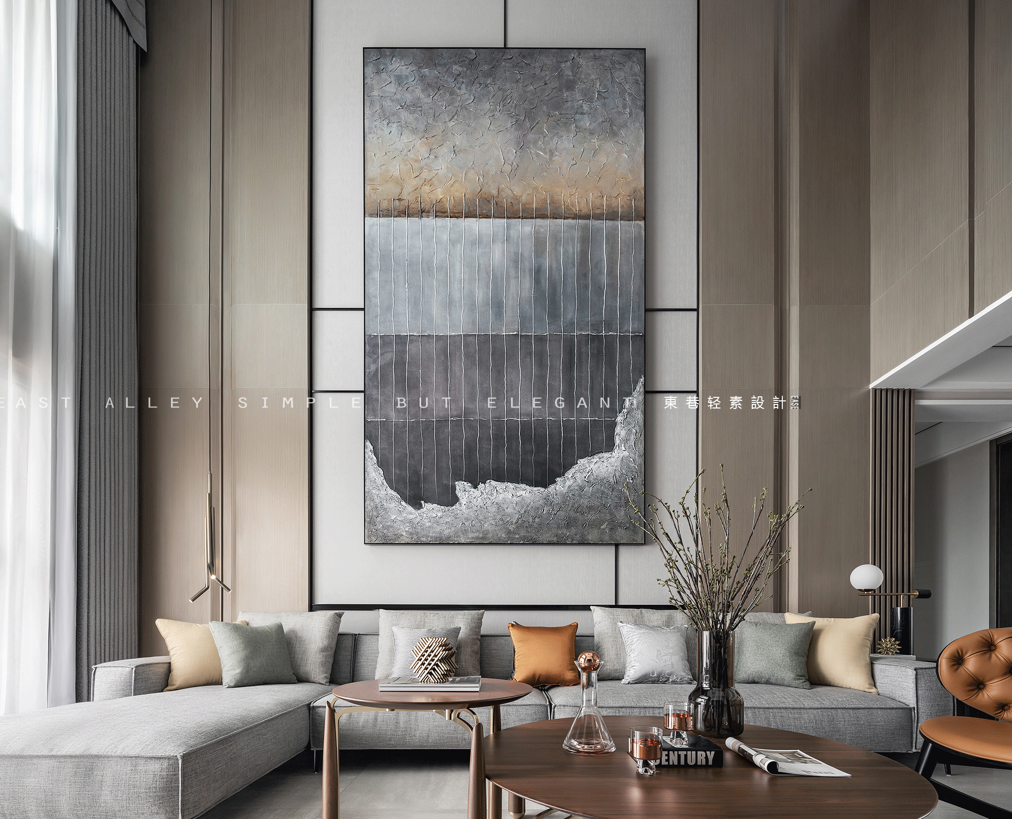 巨幅挂画从天花一直垂落,成为了挑空客厅空间的视觉落点。工笔之下,勾勒出空间的张力和层次。挂画的纹路肌理被应用到整个背景中,与通高的木饰面互相映衬,拉阔向上的视野,收束余韵。一体化的设计,整个居室自然流动,如诗如画。雅奢之境,是现代文人雅士追求的生活艺术,强调审美意蕴程度适中,不过分而无不及。