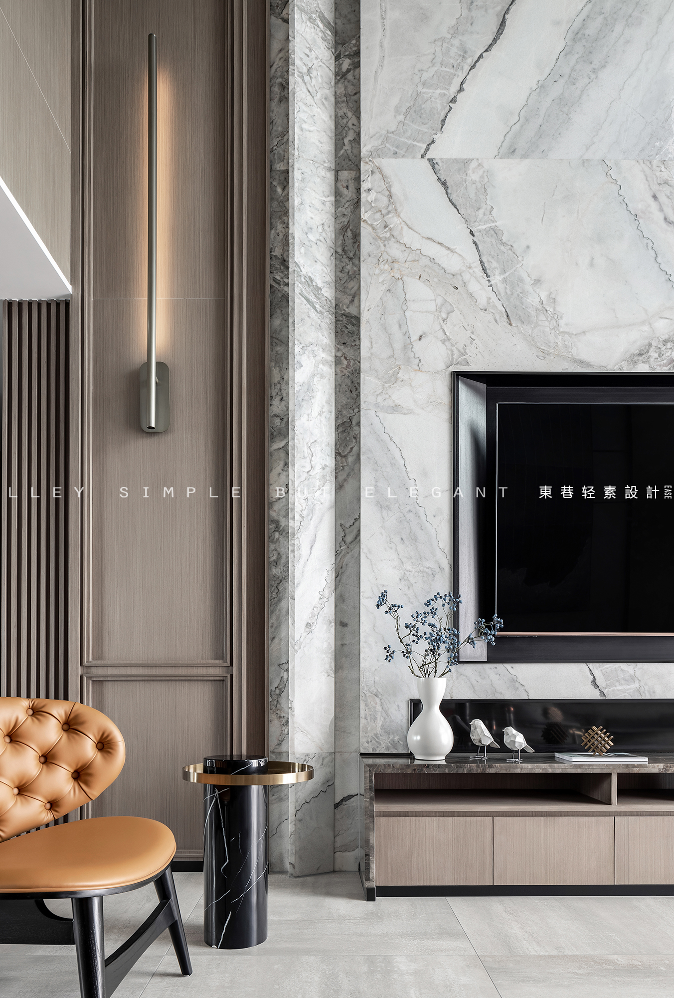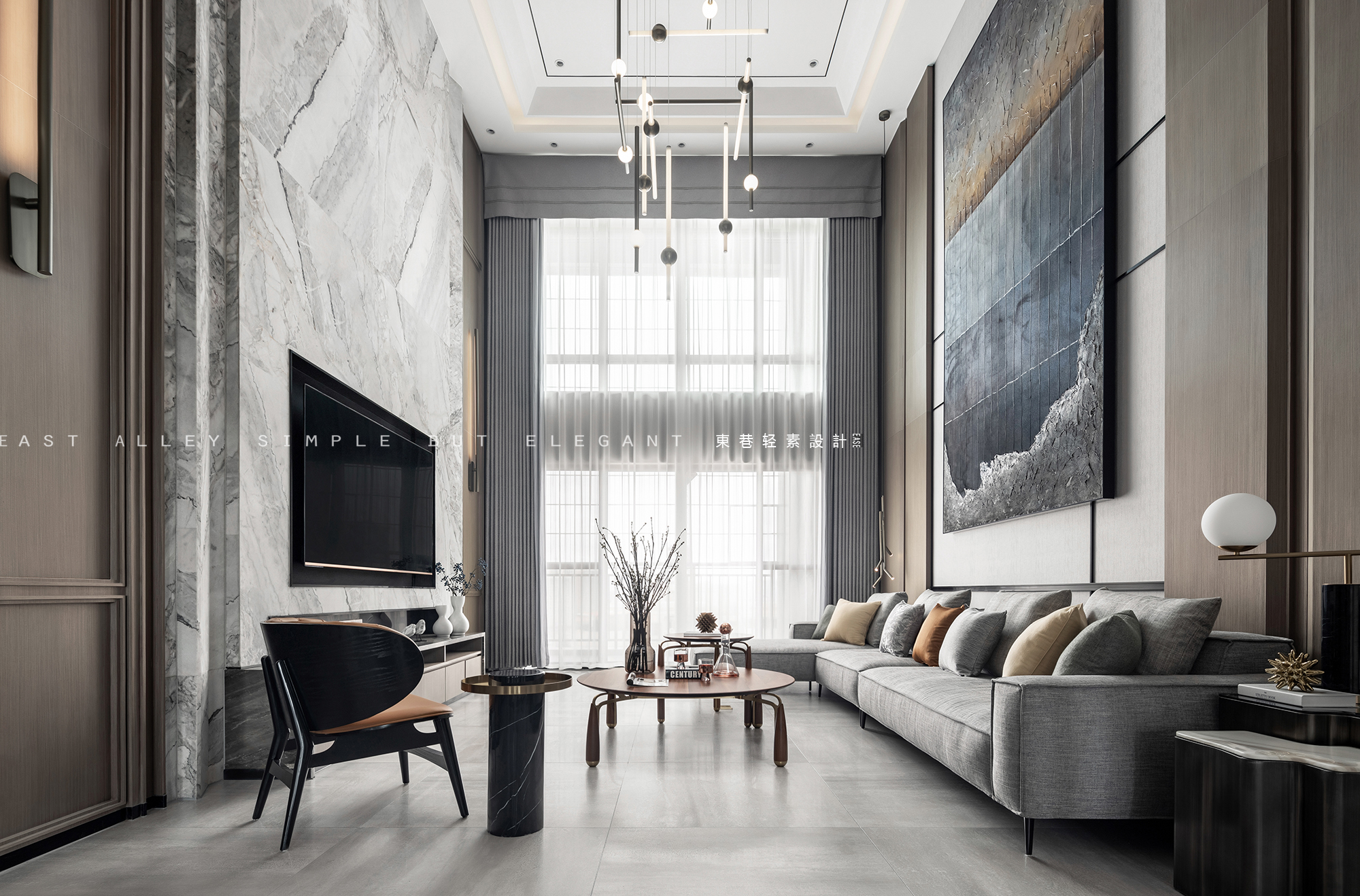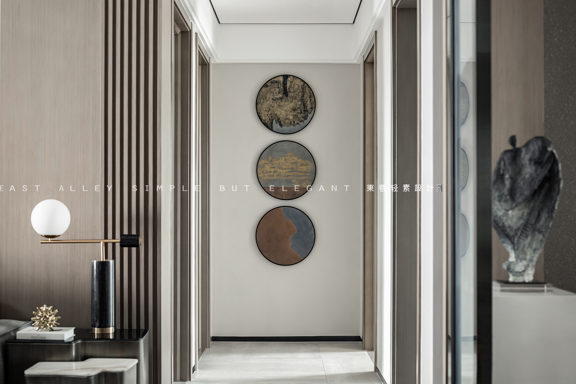 巨幅挂画从天花一直垂落,成为了挑空客厅空间的视觉落点。工笔之下,勾勒出空间的张力和层次。挂画的纹路肌理被应用到整个背景中,与通高的木饰面互相映衬,拉阔向上的视野,收束余韵。一体化的设计,整个居室自然流动,如诗如画。雅奢之境,是现代文人雅士追求的生活艺术,强调审美意蕴程度适中,不过分而无不及。