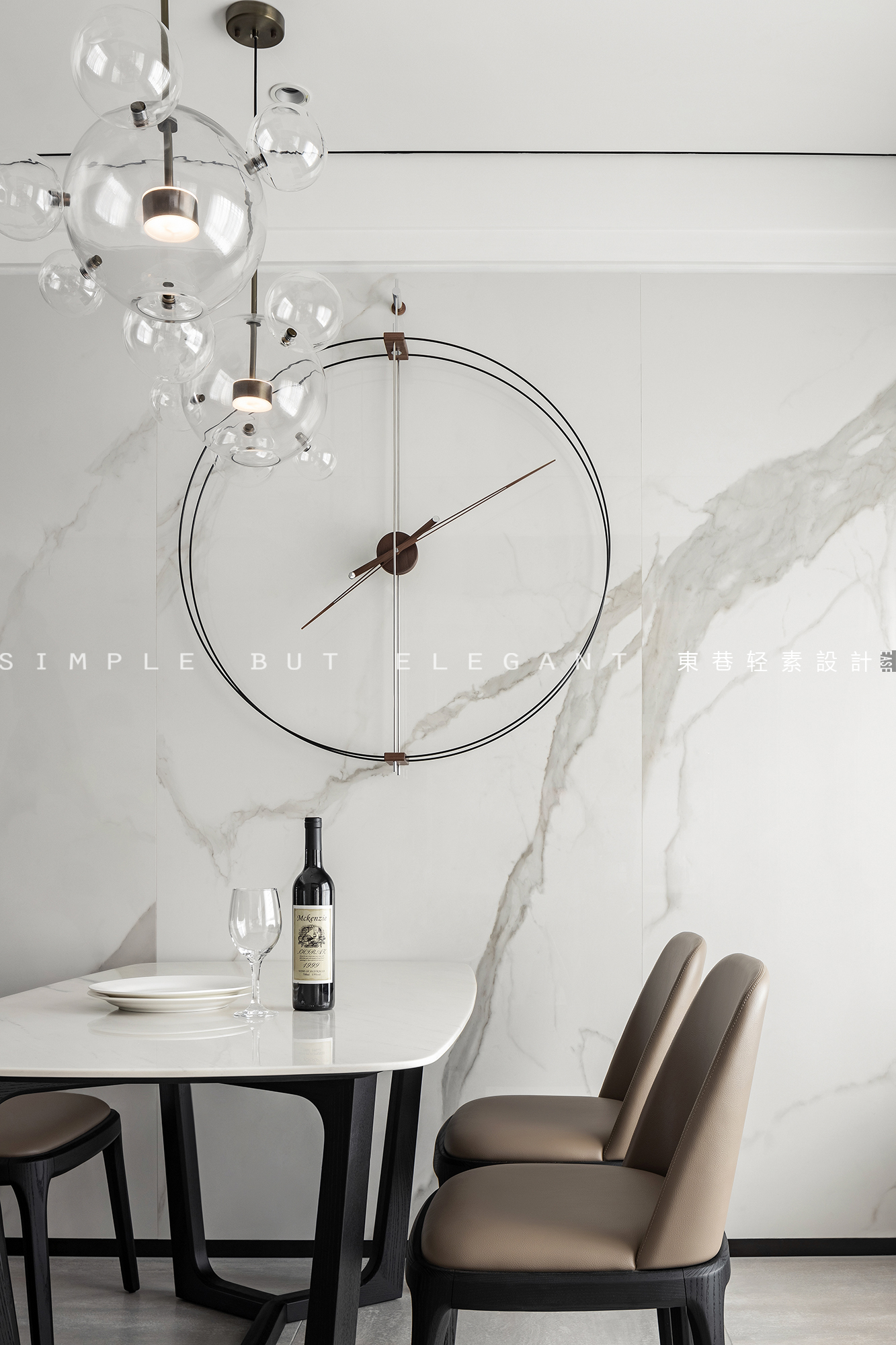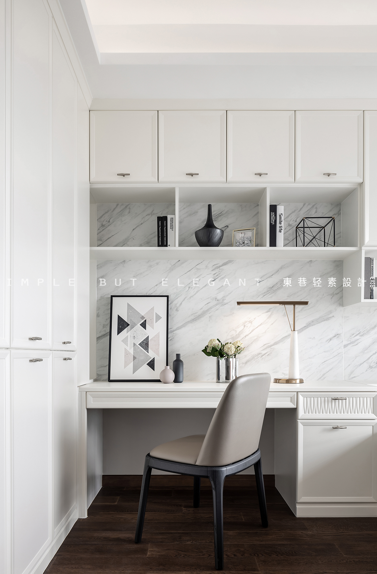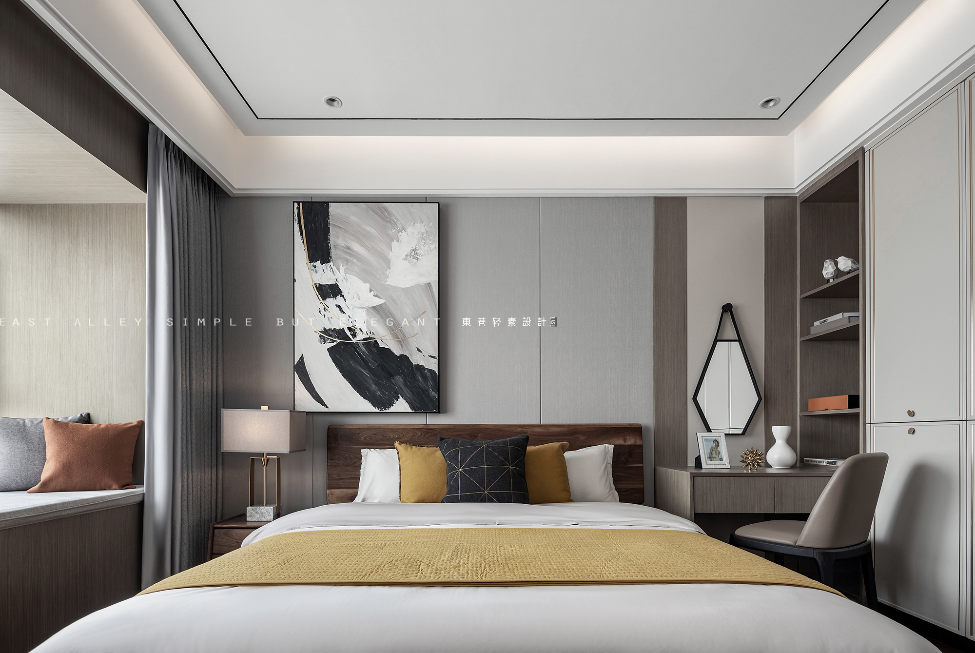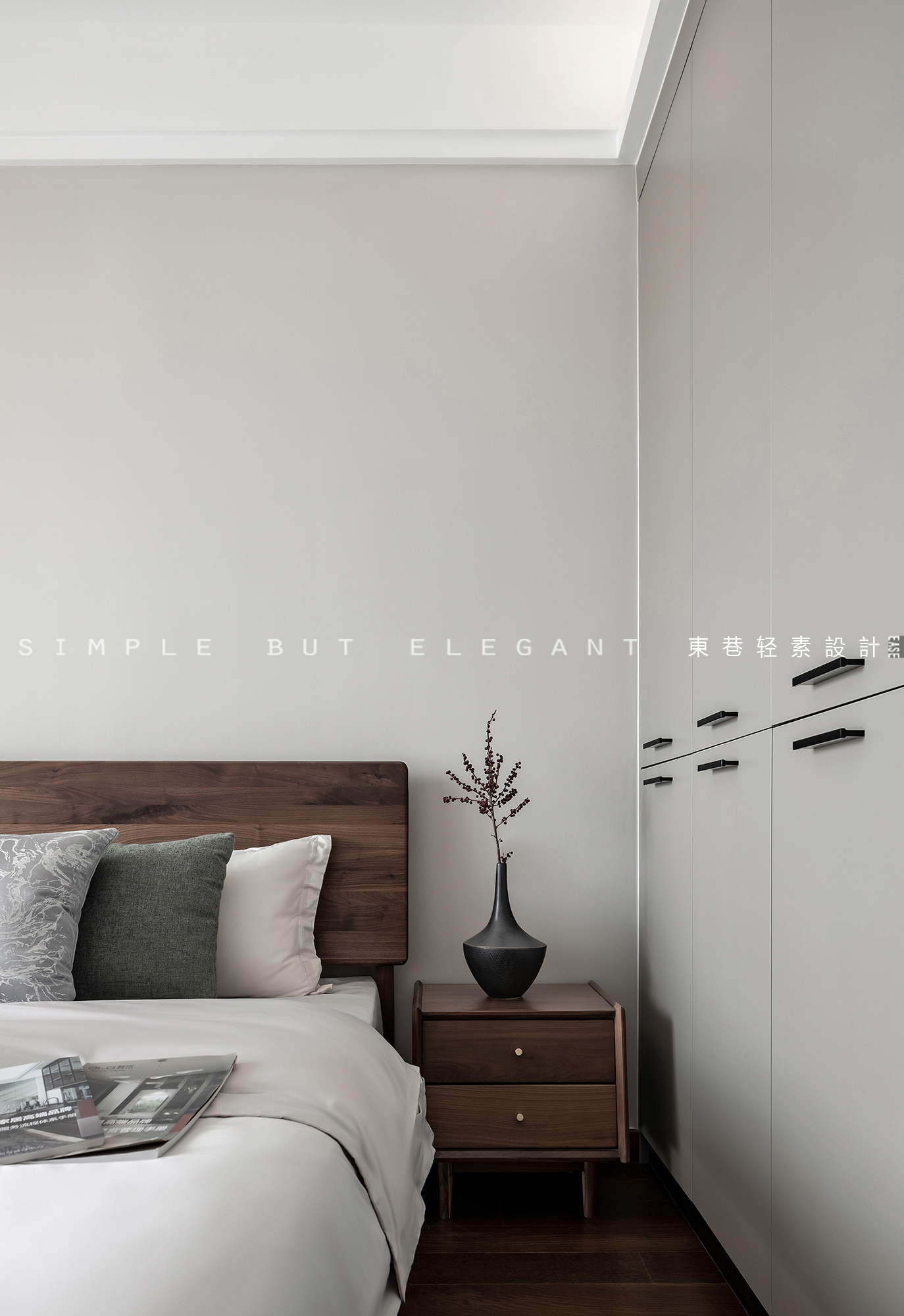 朴拙的基调在线条的规整下生出别具一格的艺术感;“上善若水任方圆”中式美学里图形的含蓄和韵味被我们放大,糅合隐现生活的温度。主卧以一幅抽象挂画徐徐展开,浅色木饰面为基调,搭配富有自然木质感的深色床具,碰撞出富有人文气息且具现代质感的诗韵。