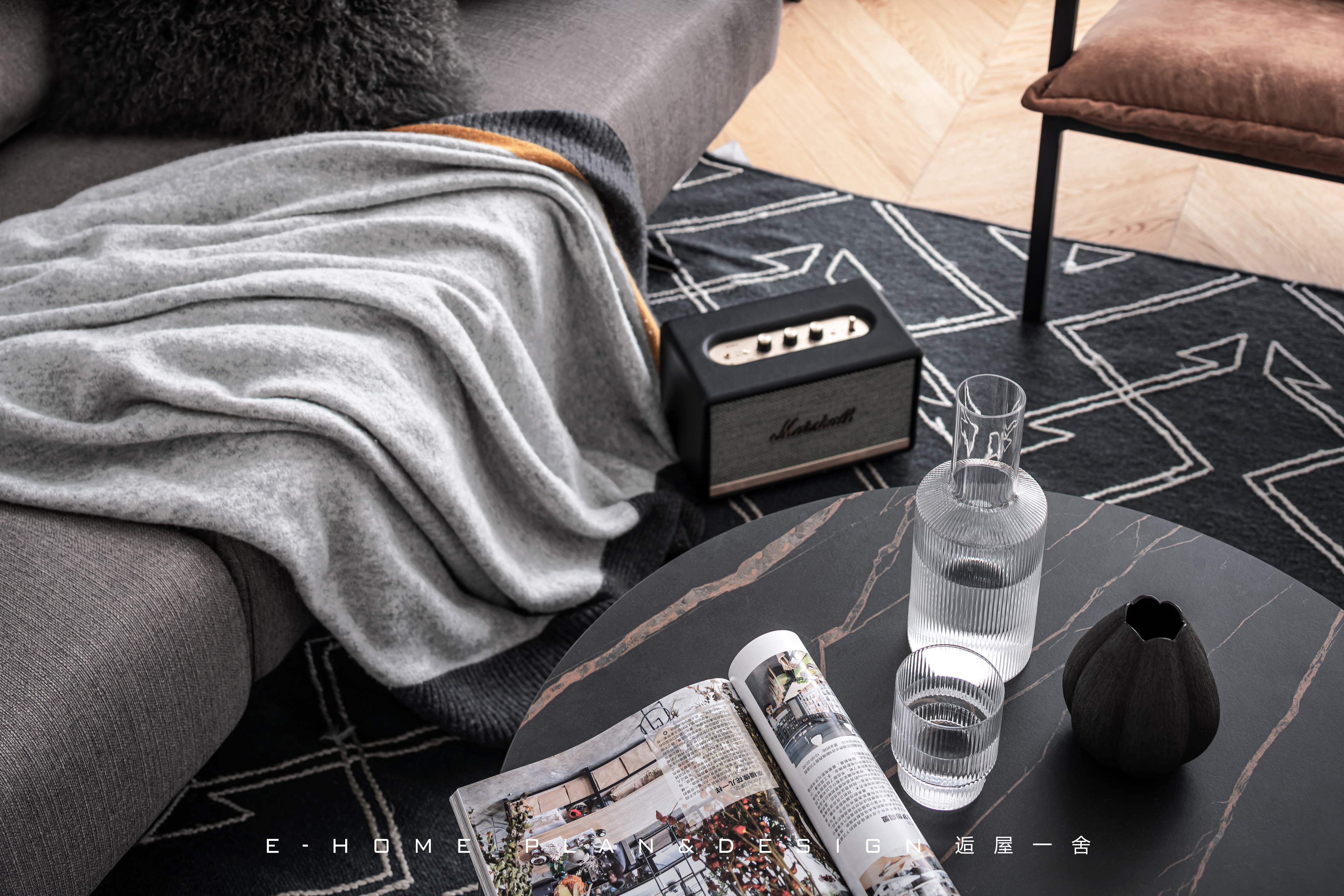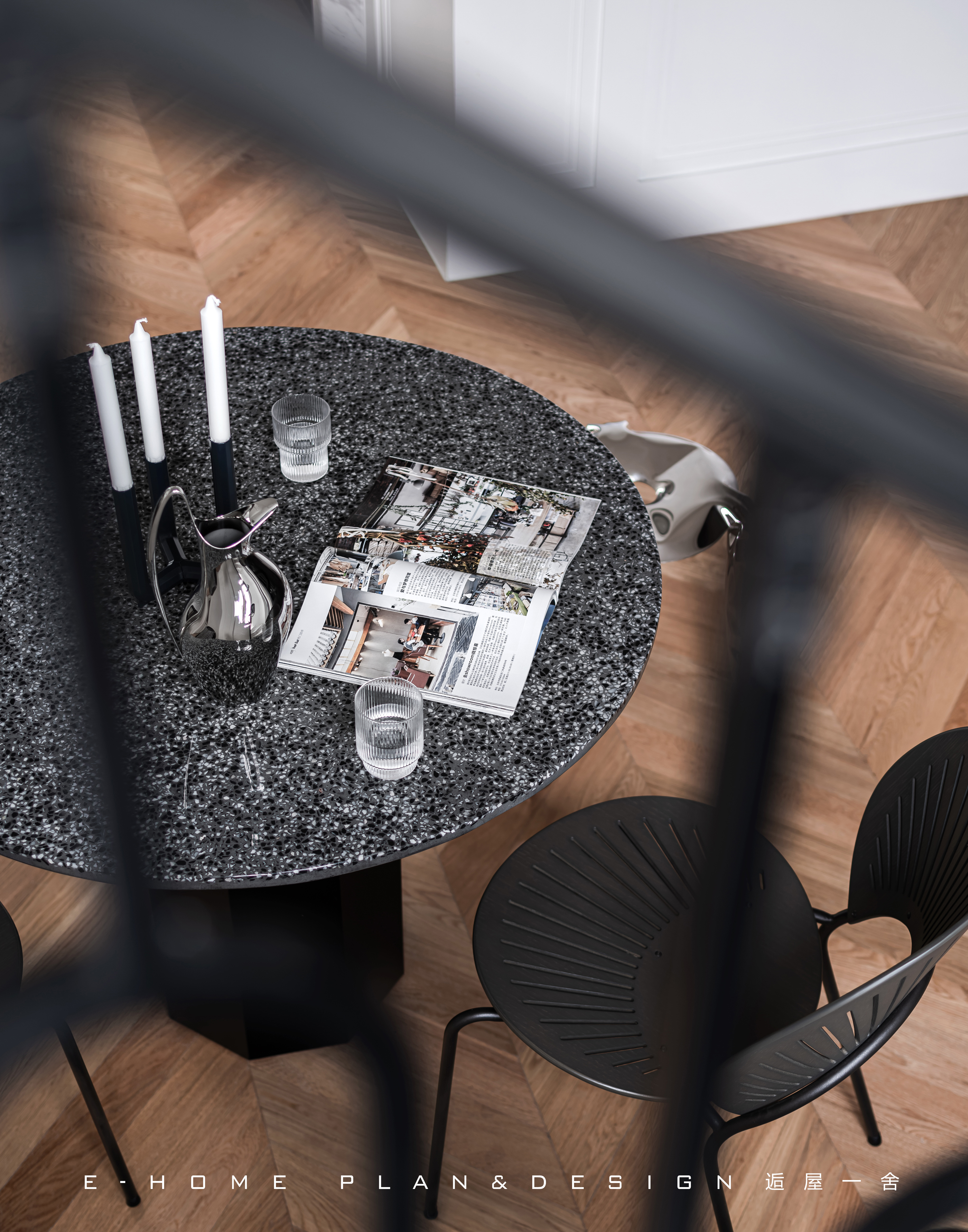 一张圆桌落在楼梯旁、在走廊上,连接客厅,又丝毫不觉得别扭。黑色在这里不仅有沉静的作用,也微微冒出灯火可亲的温暖。