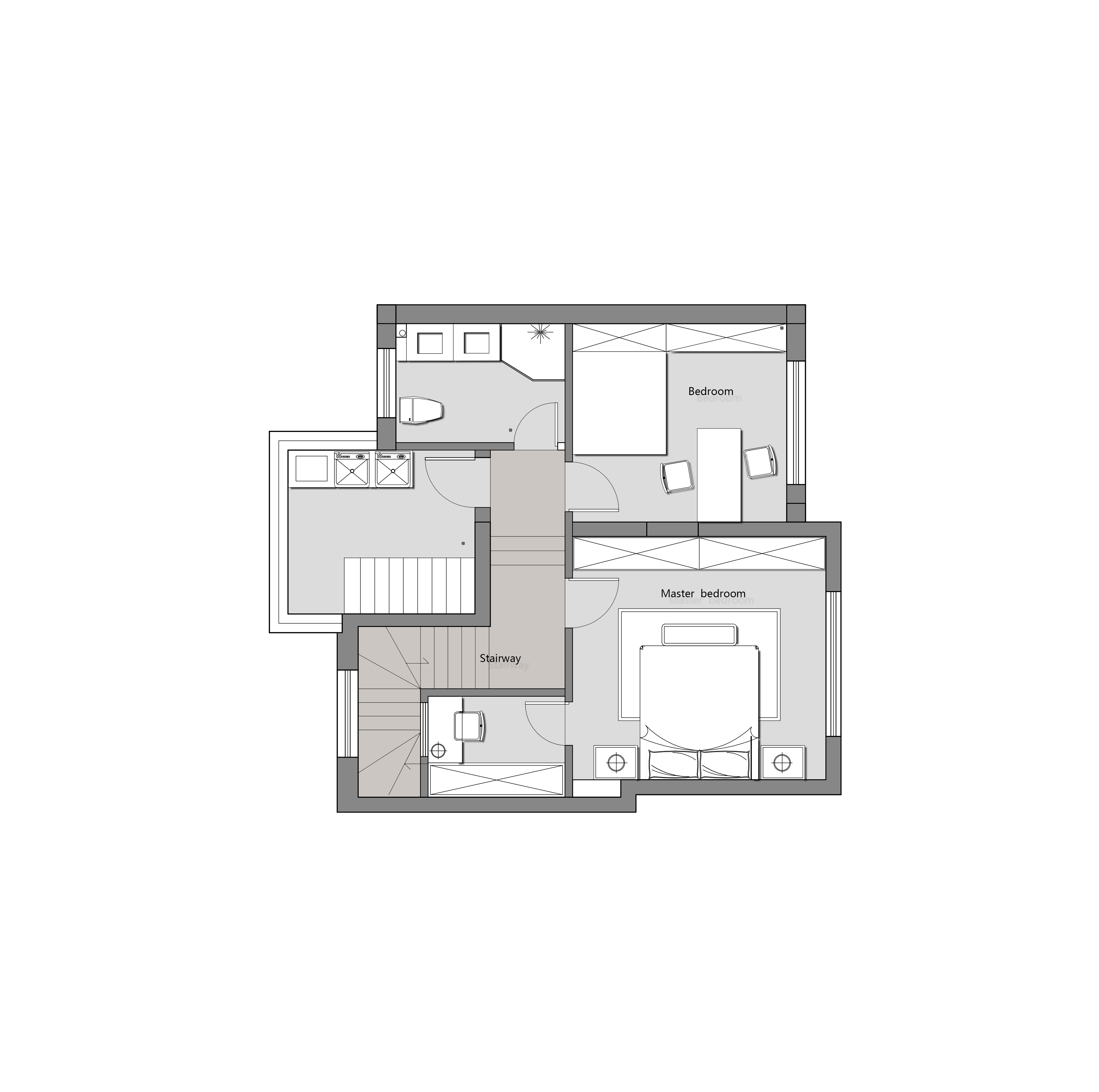 空间布局:上下楼层高调整为一致的2.7m高,原楼梯的拐角挑空位置,使用悬挑楼板进行浇筑,使其成为二楼主卧室的独立化妆间。