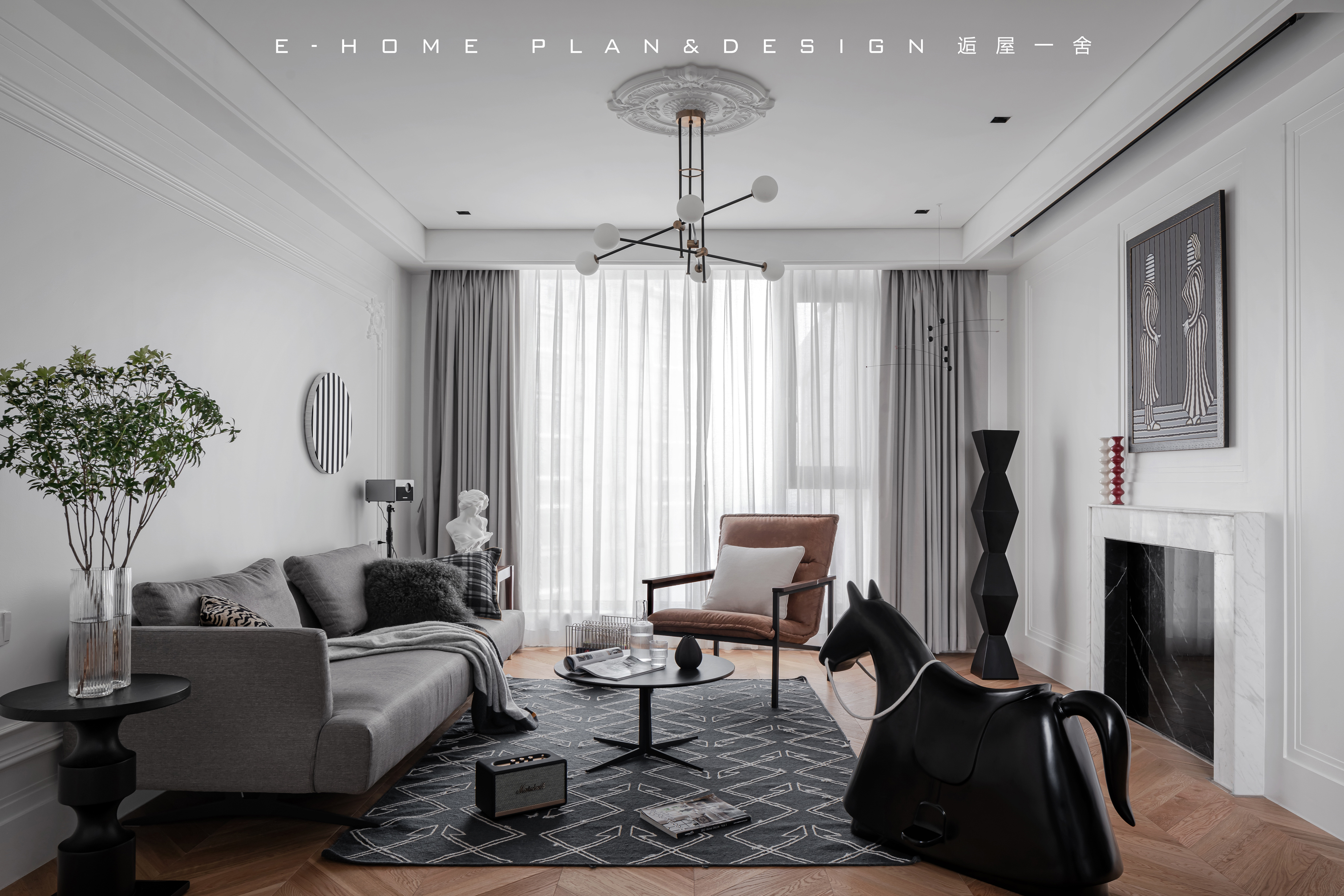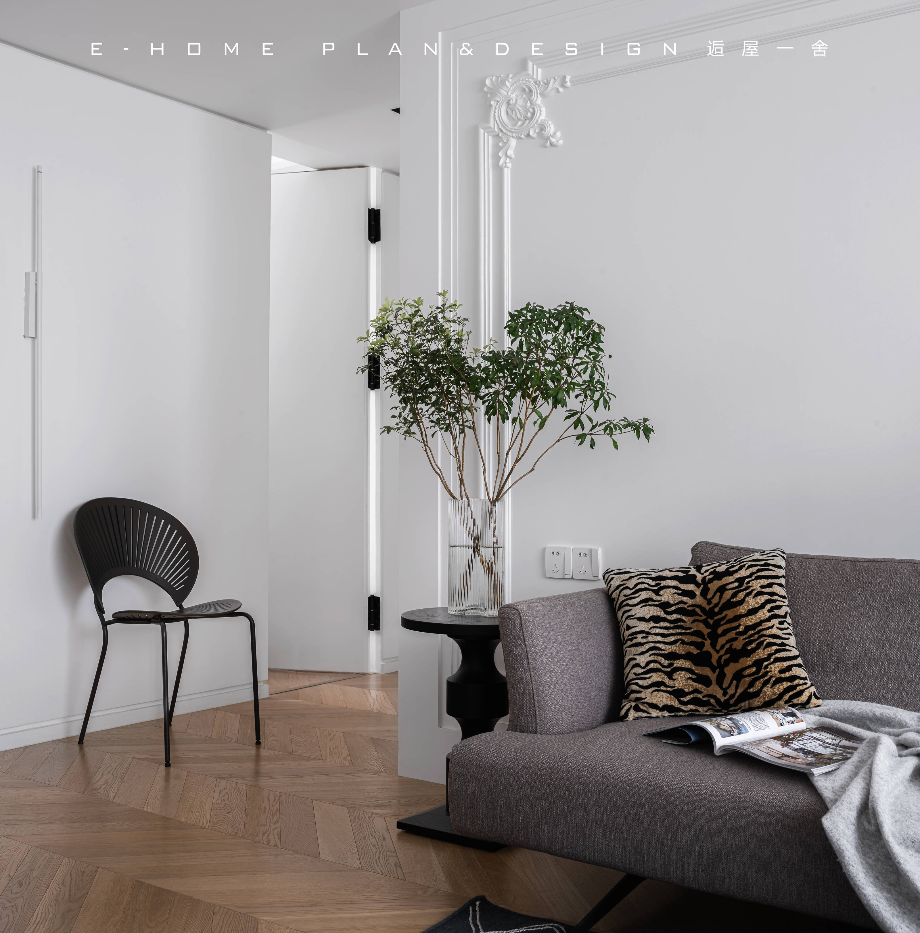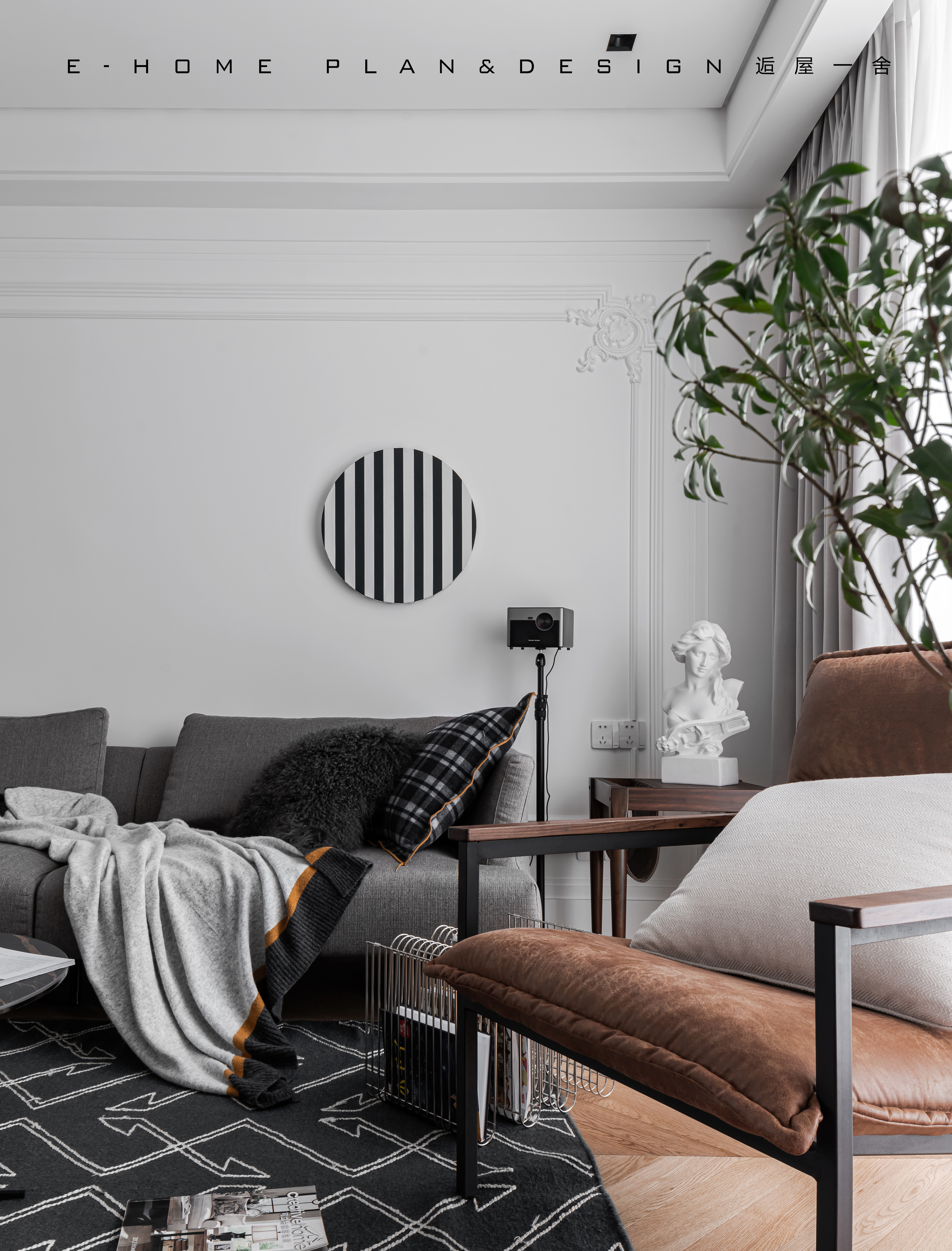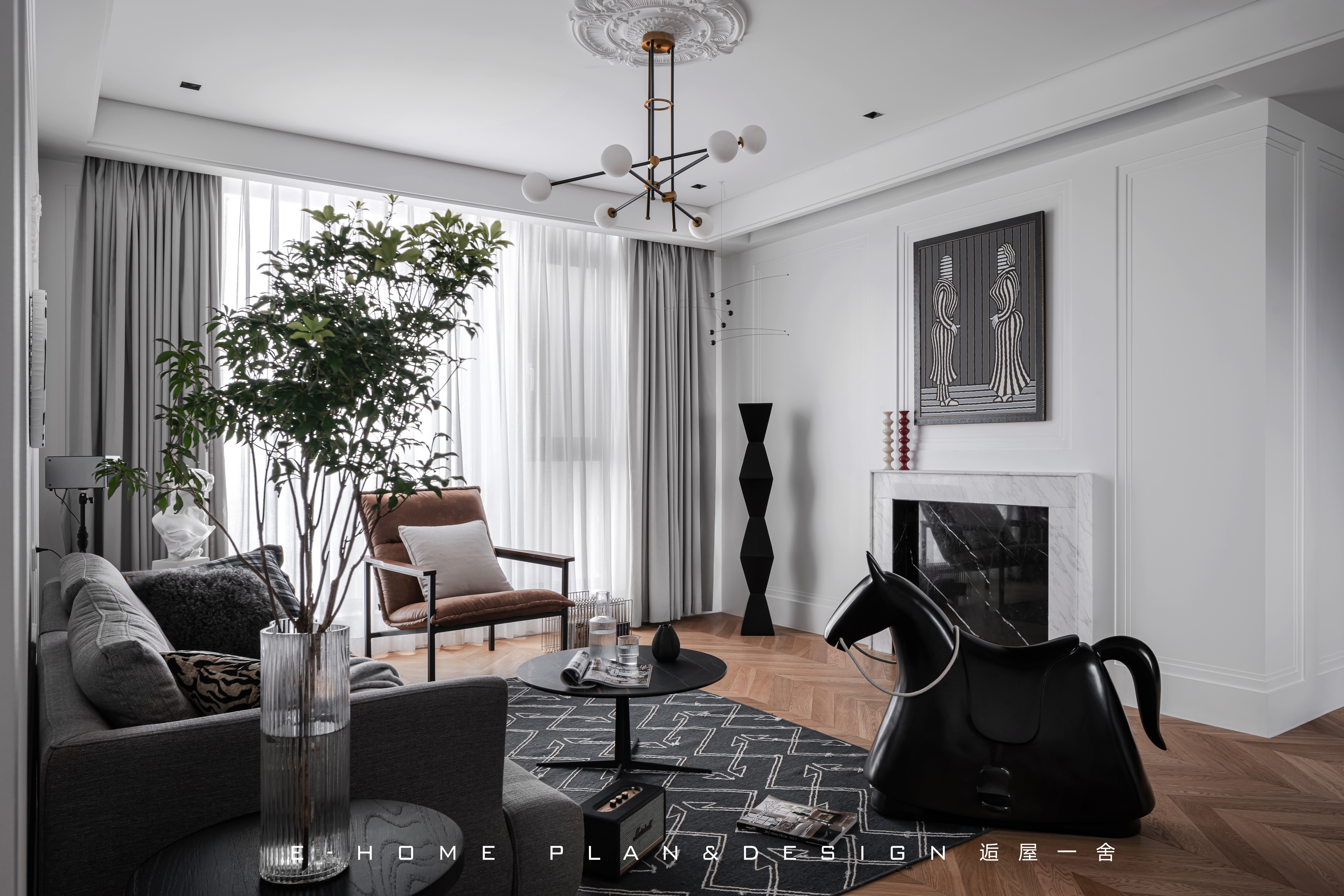 在墙面做出几个浅浅的层次,雕花顺势拉开,复古的意味刚出,棕灰色沙发和几何图案的地毯,让整个氛围稍稍走向当代的生活。