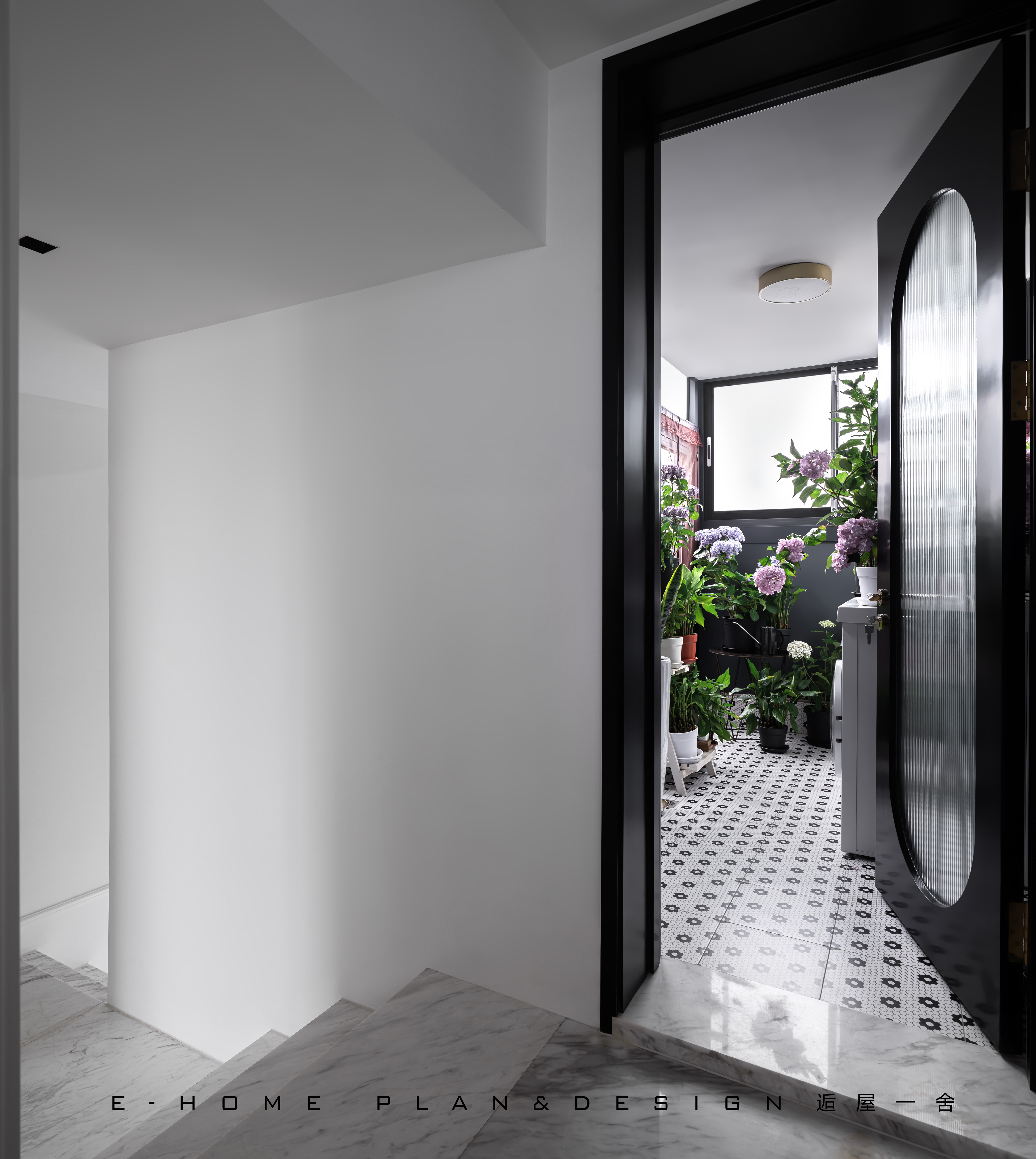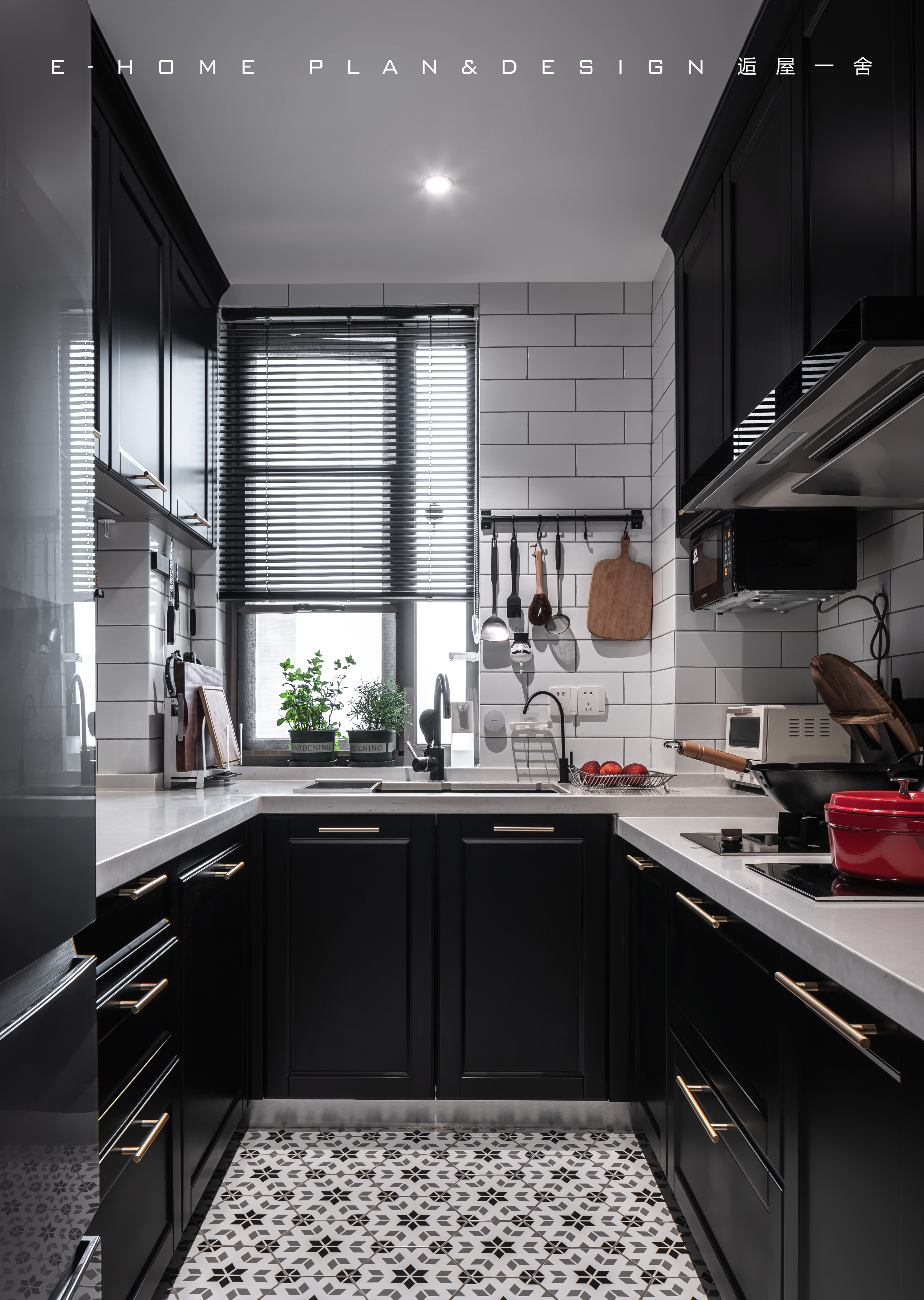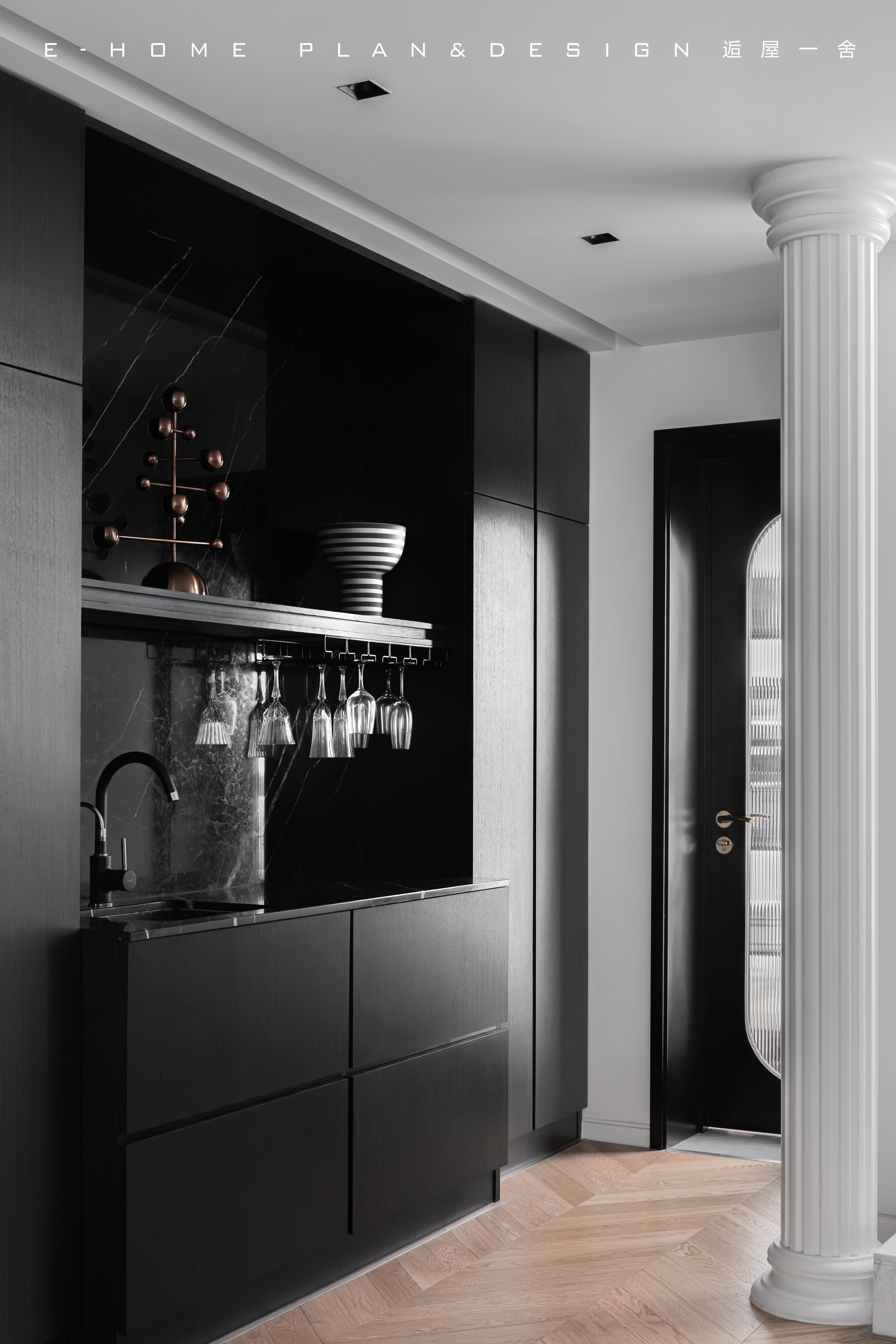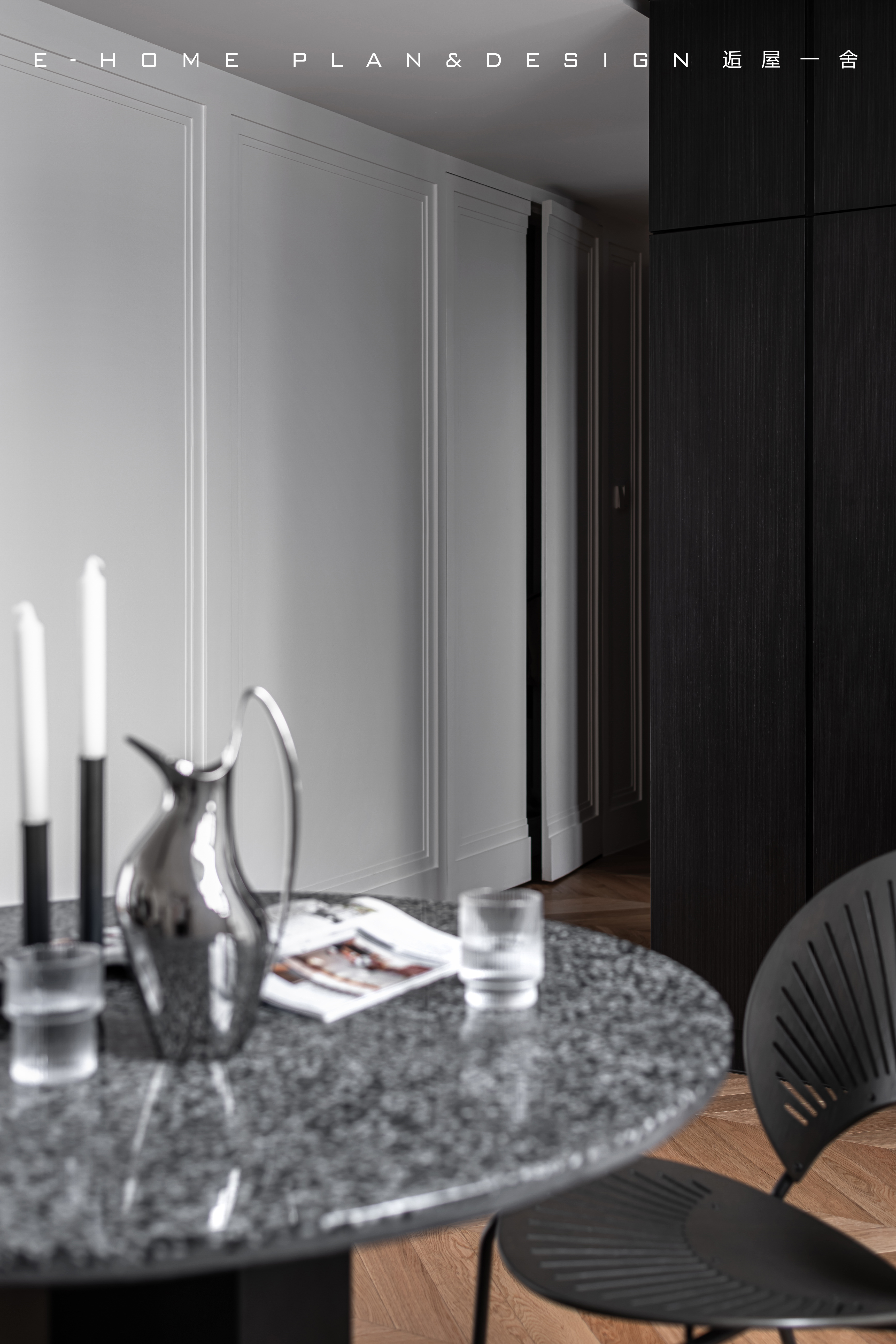 B面从内向外看,一排黑色的餐边柜连接厨房和玄关,形成开阔的餐厅区域。