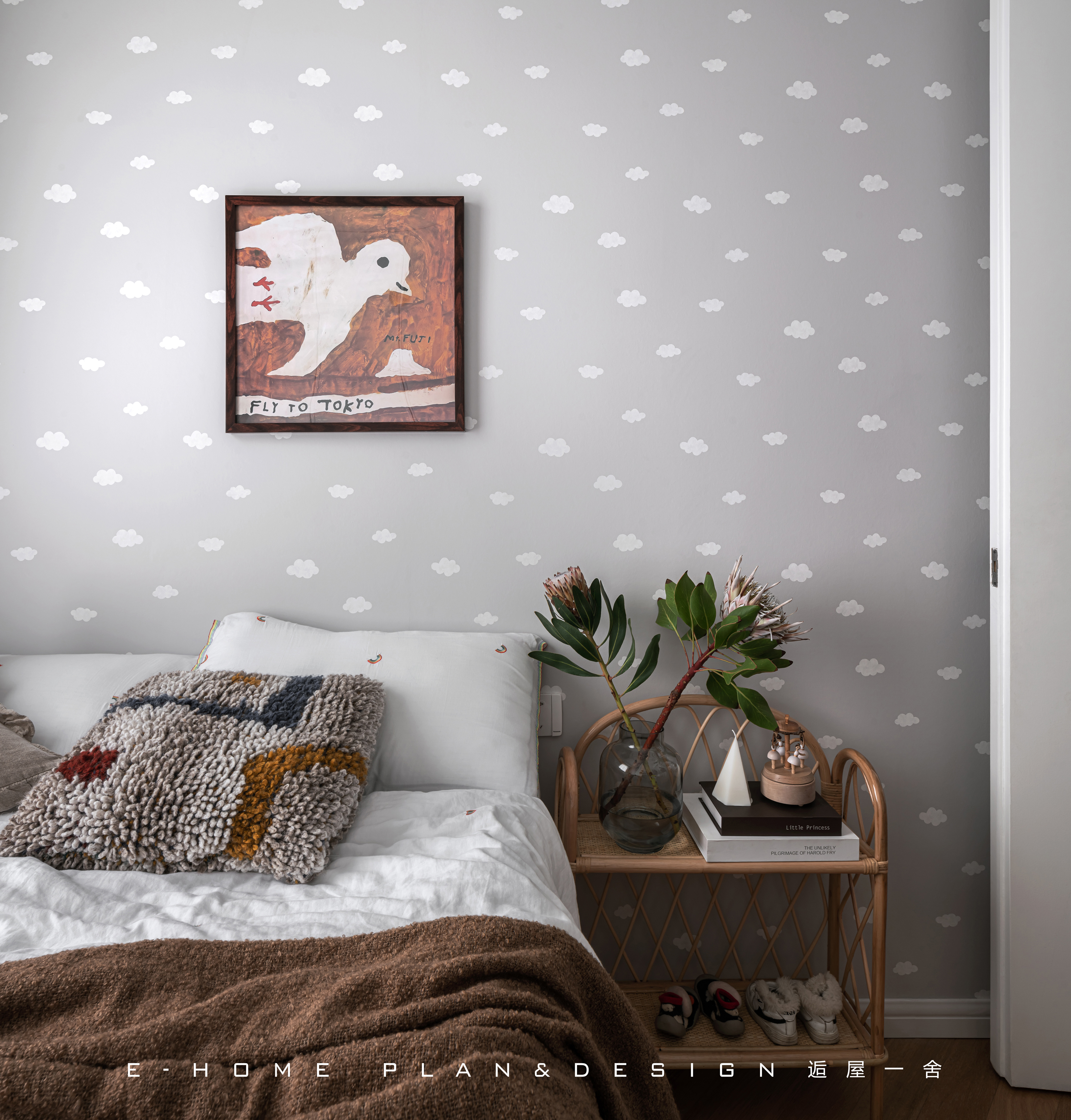 把一个迷你的“鞋架”拿来做床头柜,妙。藤编材料让这里透气、自然。 床头是平静的一片天空,小云朵在,小鸟在。为你,一个世界都诞生。