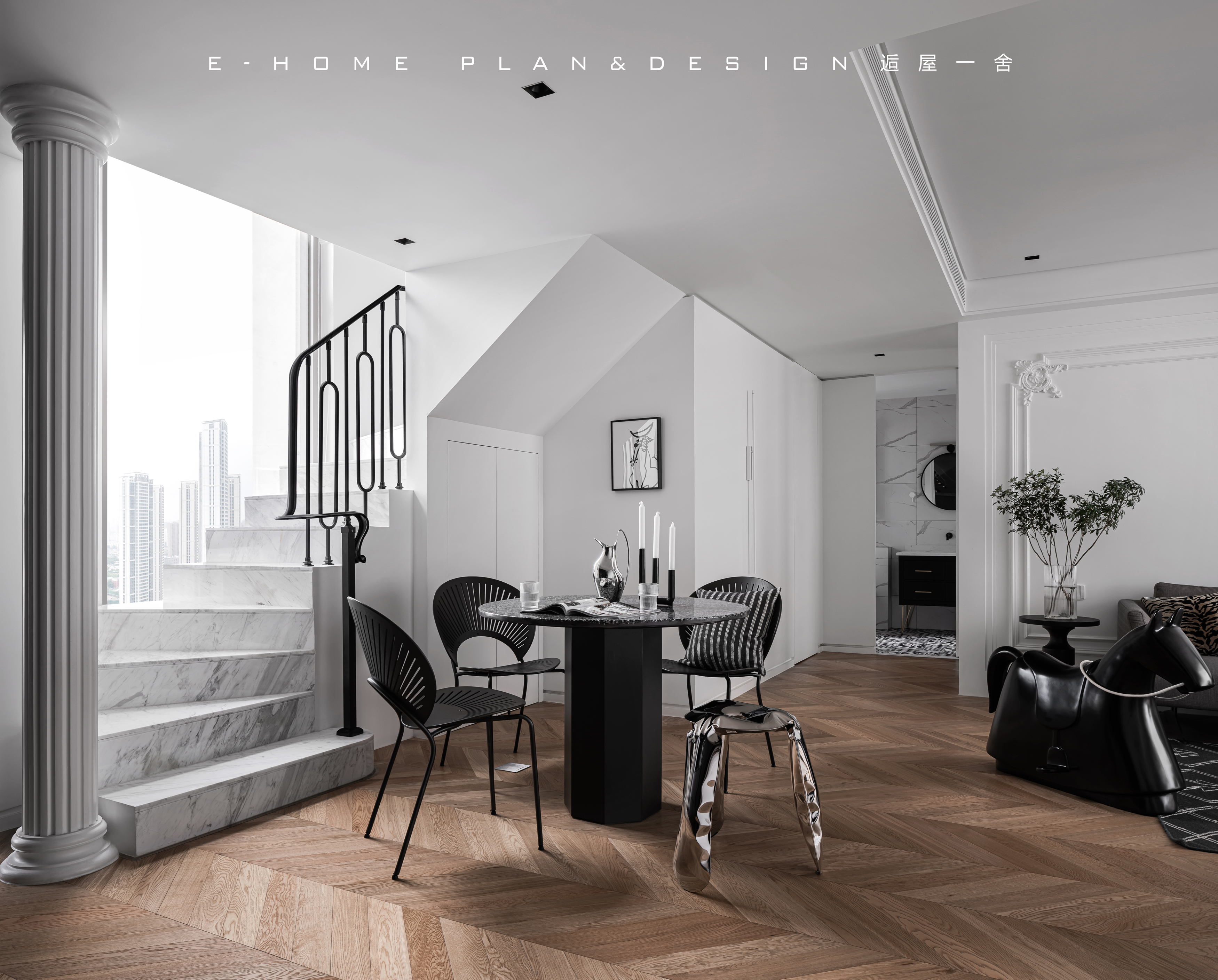 A面穿过玄关望向客餐厅像是看到一位绅士和公主的约会场面。异国风情的立柱牵引出楼梯背景,踏实浪漫。 底部采用隐形门进行封闭,一个不易察觉的小杂物间出现。