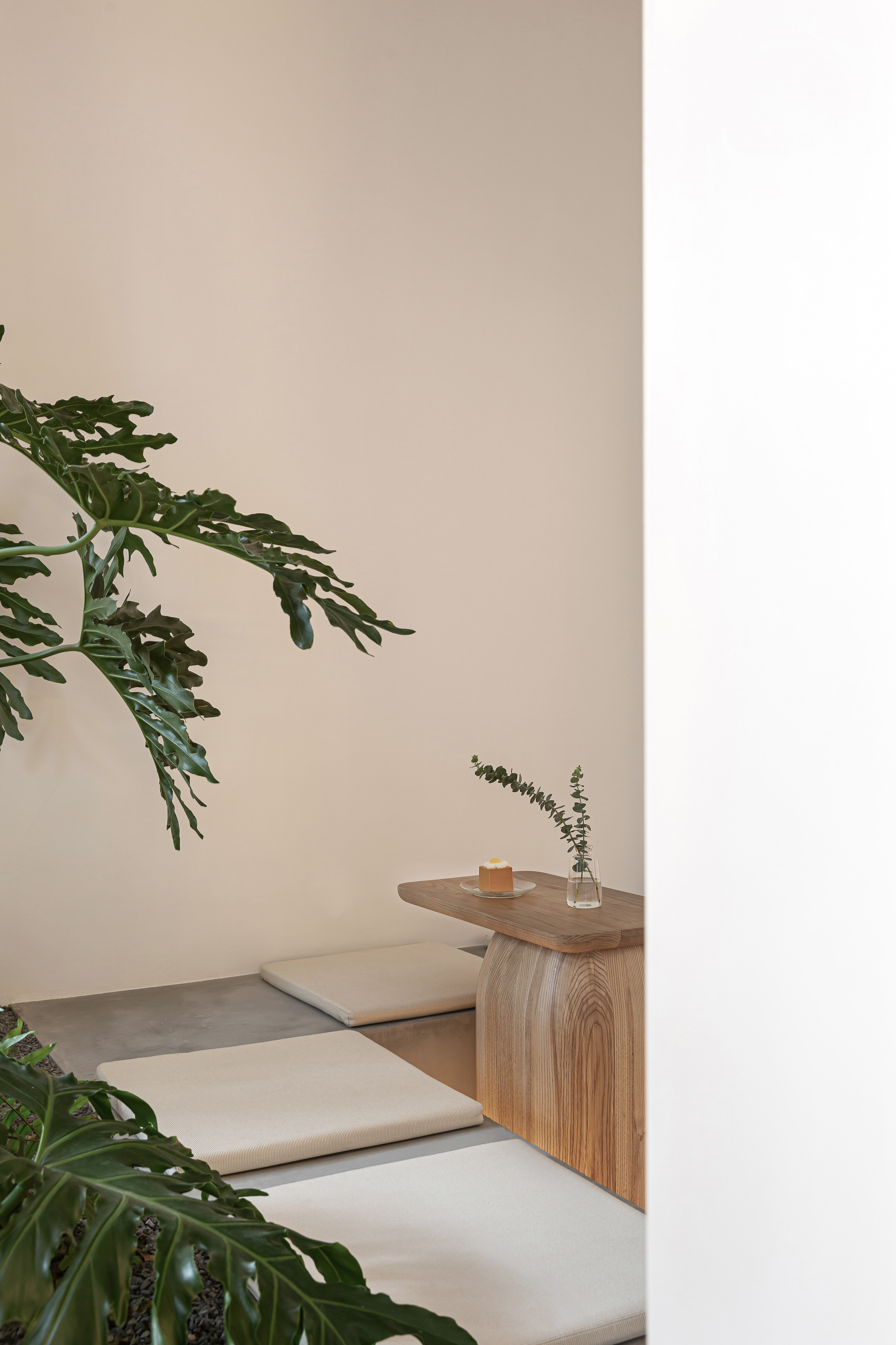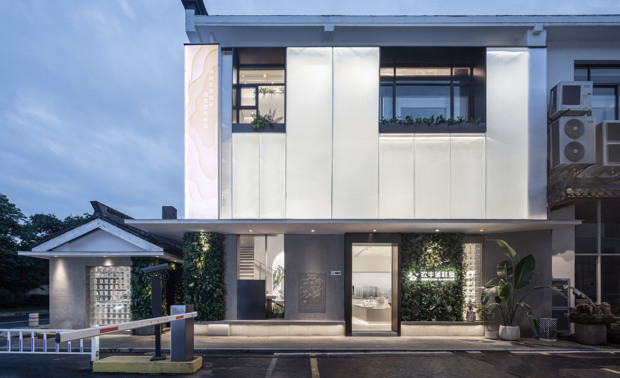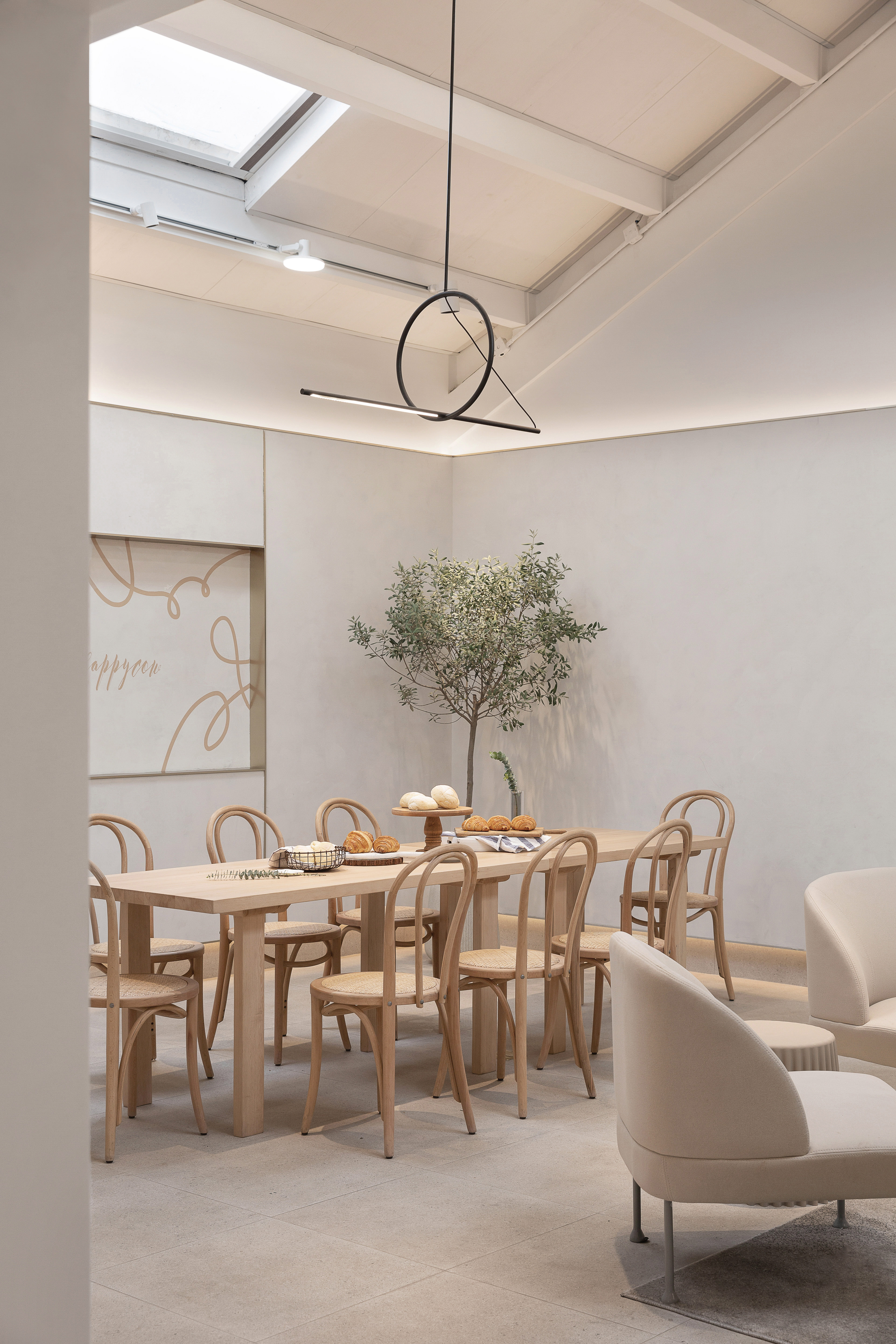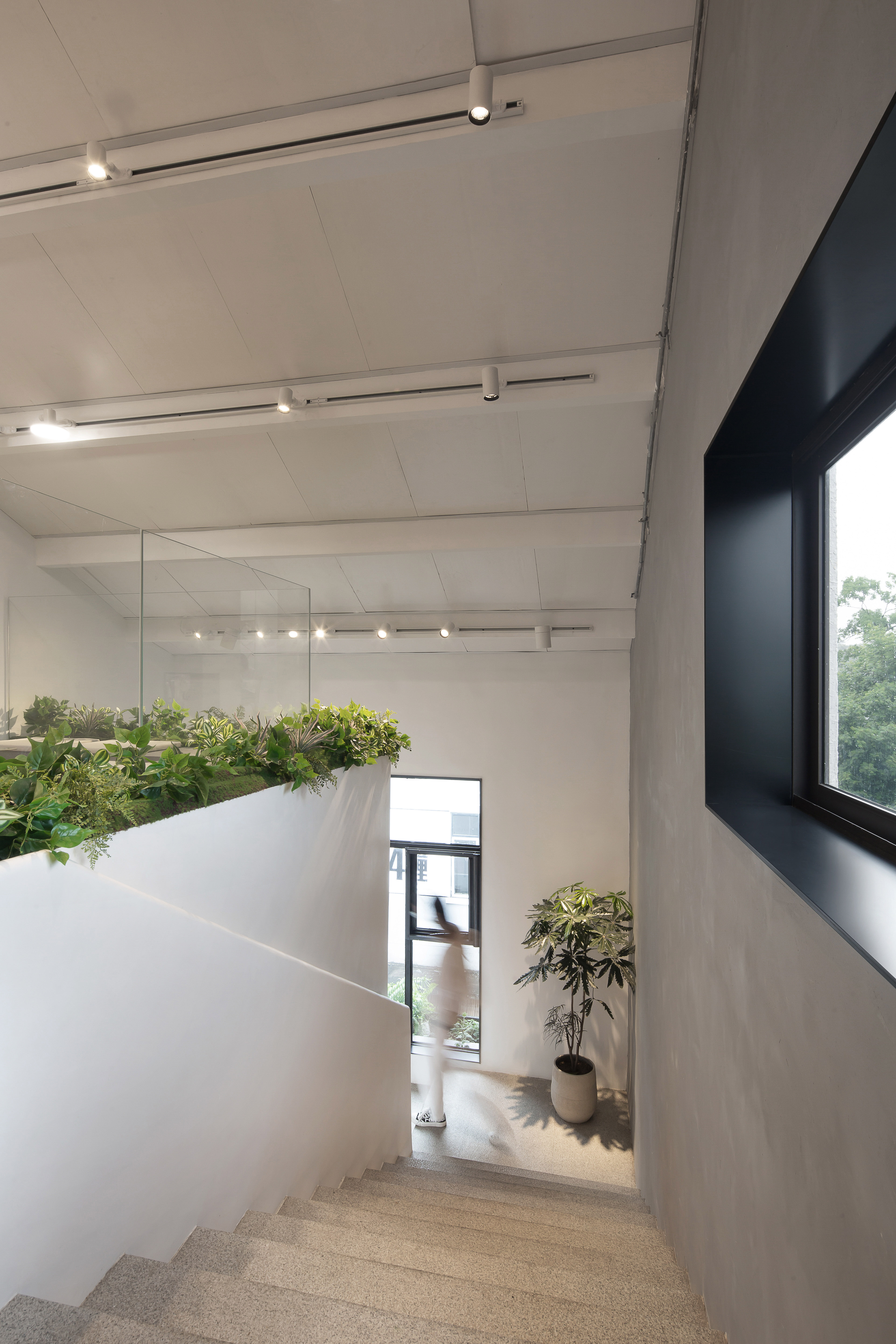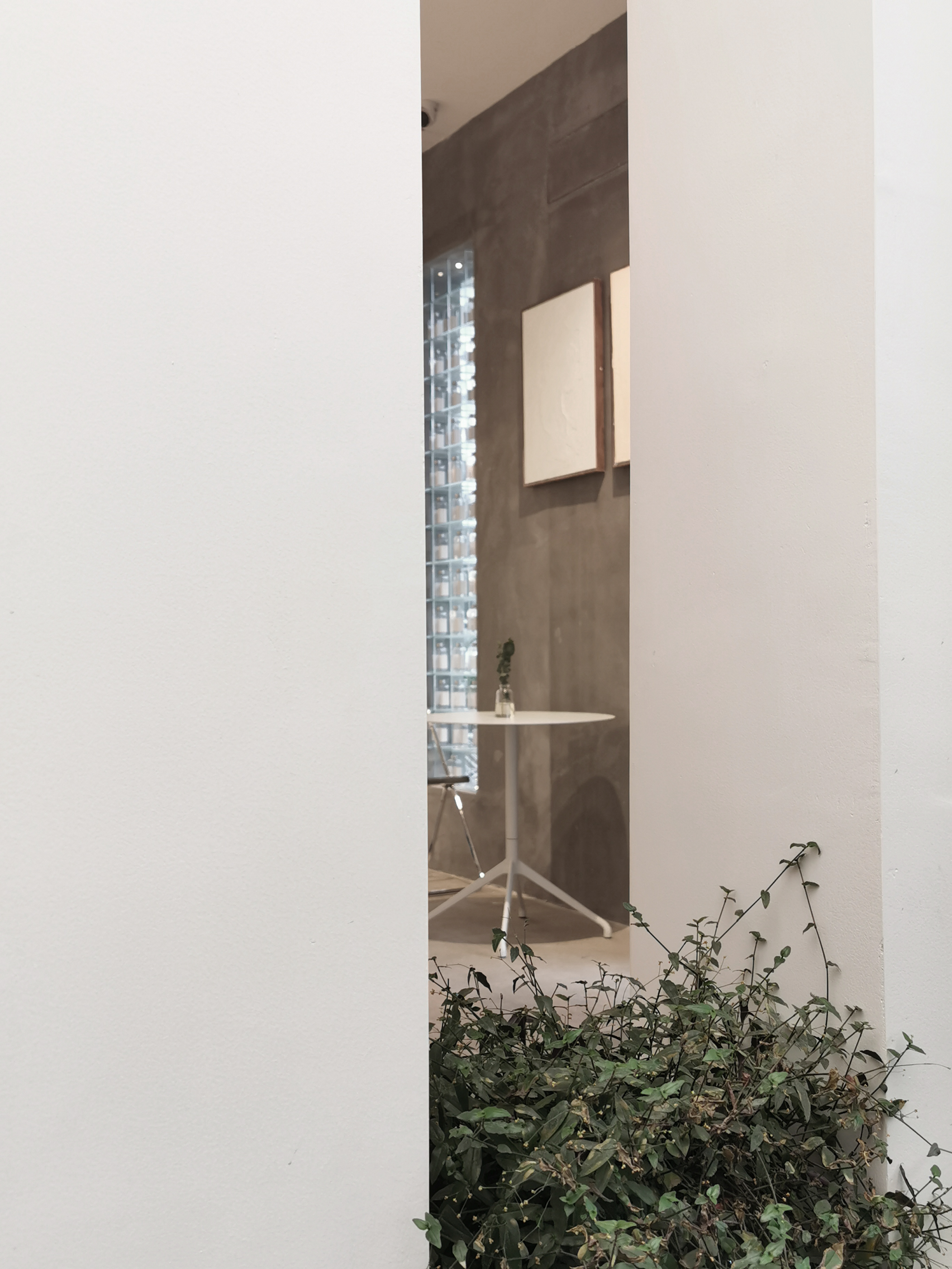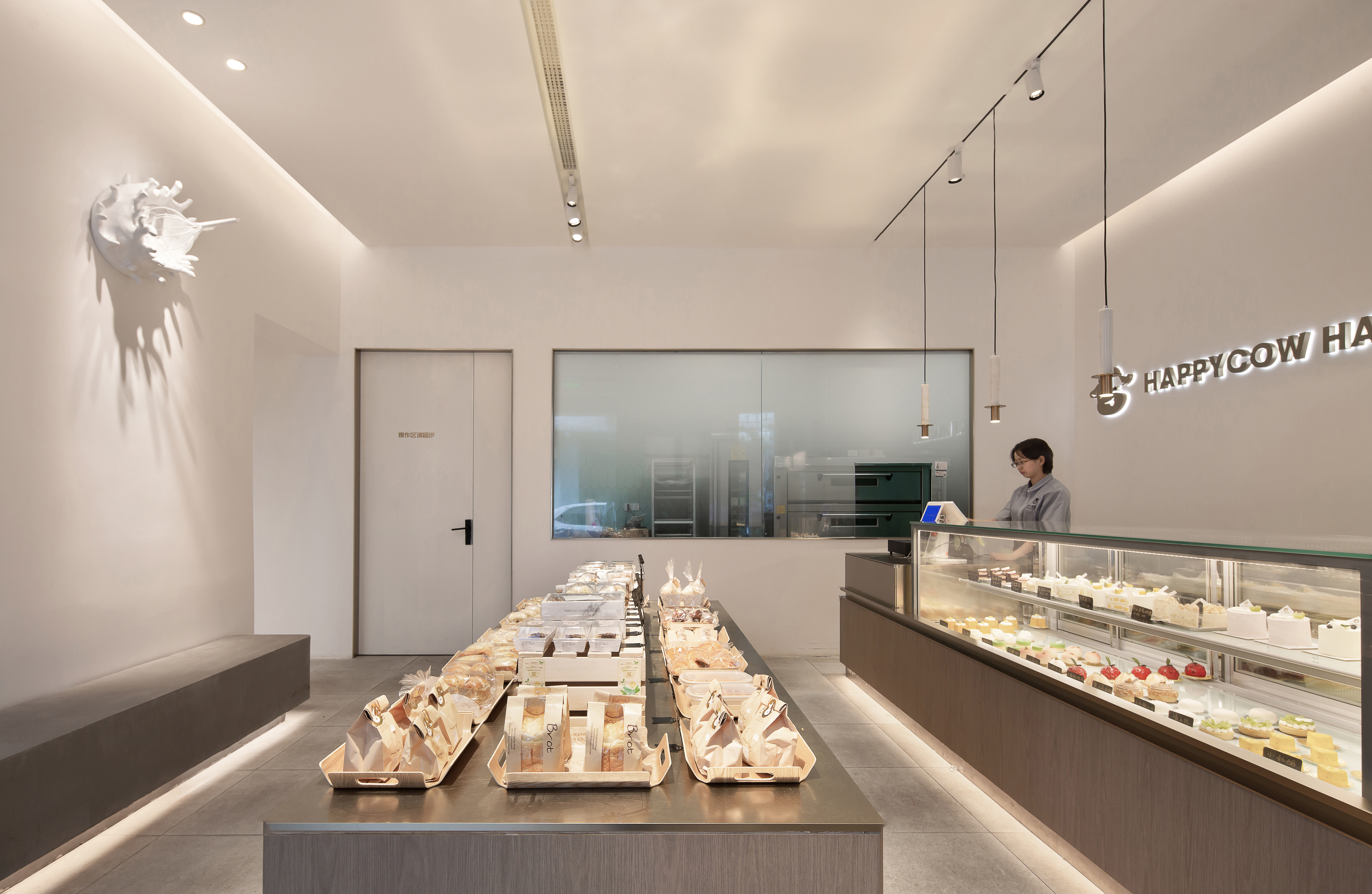 我们去现场勘测发现原厂房的楼梯、外墙无法拆改,整体的采光,通风,功能,动线都受到了极大的局限。我们经过多次沟通,商讨后确定把三层厂房做了功能规划:一层主零售,二层主工厂,三层主休闲。设置客梯将三层联系互动起来,增设货梯将工厂和零售区紧密对接,提高送餐效率。除此之外,把保安亭改造成水吧亭面朝马路,满足客人饮品需求的同时,巧妙的把行人引导进来选购蛋糕点心。保安厅与主楼结合在一起形成了风雨连廊的灰色空间带,模糊了室内外的空间,让空间变得更加自然,包容。