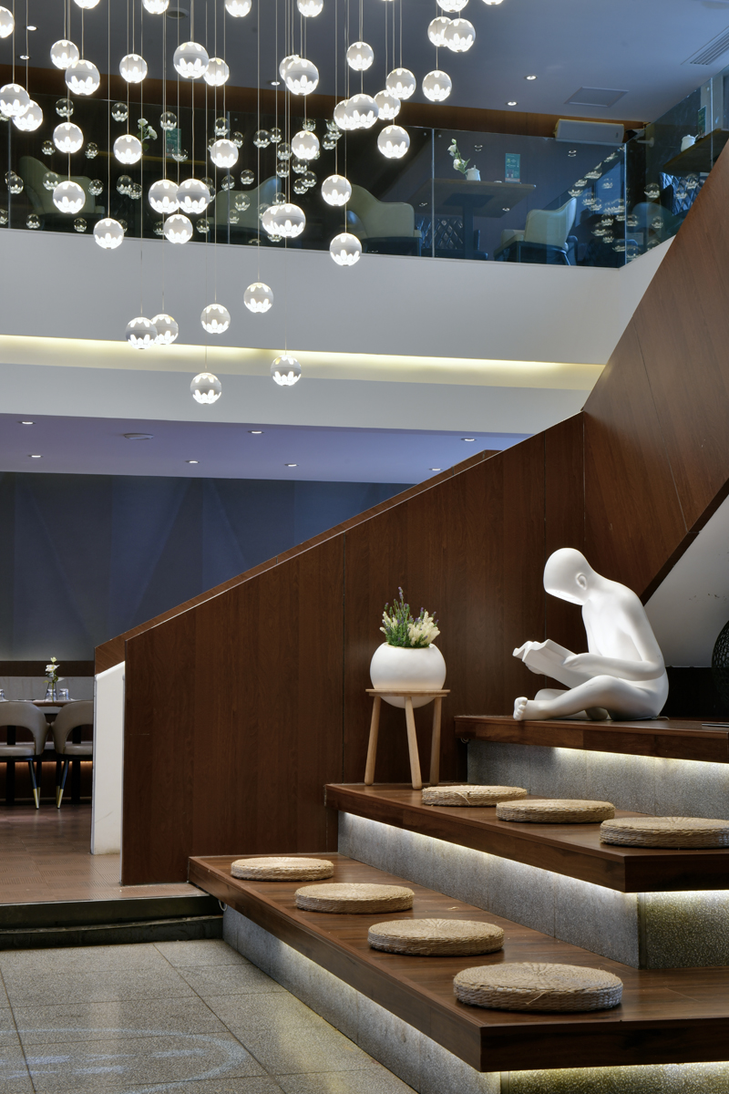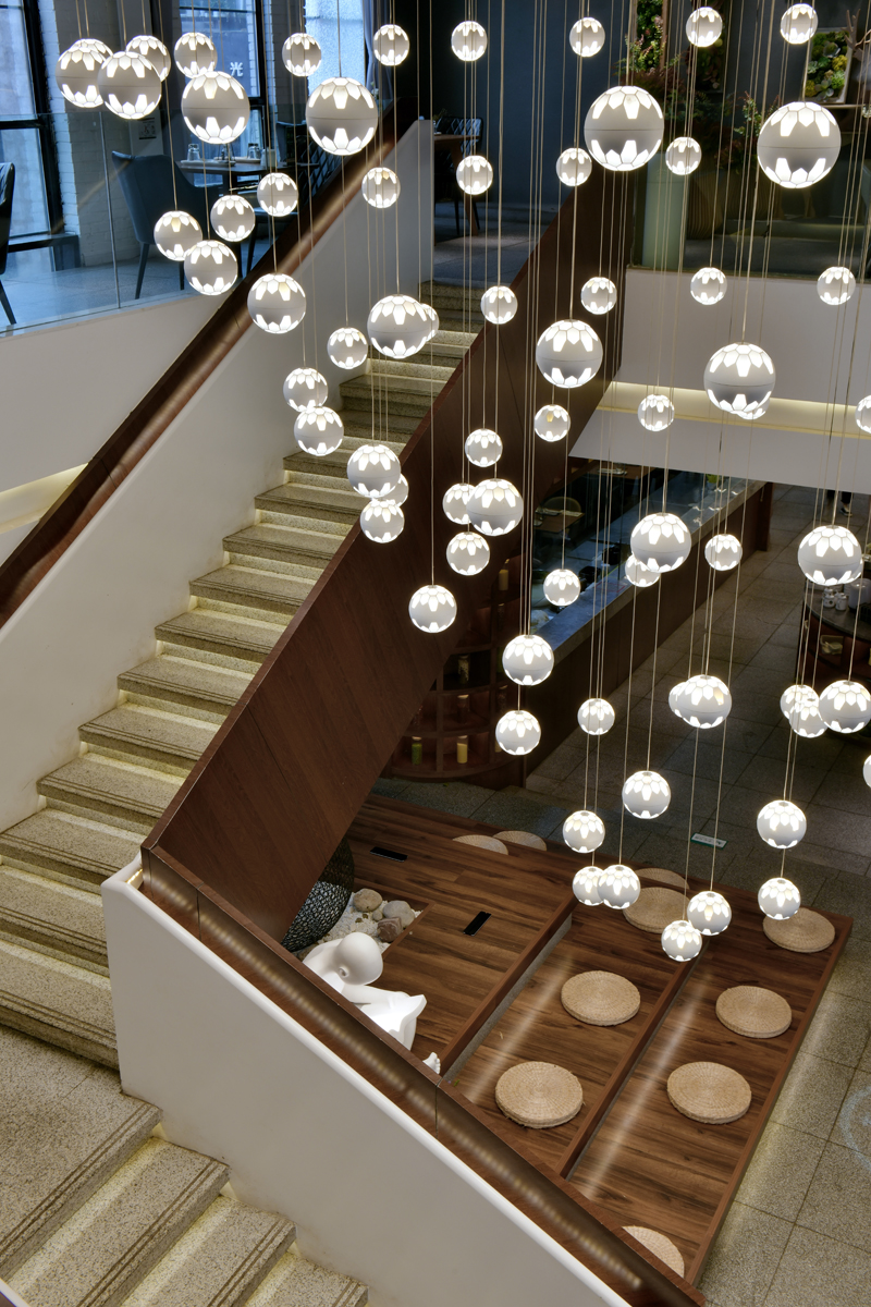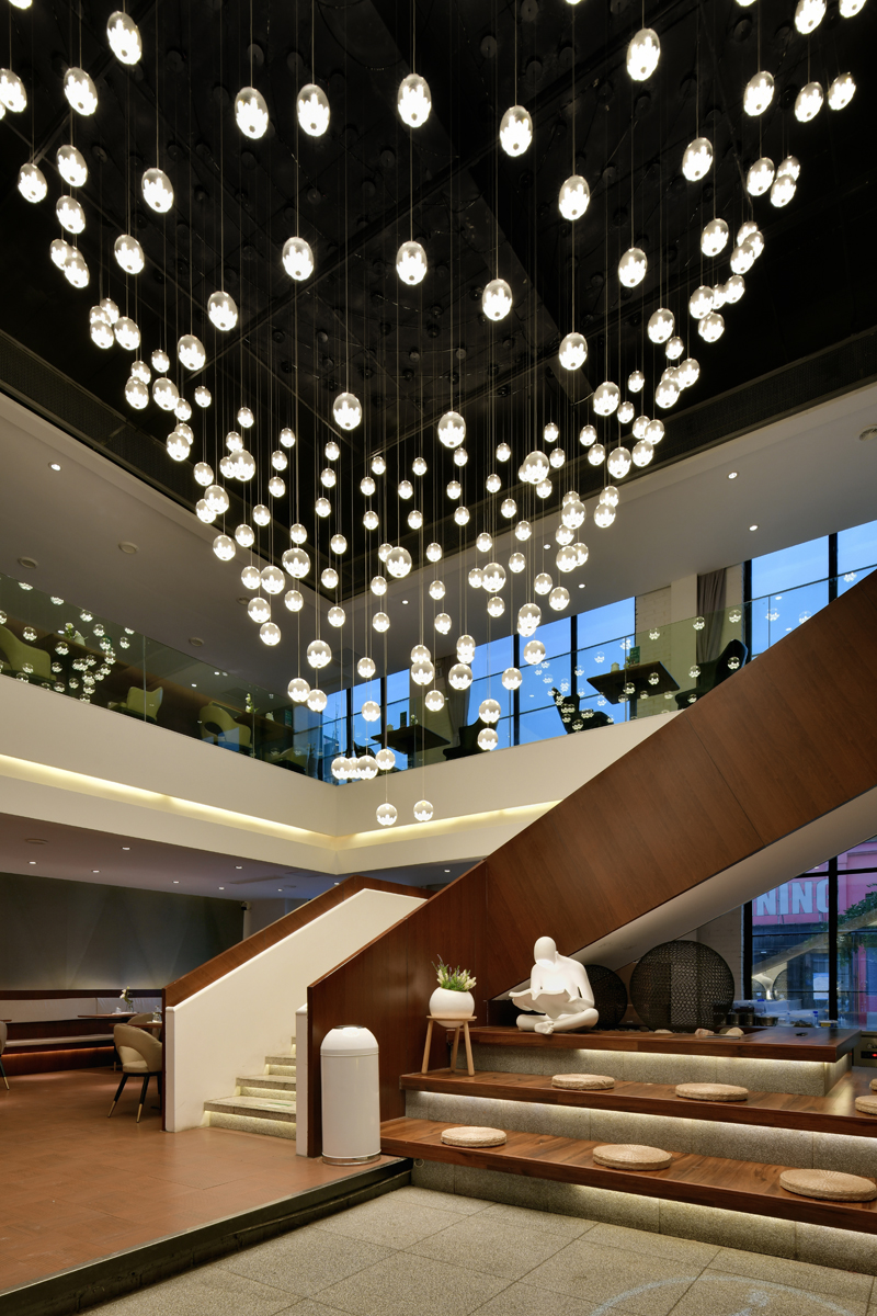 对原有空间上的不足加以修改,挑空的大堂空间使一楼与二楼有了很好的交互,楼梯采用大块面的形式表现,让楼梯在空间中更加出彩。