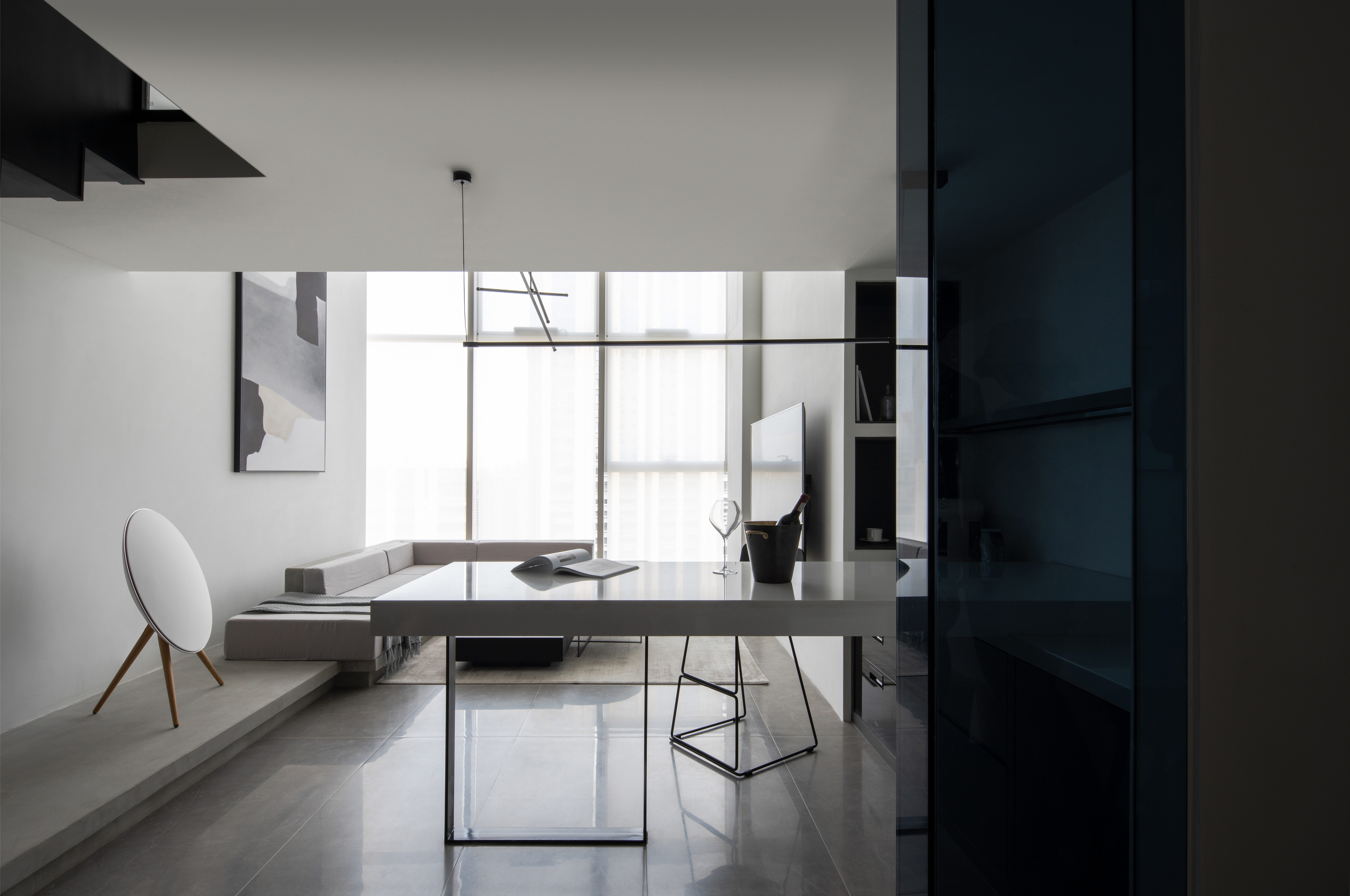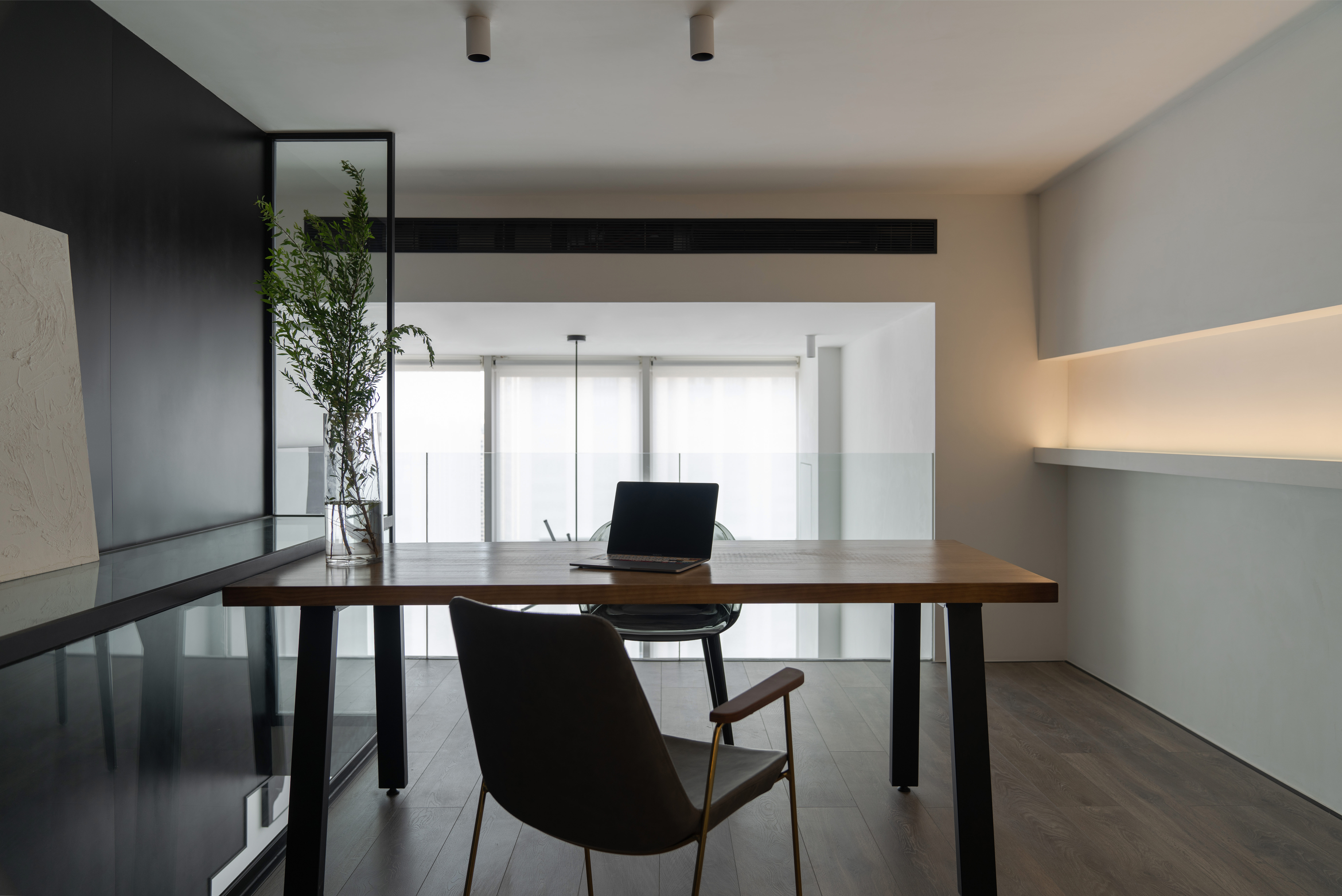 2F为SOHO办公区域,工作台与景观楼梯融为一体,透过楼梯玻璃,形成有趣的透景。