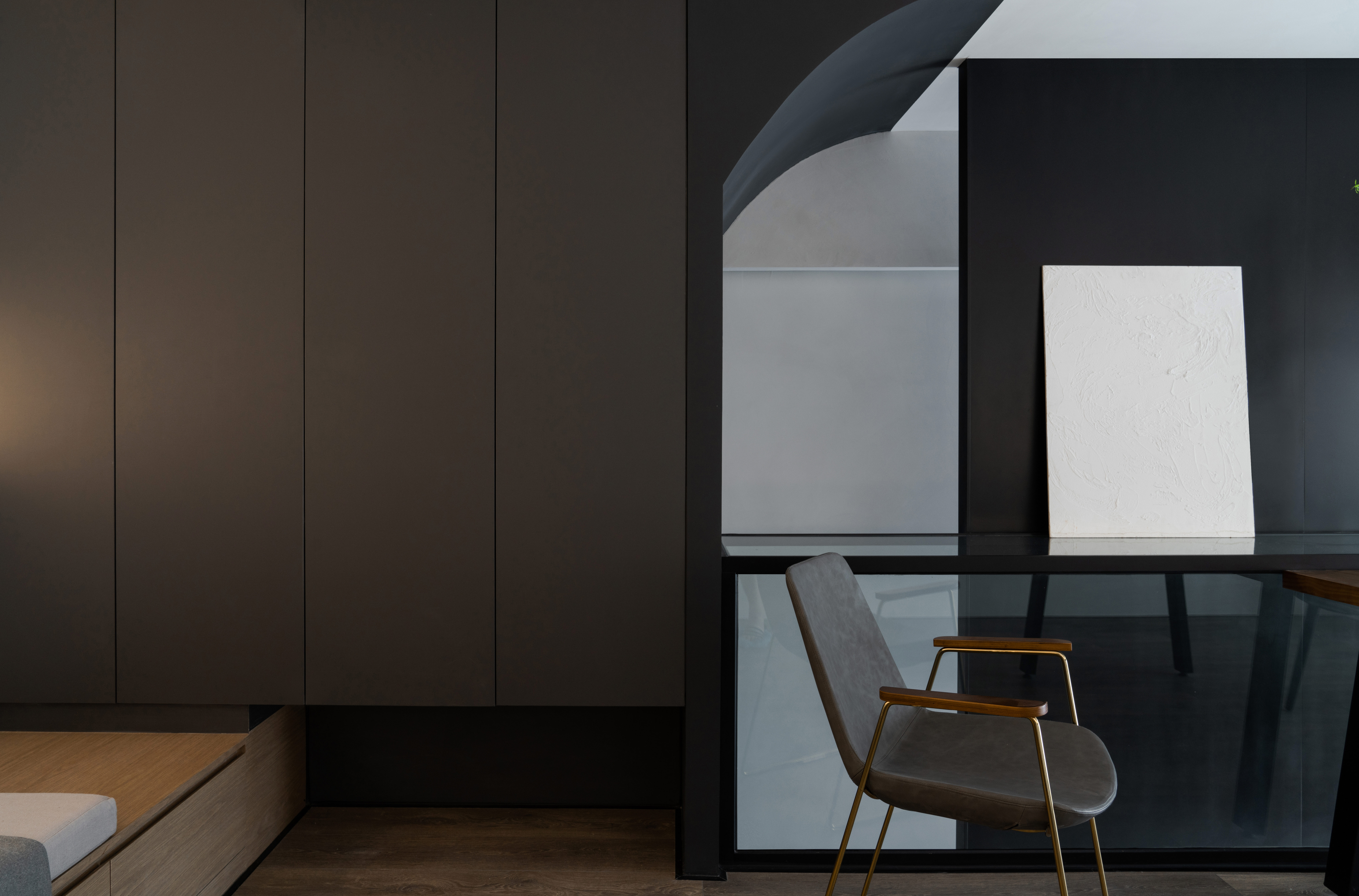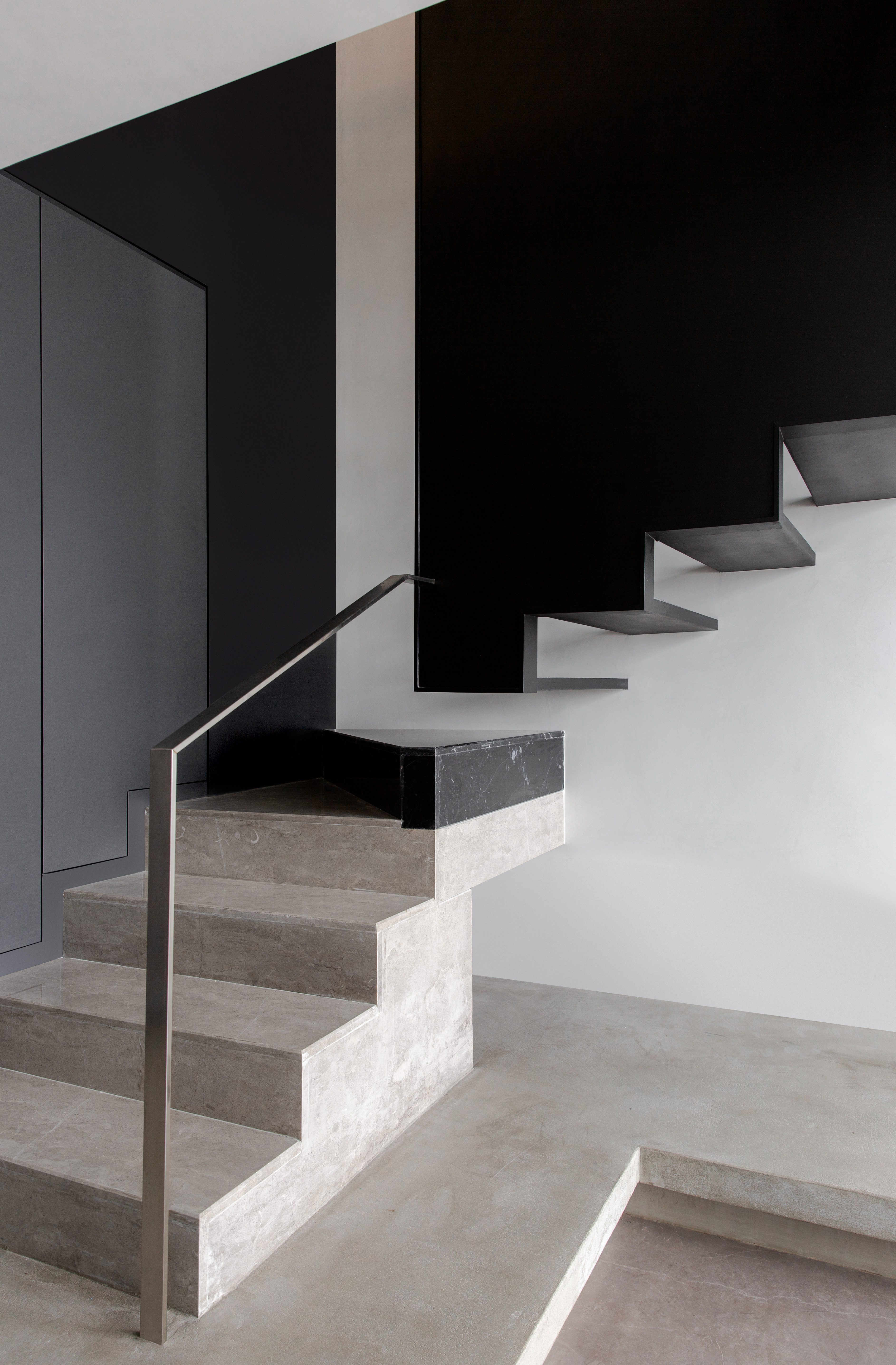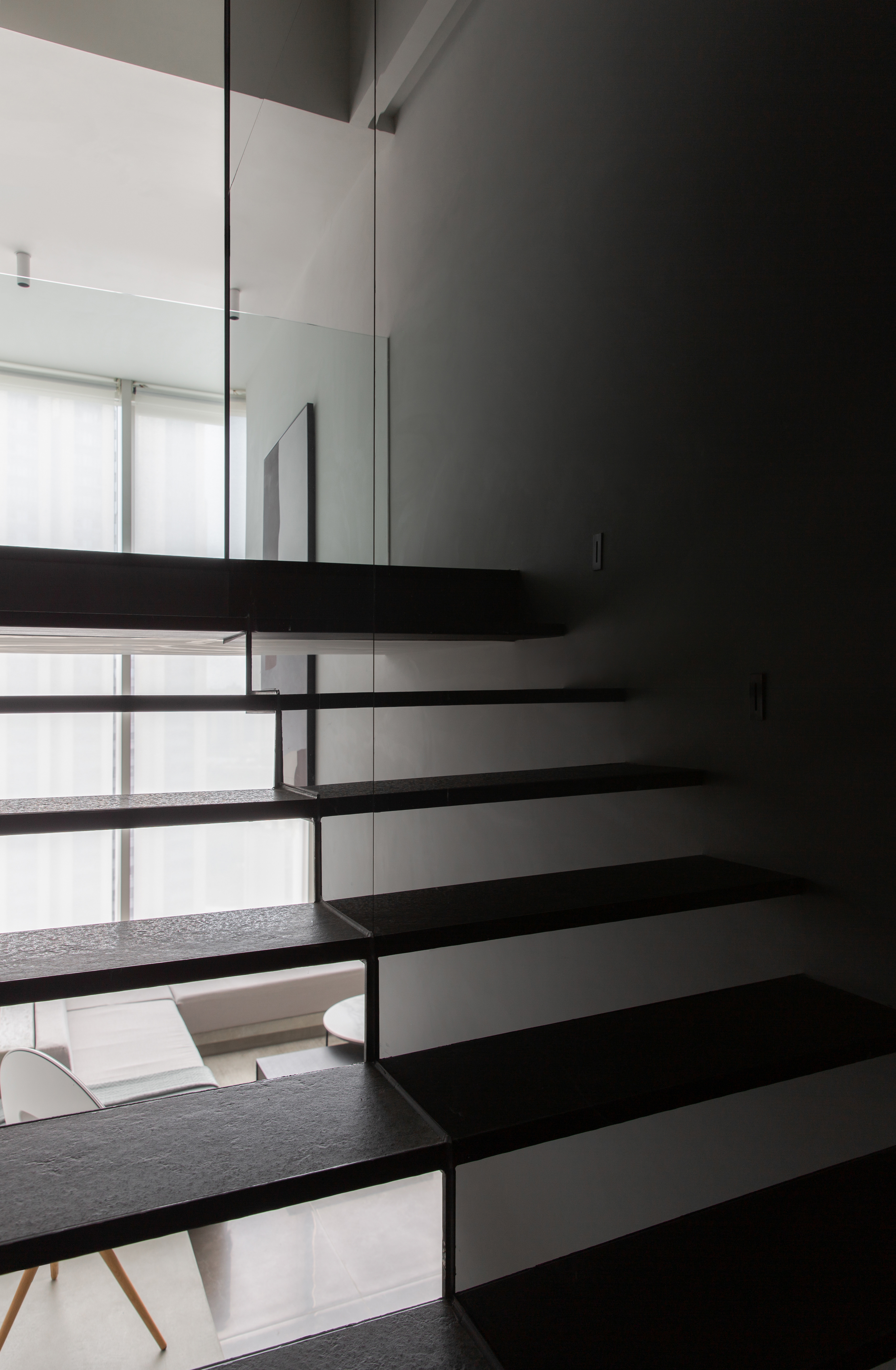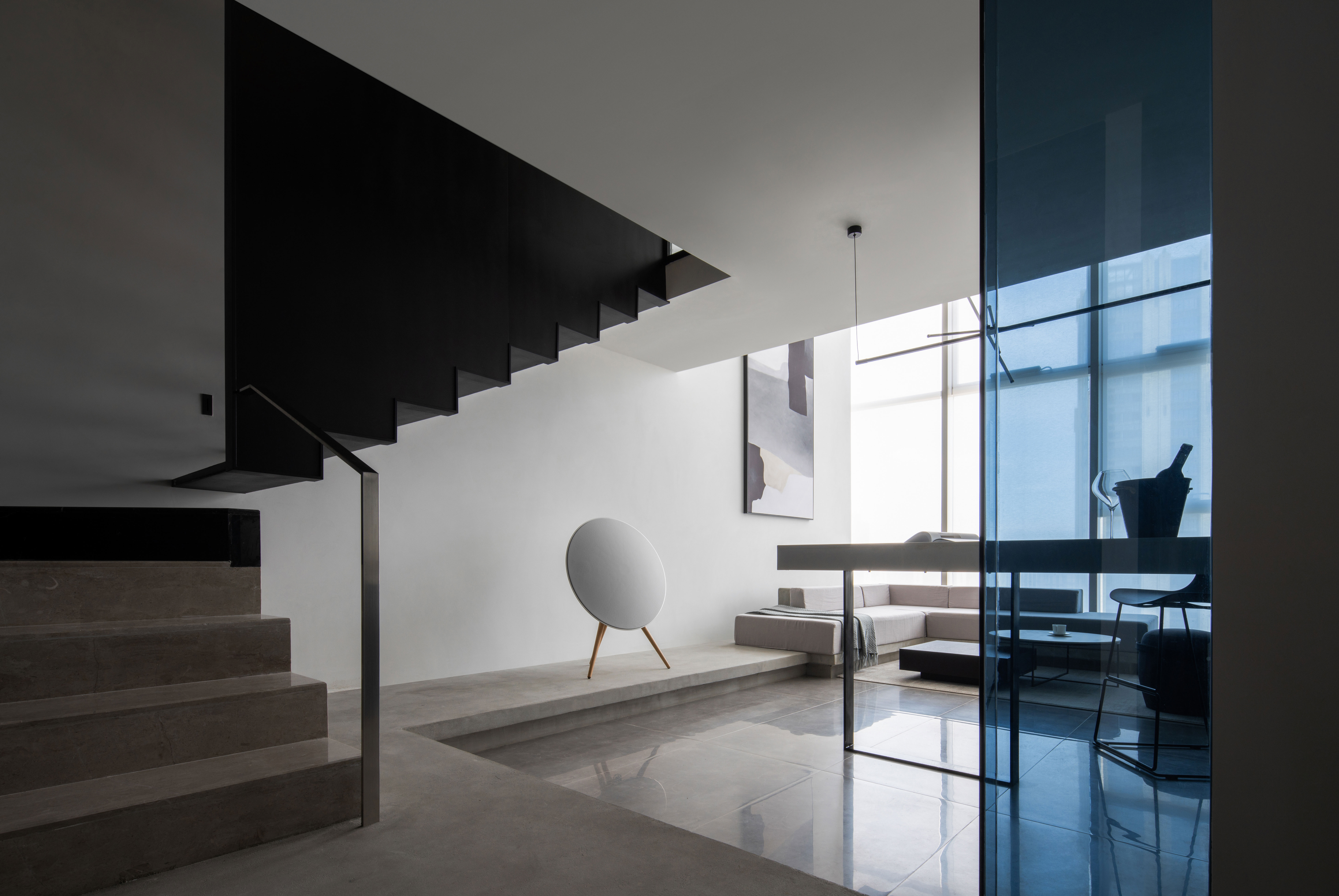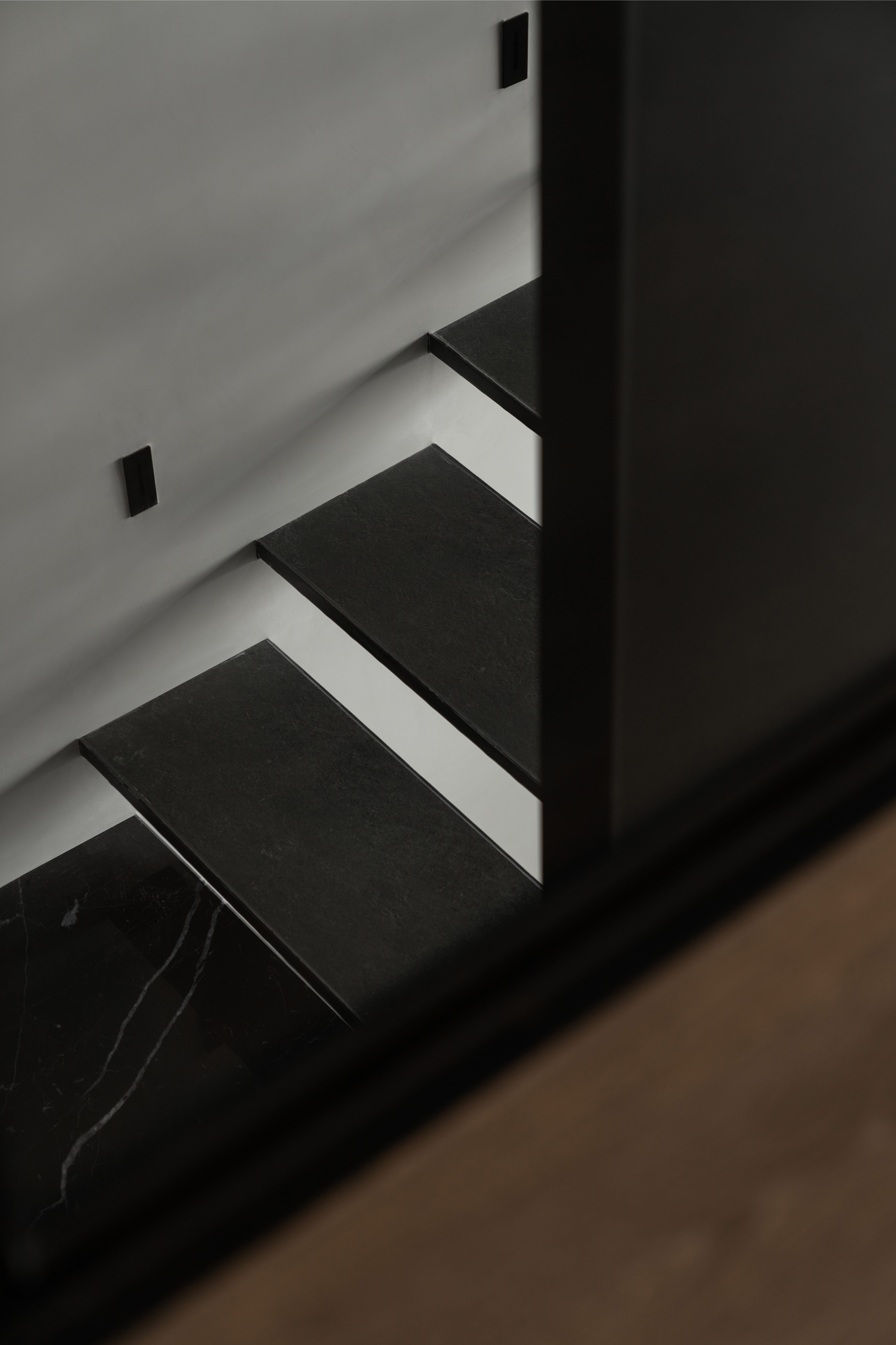 黑色的钢板、深灰色的玻璃、质朴的楼梯,把清冷的刚性、温暖的质朴两种不同的材质结合,碰撞出别样的美感、微妙的氛围……
