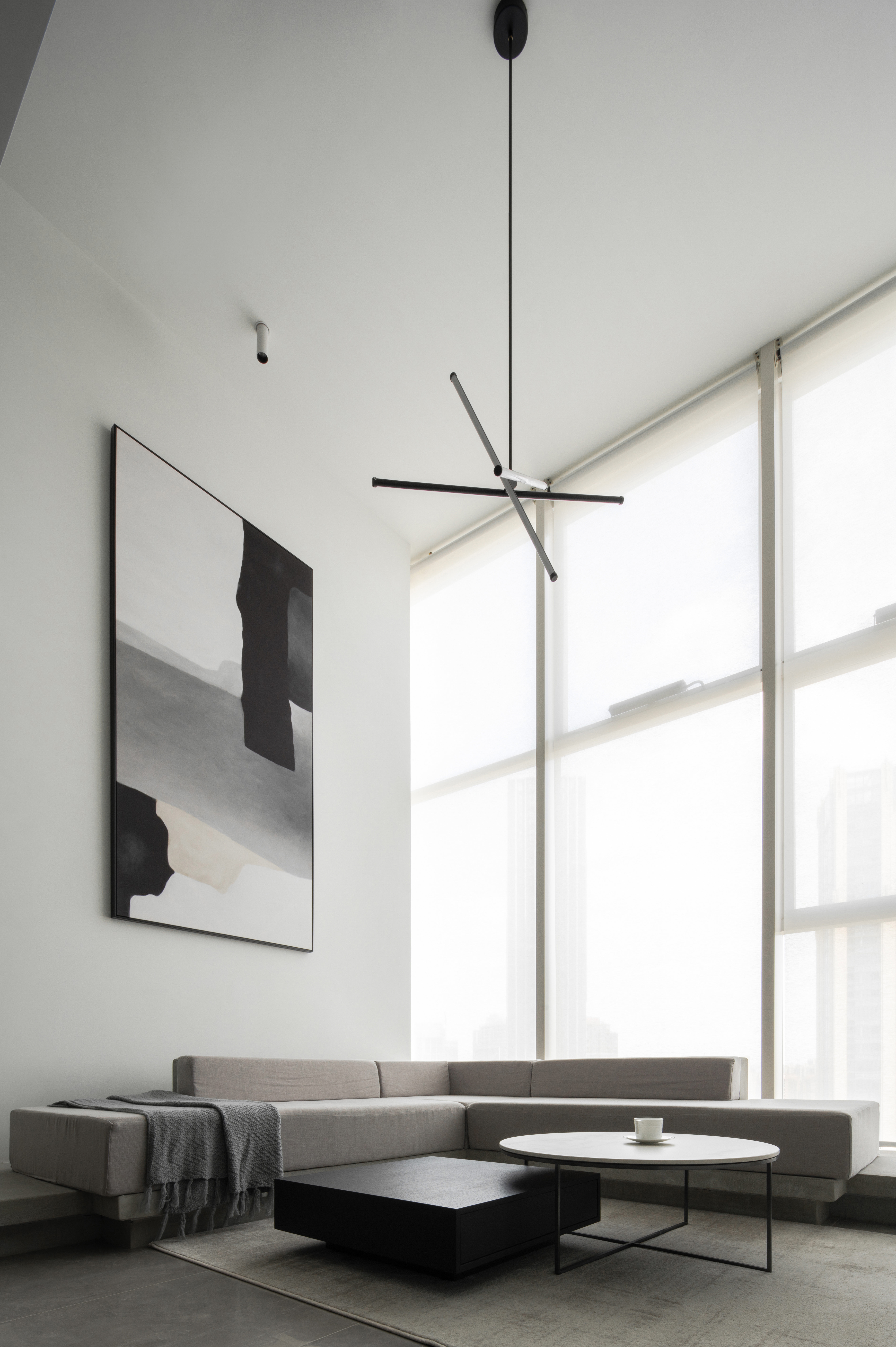 个性简洁的铁艺景观楼梯,犹如一个艺术装置,从屋顶吊挂下来,将整个空间艺术装置化。