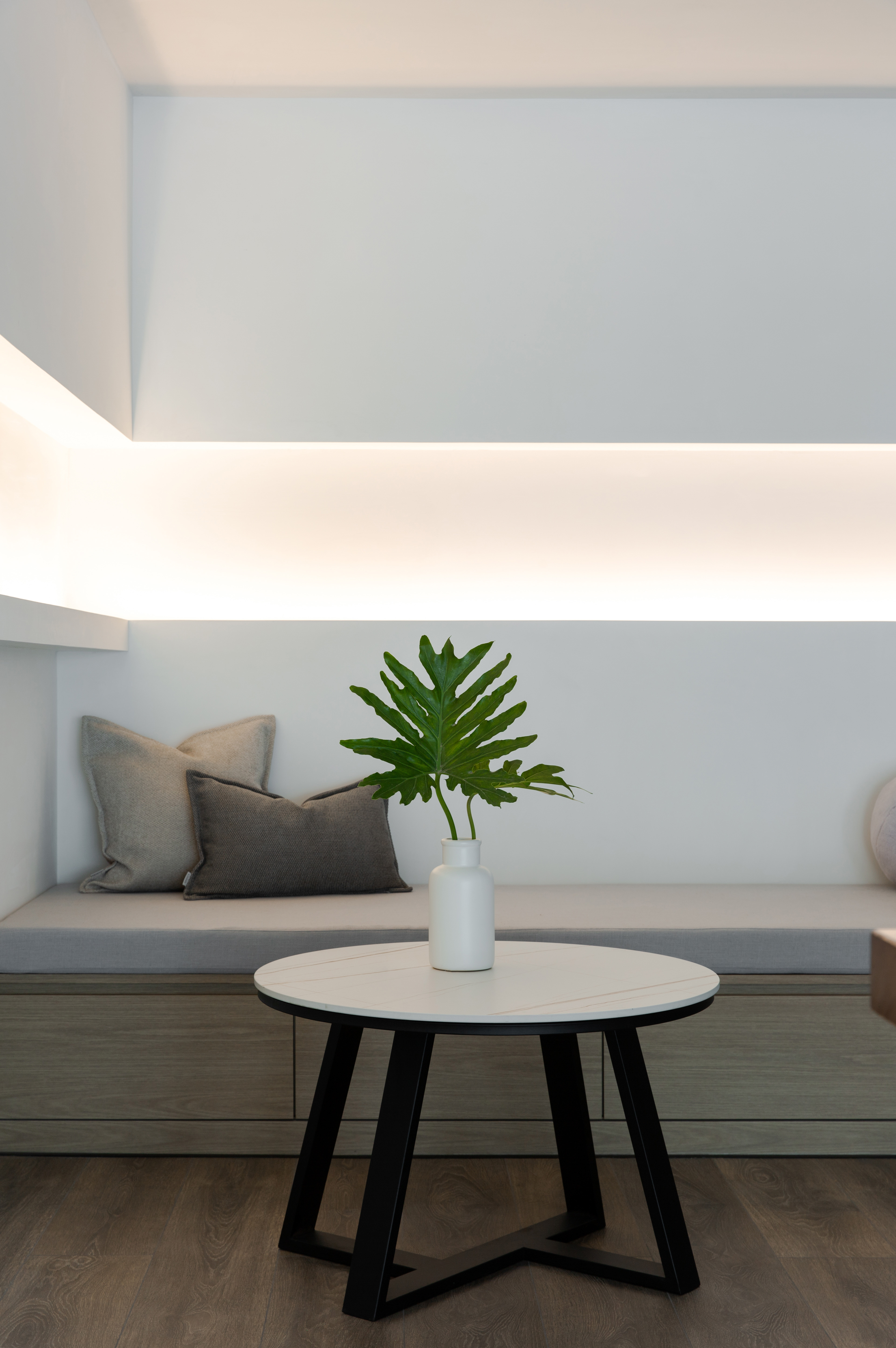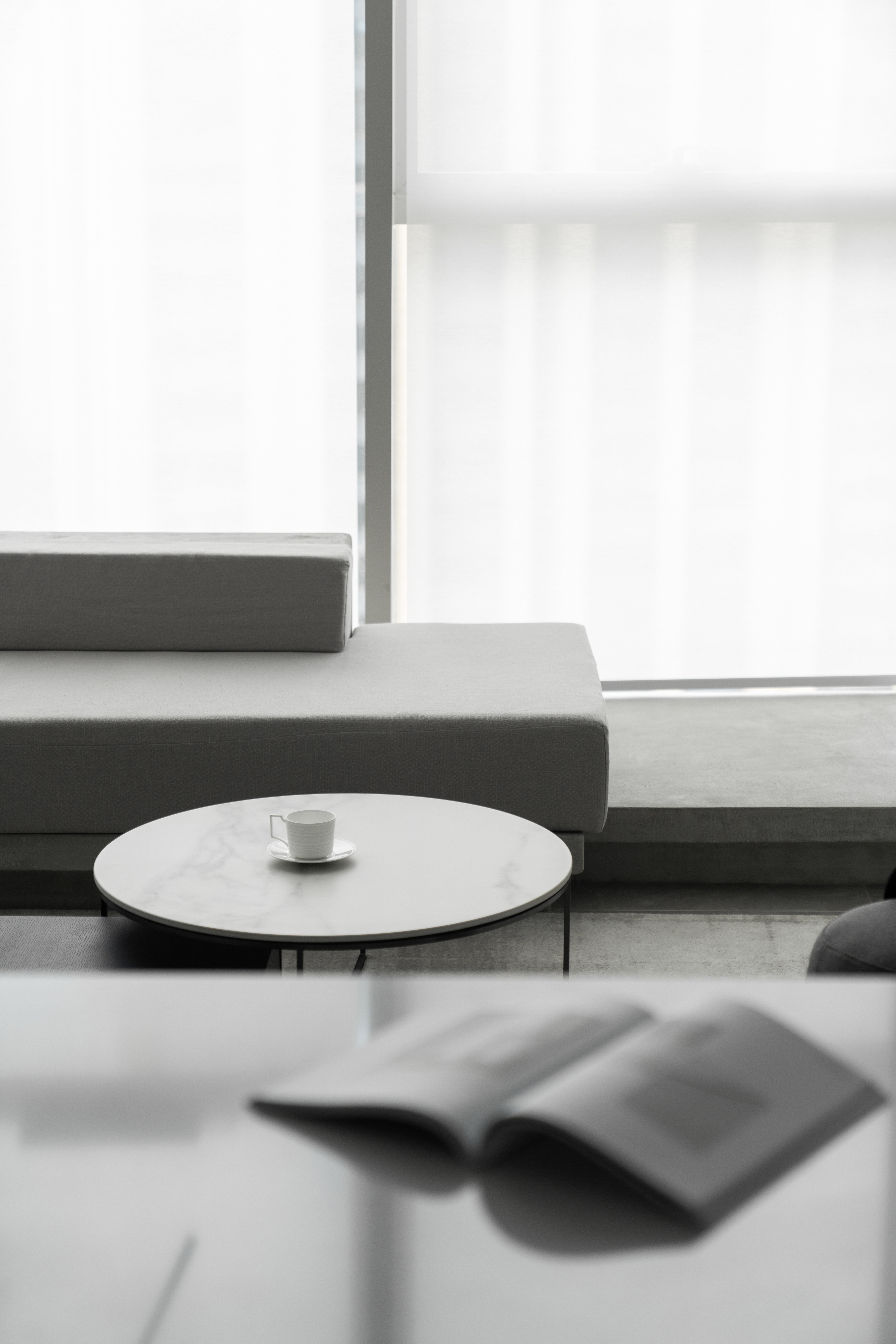 会客区采用挑高设计,阳光透过白色的纱帘,形成一种朦胧的光影,空间通透、安静而舒适;美好的天气阳光洒进室内,有一种美妙的斑驳美感。