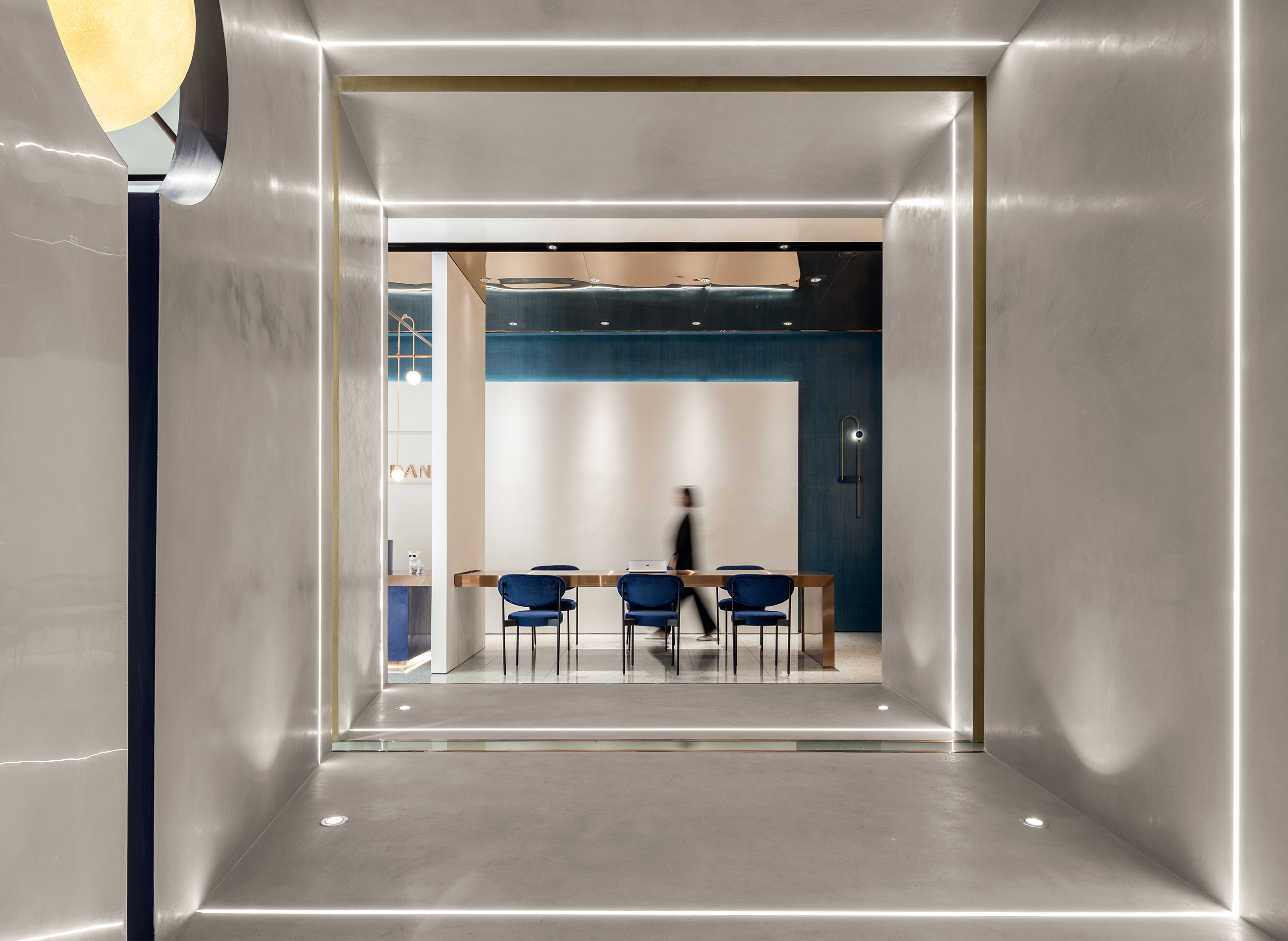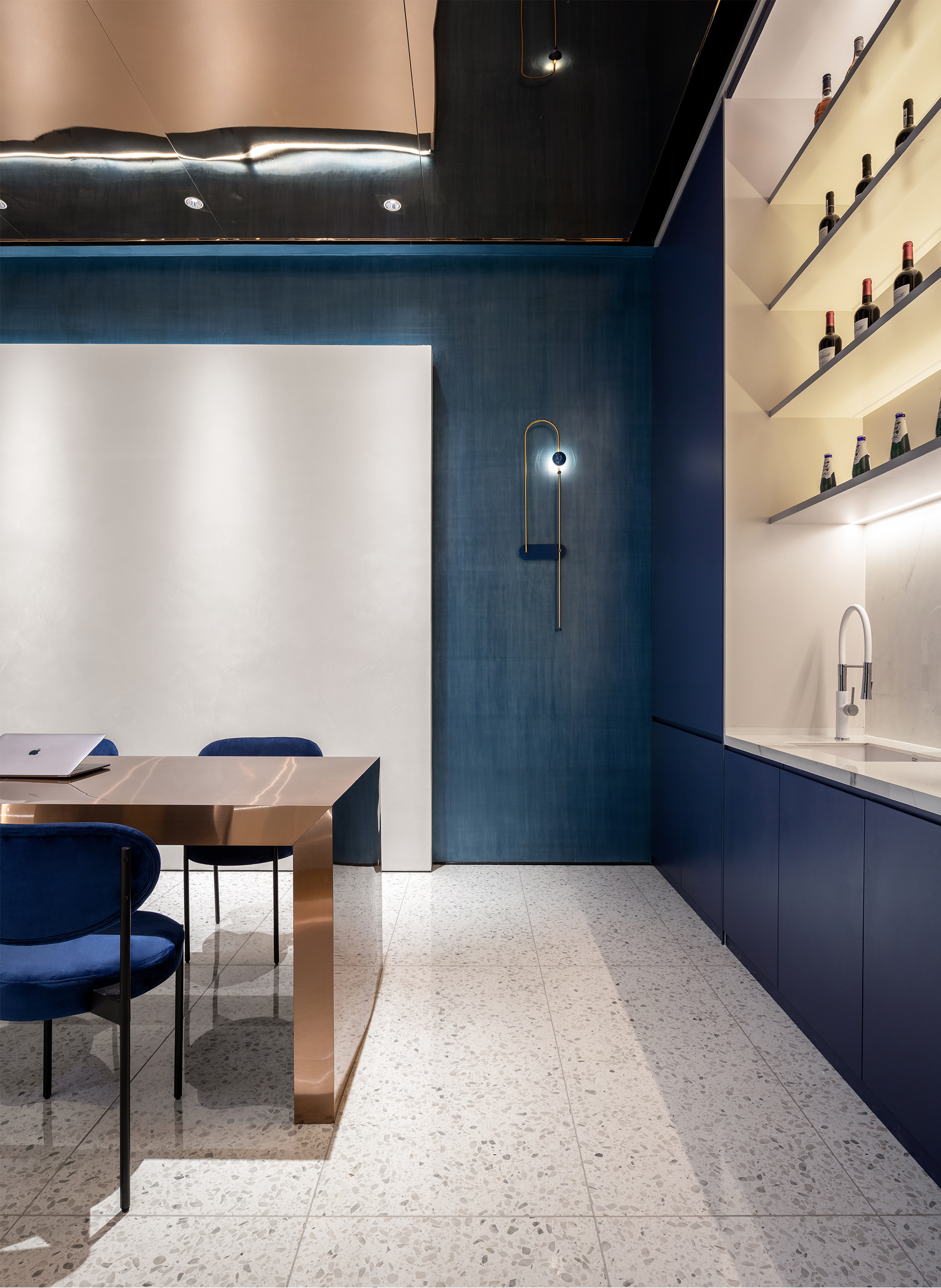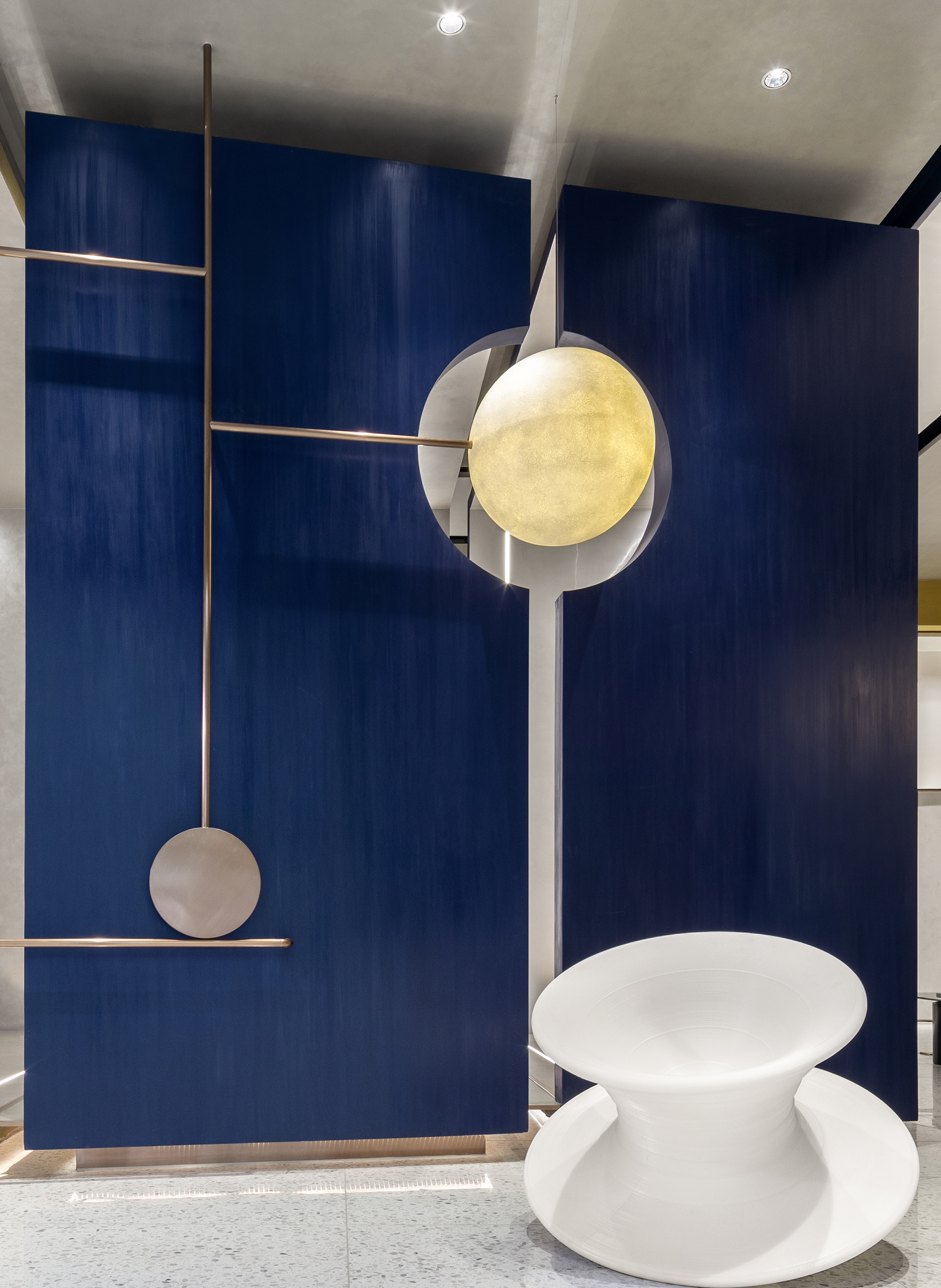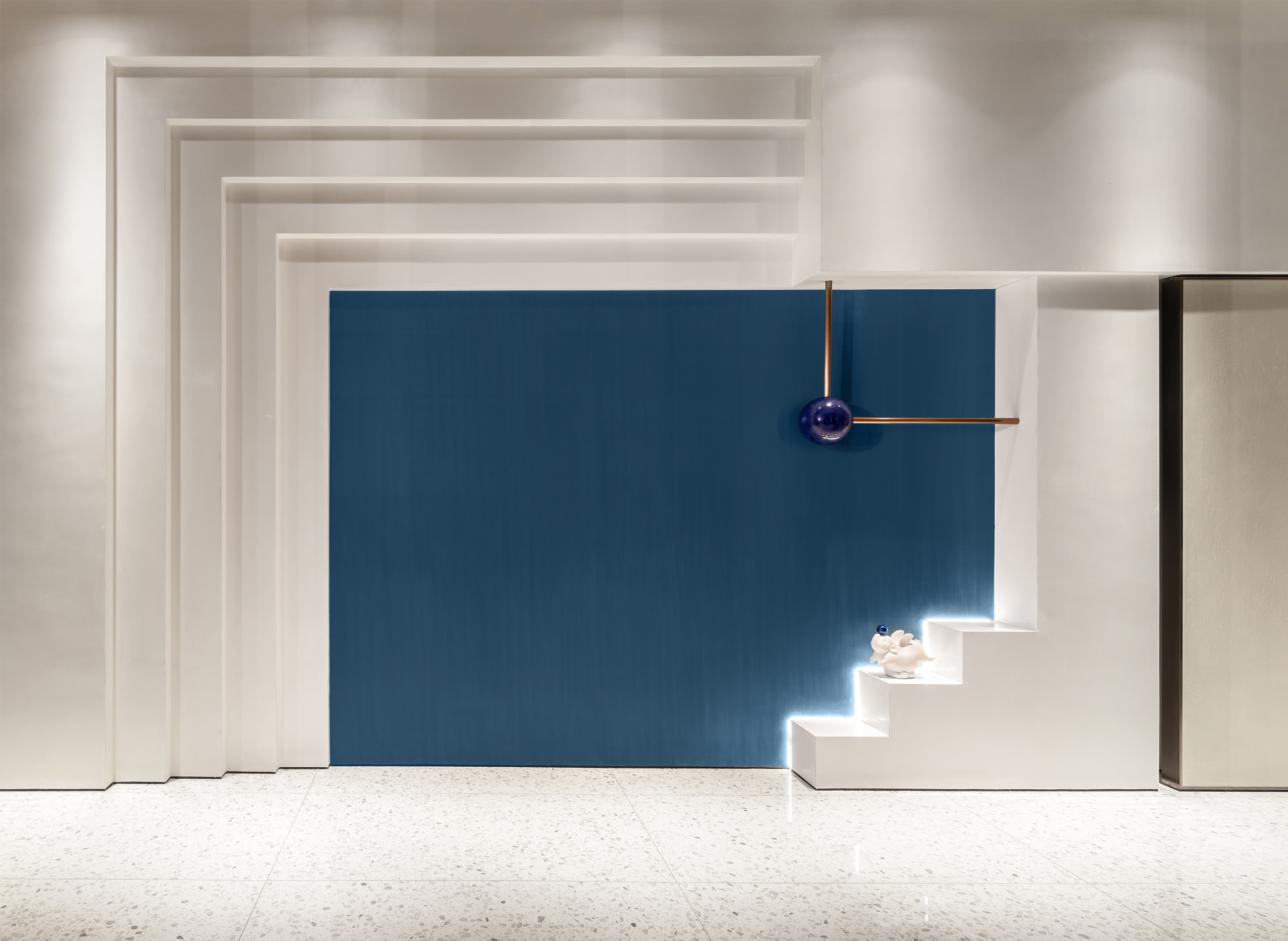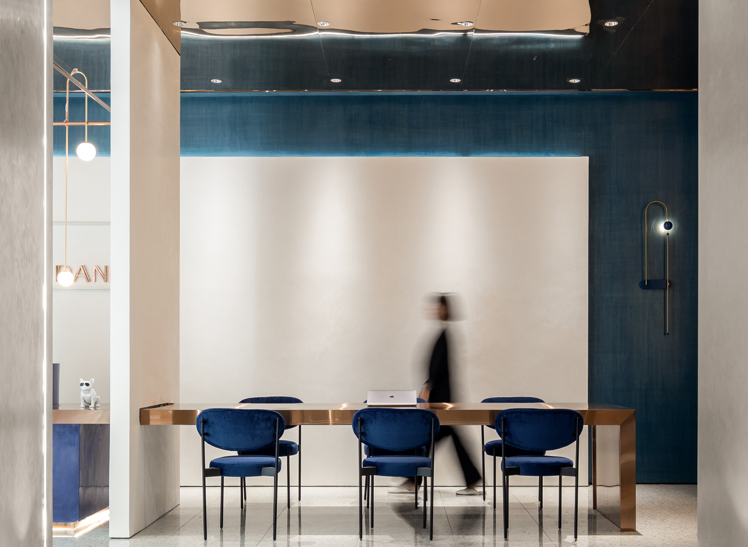 RECEPTION 接待区 看似简洁的蓝,在不同光影、视角下,折射出各异的纹路和肌理;于薄厚涂层的差异、不同材质之间形成奇妙的张力,在空间移动中带来处处惊喜,与空间融合成一种独特的艺术体验。