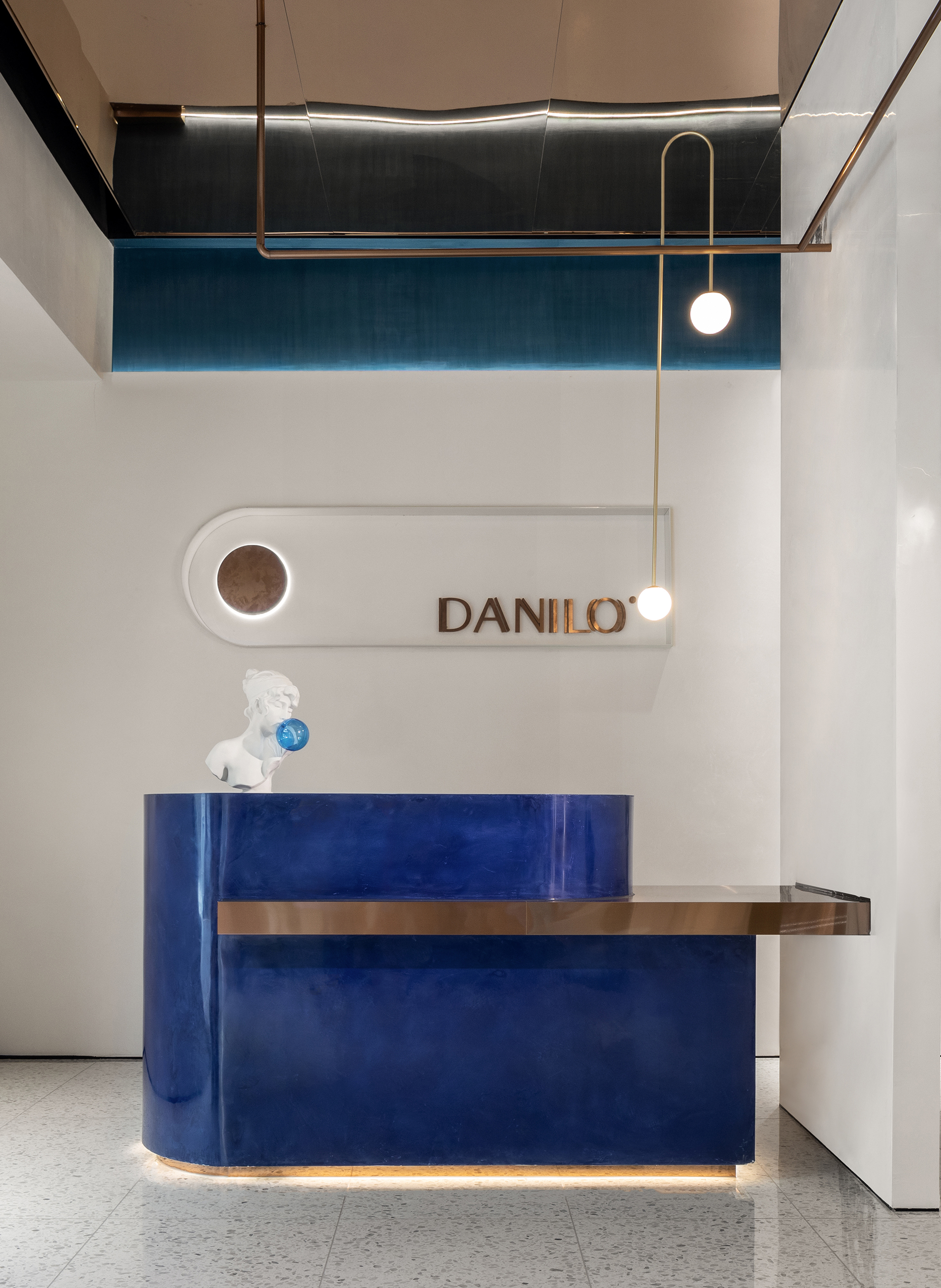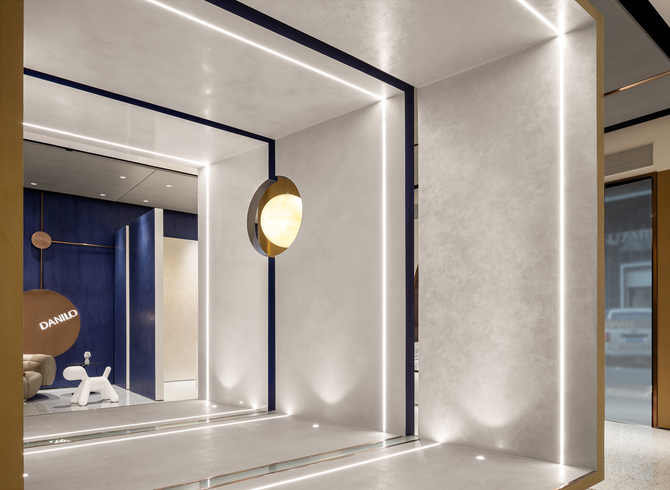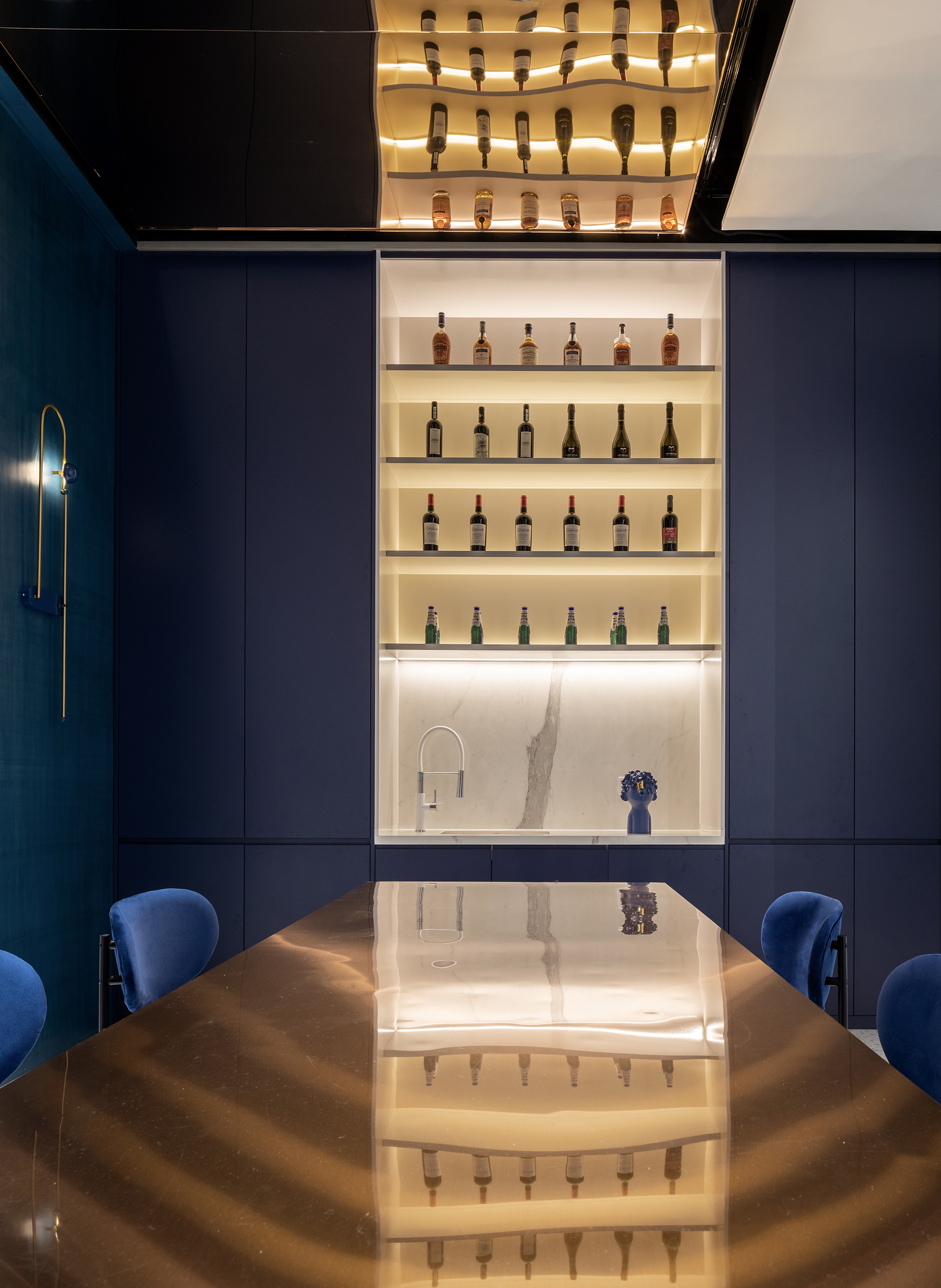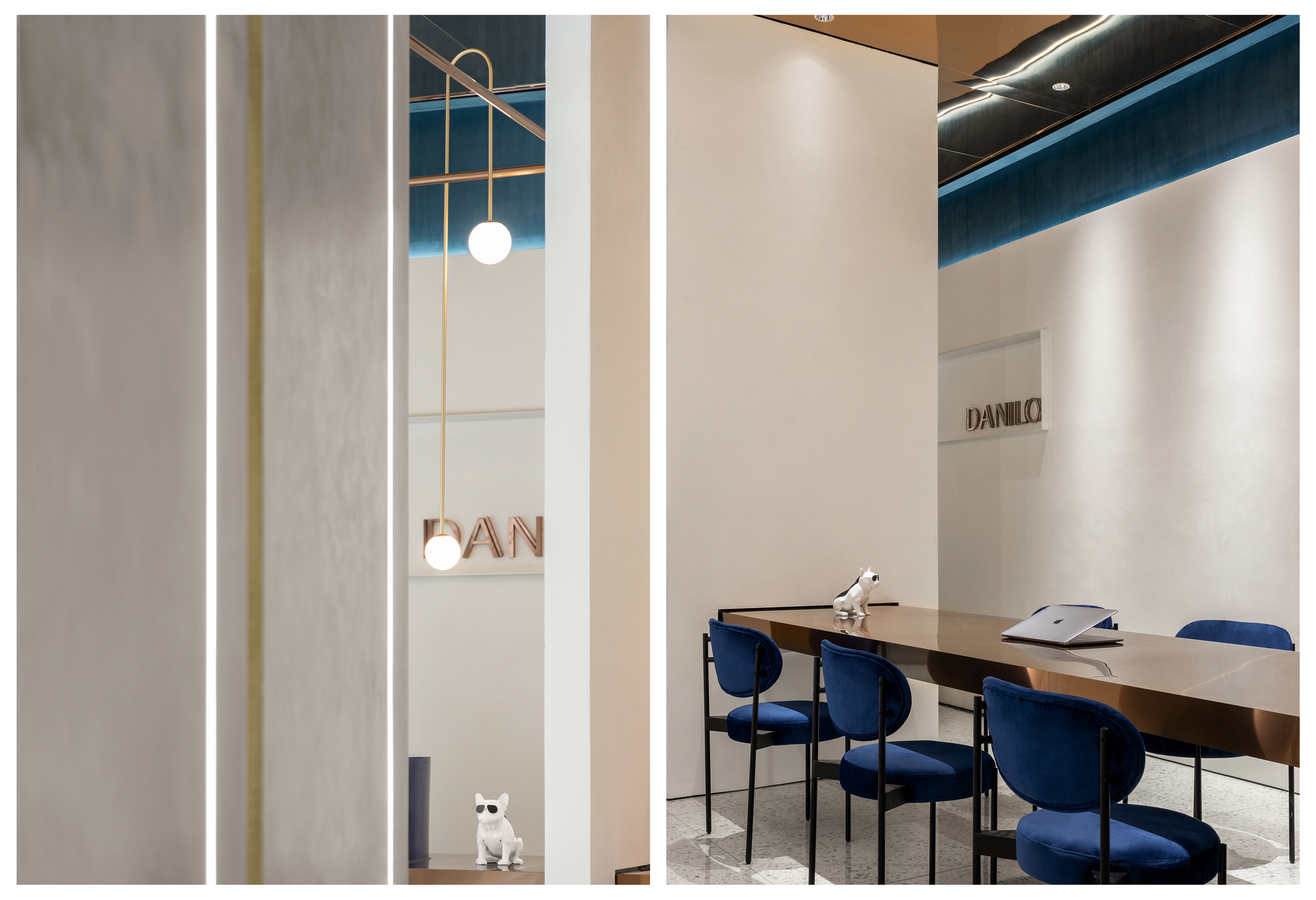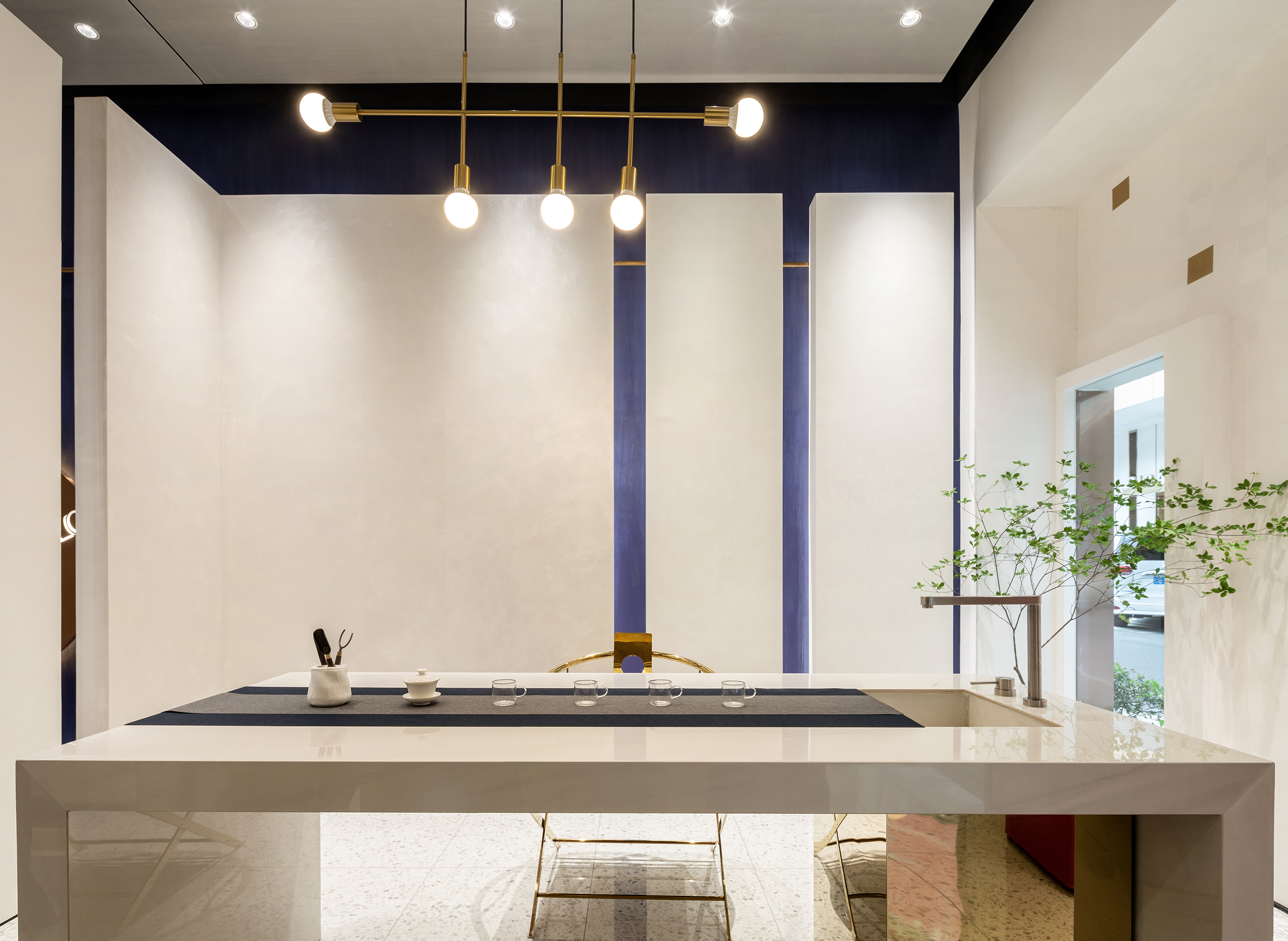 RECEPTION 接待区 看似简洁的蓝,在不同光影、视角下,折射出各异的纹路和肌理;于薄厚涂层的差异、不同材质之间形成奇妙的张力,在空间移动中带来处处惊喜,与空间融合成一种独特的艺术体验。