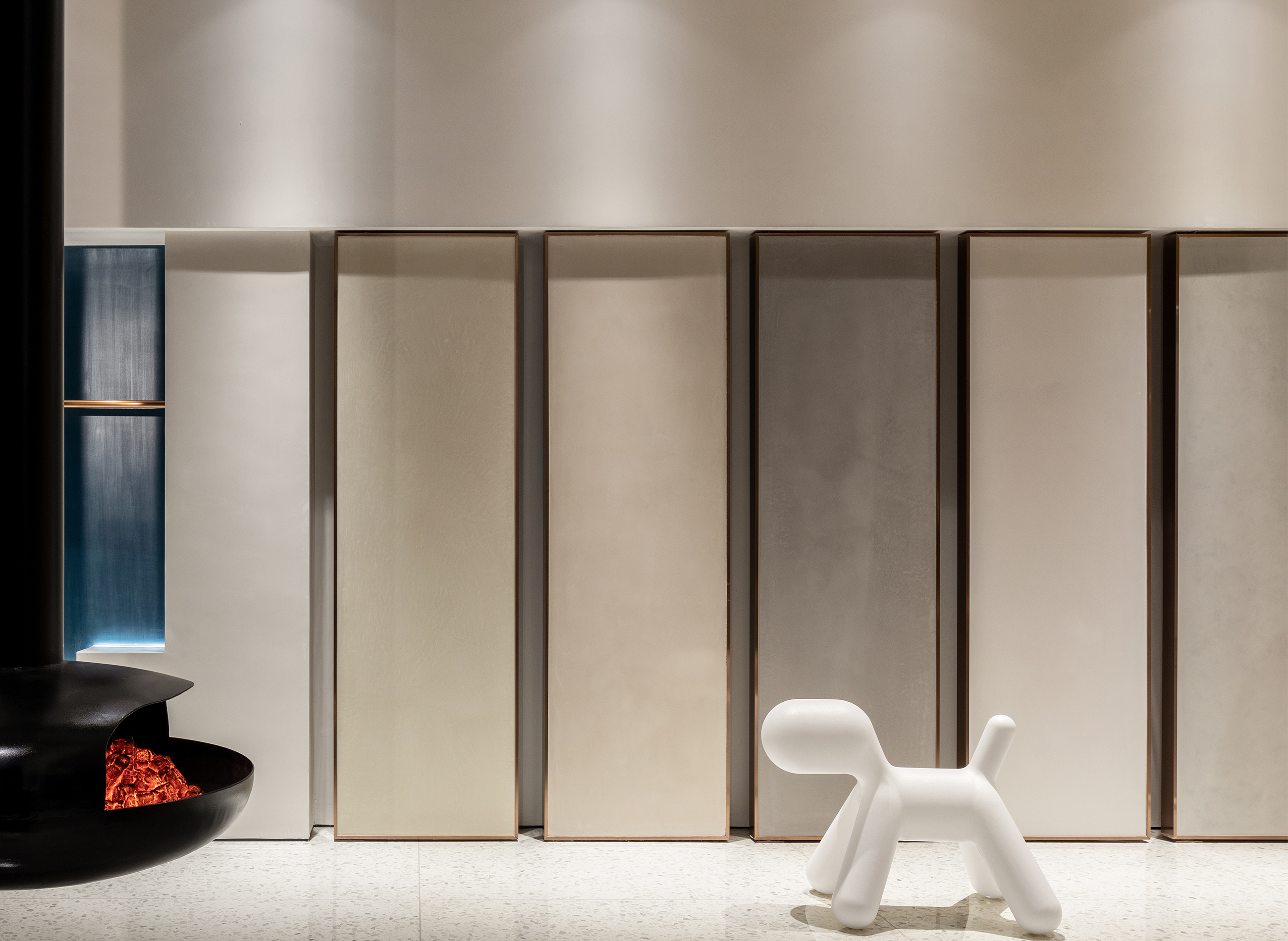 设计选材:空间运用艺术涂料的多重工艺——灰泥、玛曼奴、天鹅绒、布 纹等,将同一色彩多种工艺表达,结合光线的投射、叠加,以色彩雕琢空间的层次质感,增强作品空间与时间的维度。