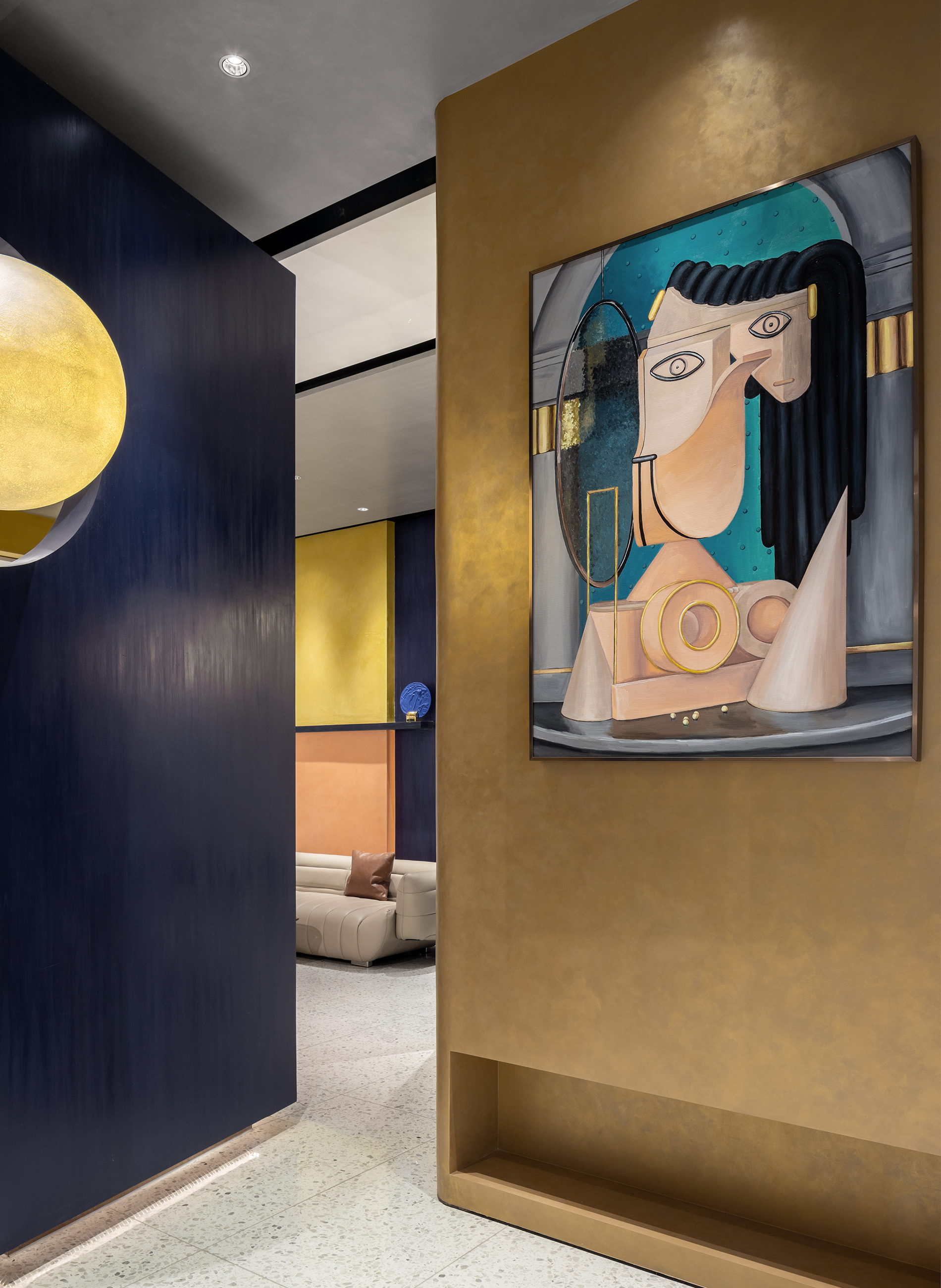 空间意境:空间的色彩搭配基于「四色定理」,将艺术家毕加索的作品《Woman’s Head》3D呈现并重组演绎,提炼色彩,分解几何,雕琢意境,将空间做成画,折射着前厅画作中色彩斑斓的艺术世界。