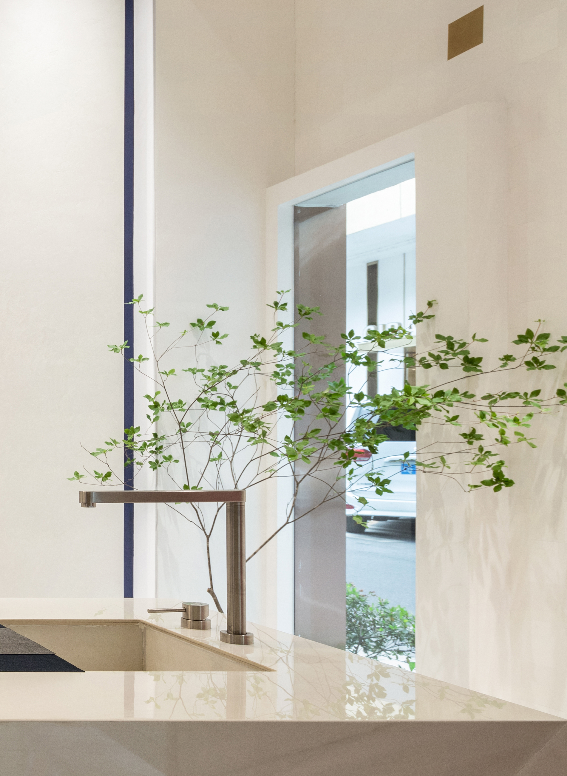 TEAROOM 茶室 不同质感和肌理的材质对比犹如物品的相互对话,无论是过道上看似随意摆放的绿植,还是桌面上精美茶具,细微之处的累积使空间安静婉约、温馨而舒朗。