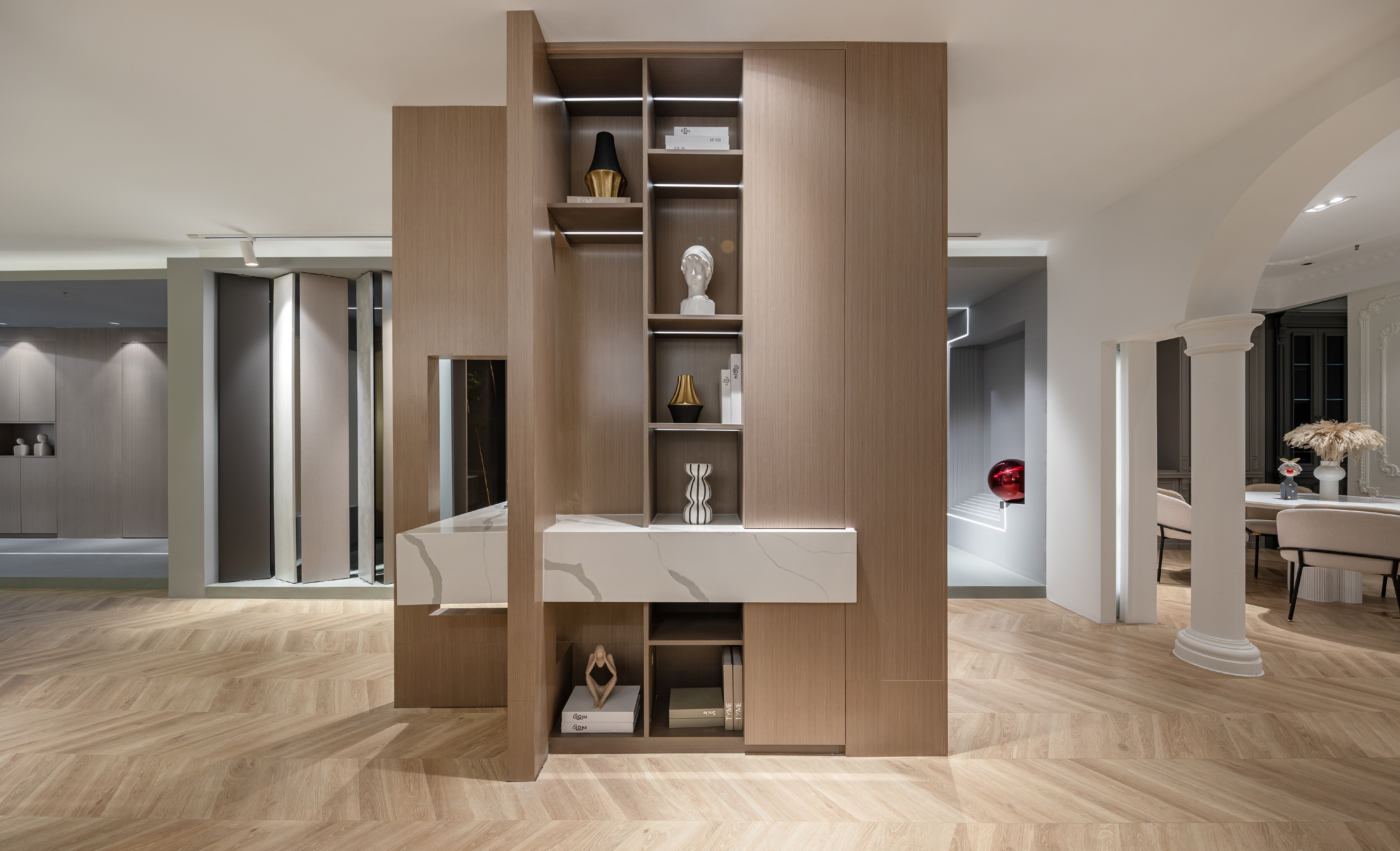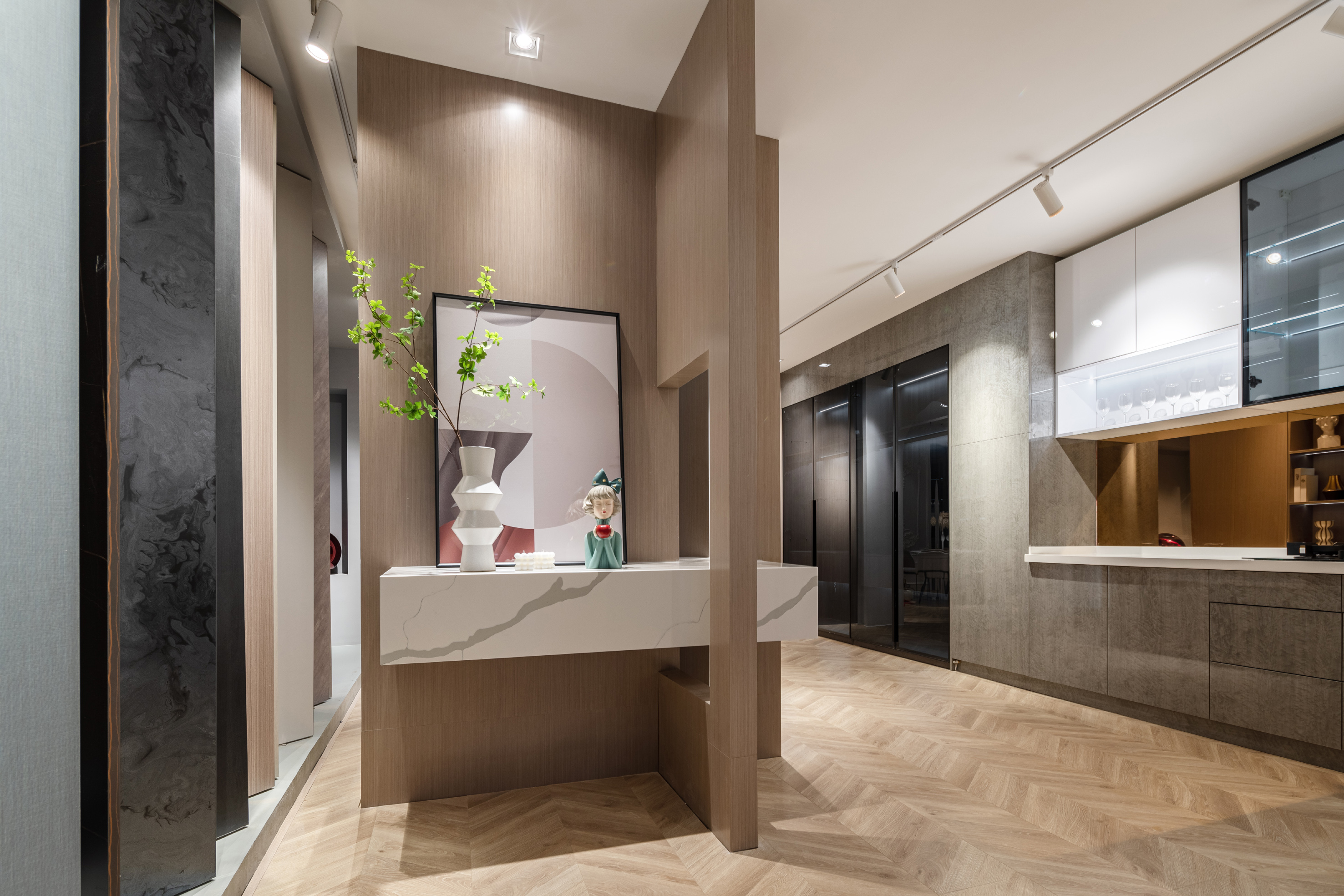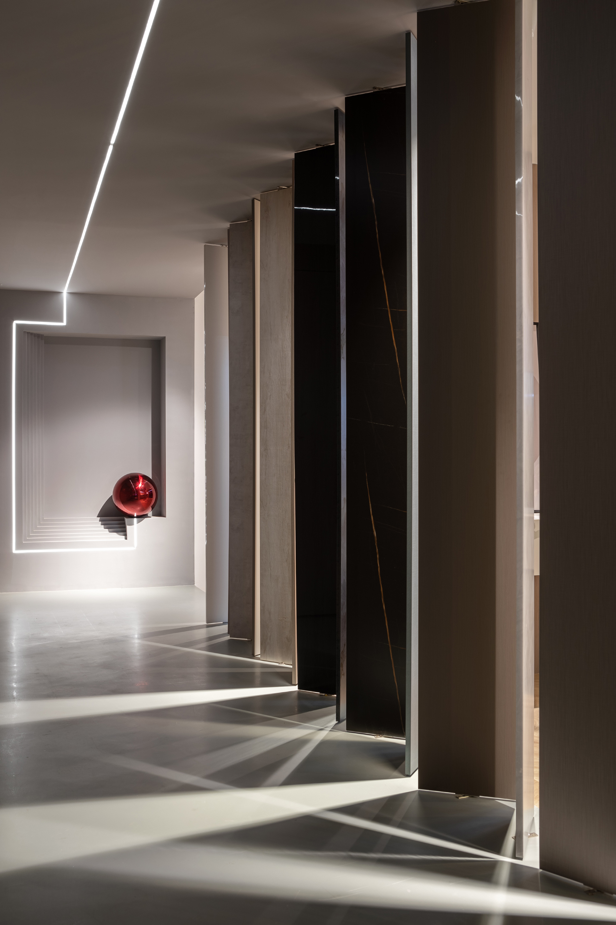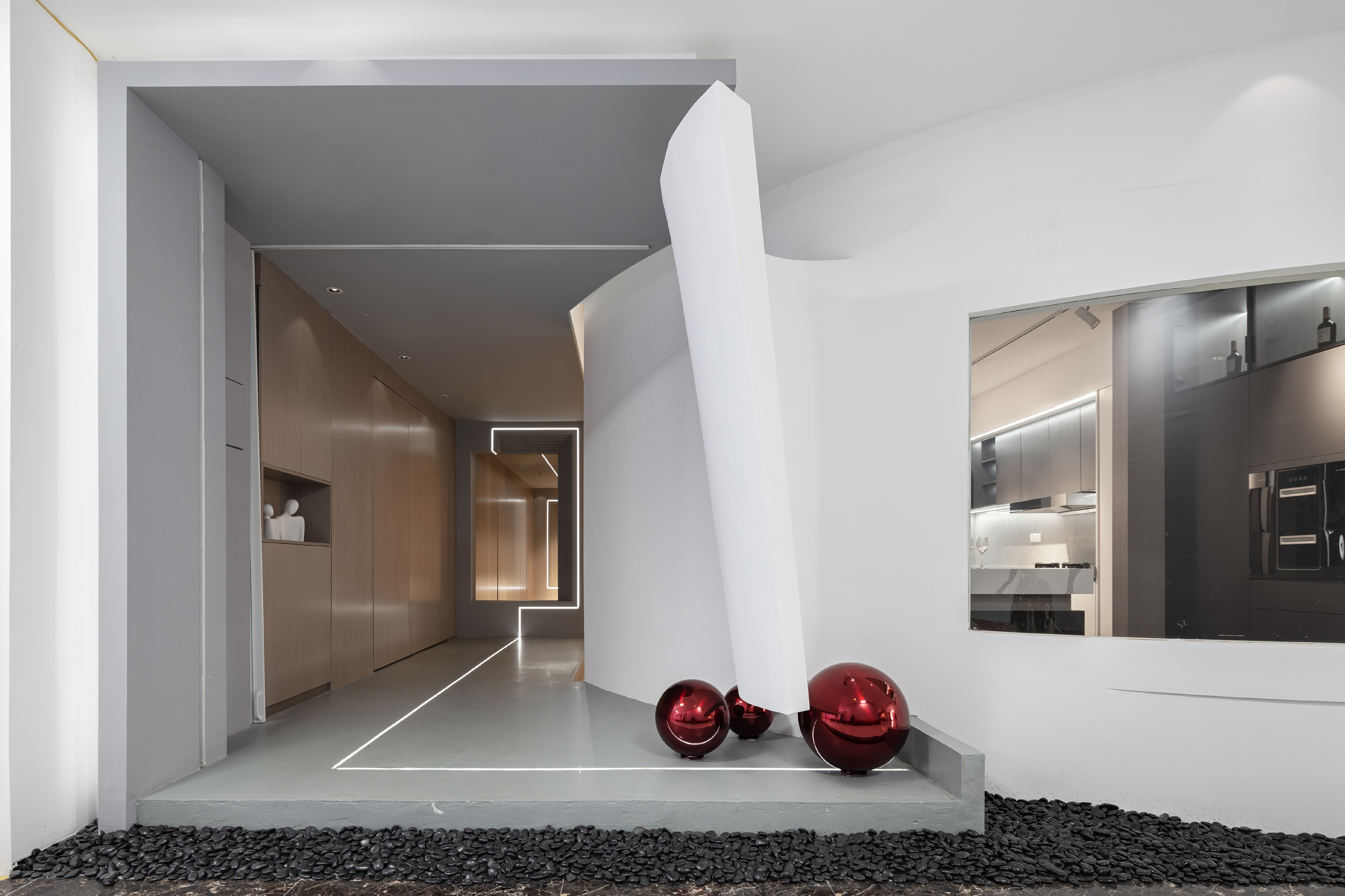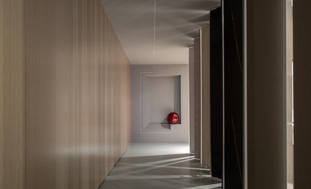 白色的石材用不对称的放置手法,使其视觉重点位于右侧,引导人走向另一种不同风格的空间。