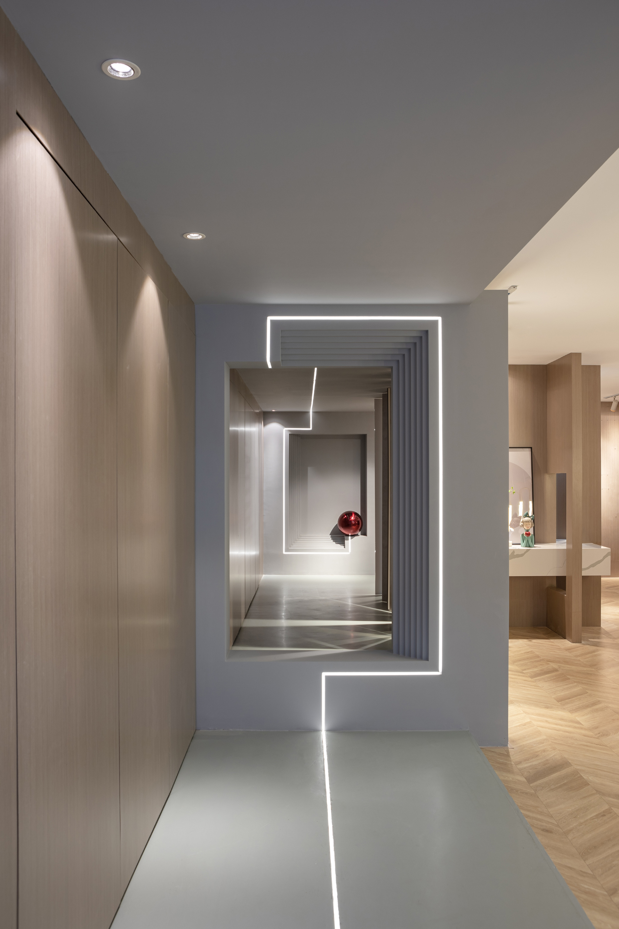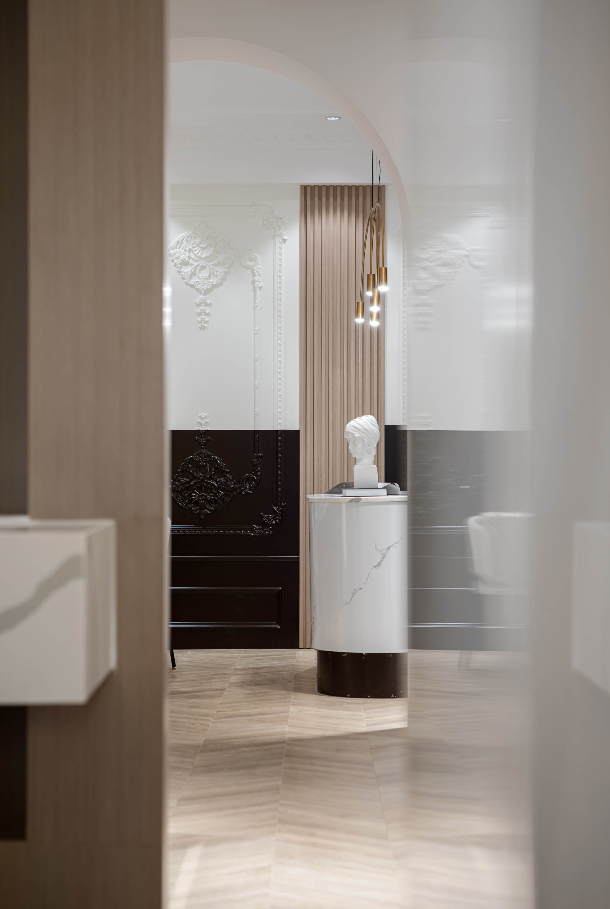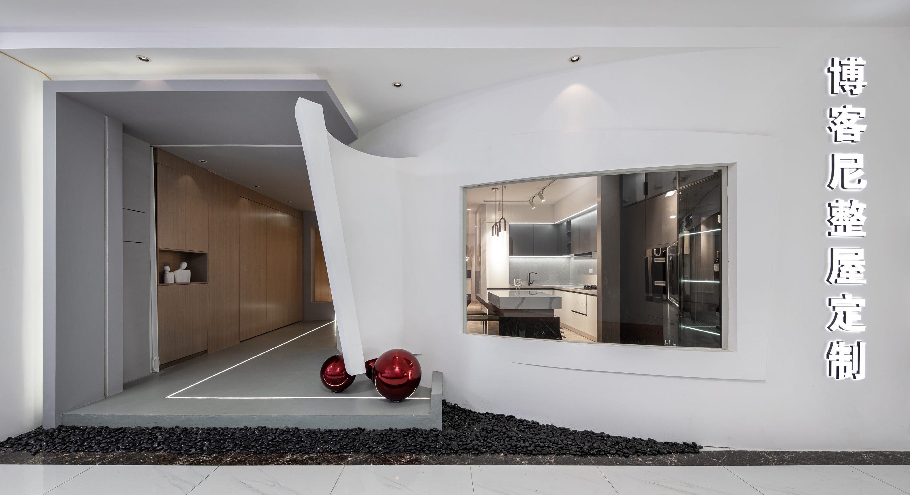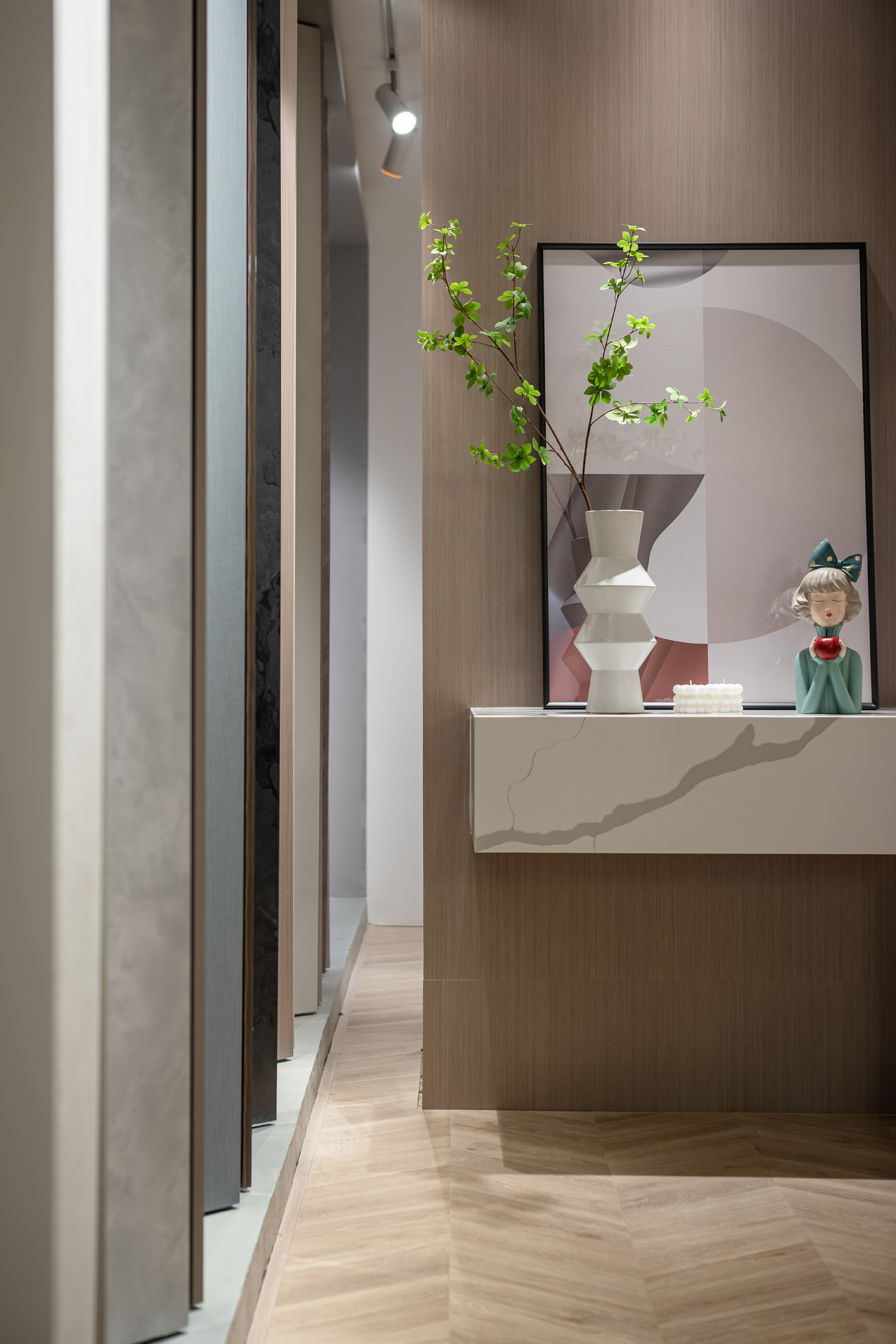 白色的石材用不对称的放置手法,使其视觉重点位于右侧,引导人走向另一种不同风格的空间。