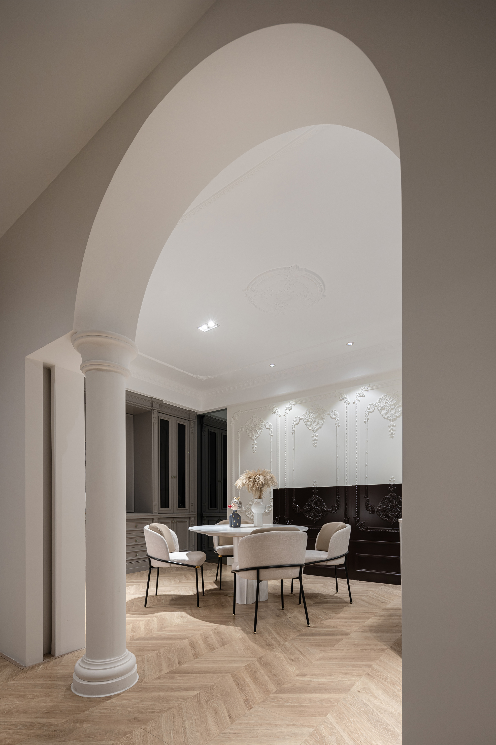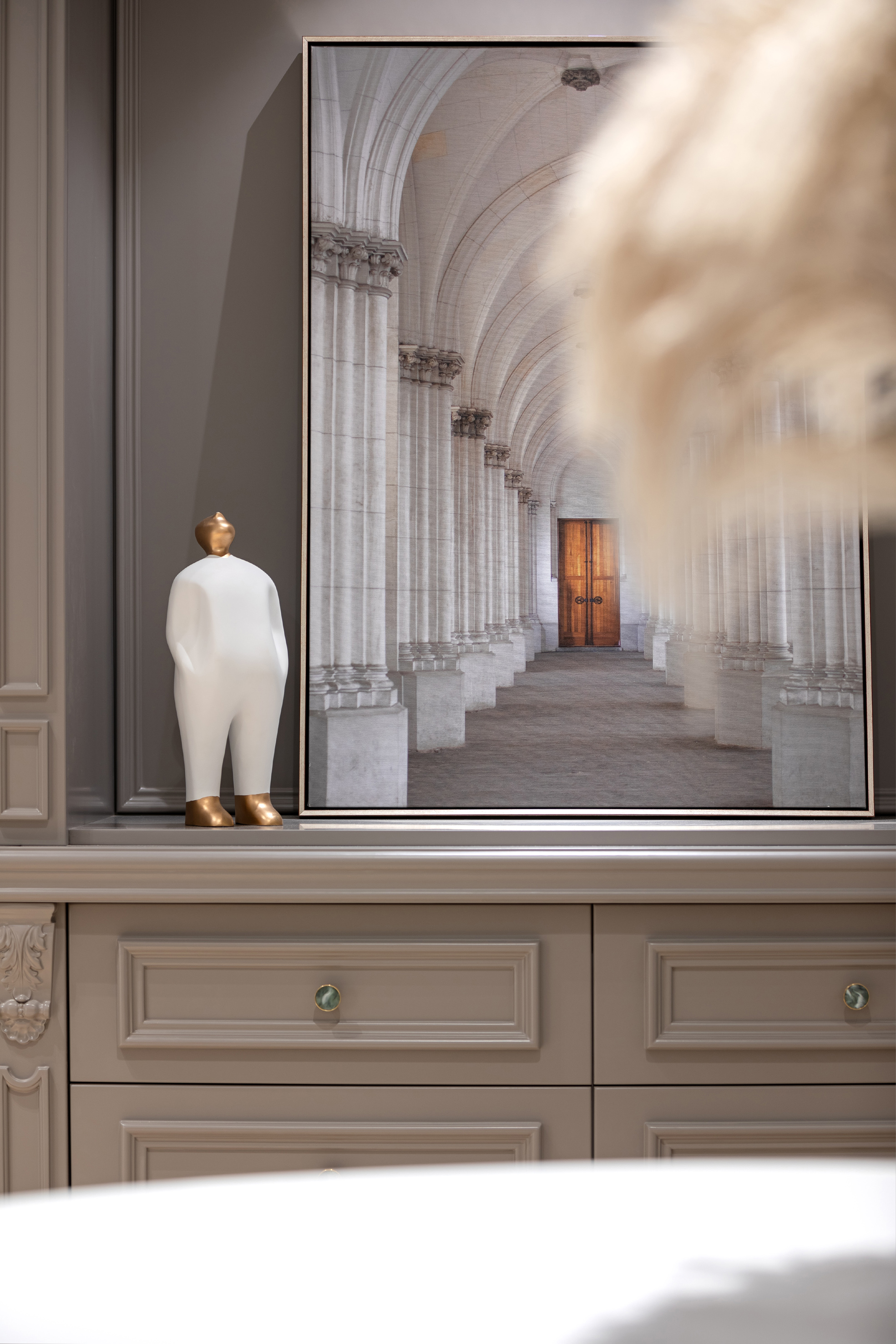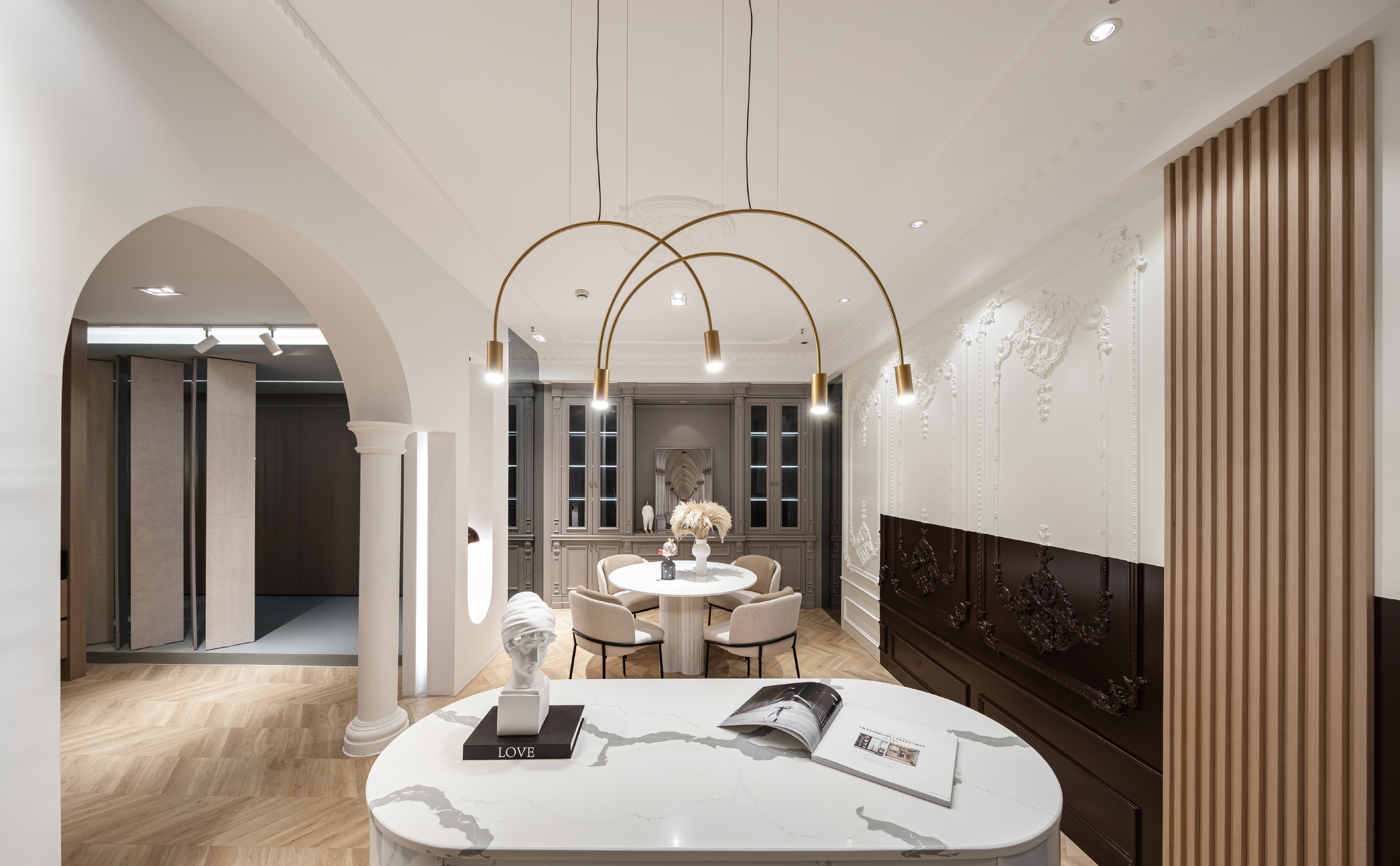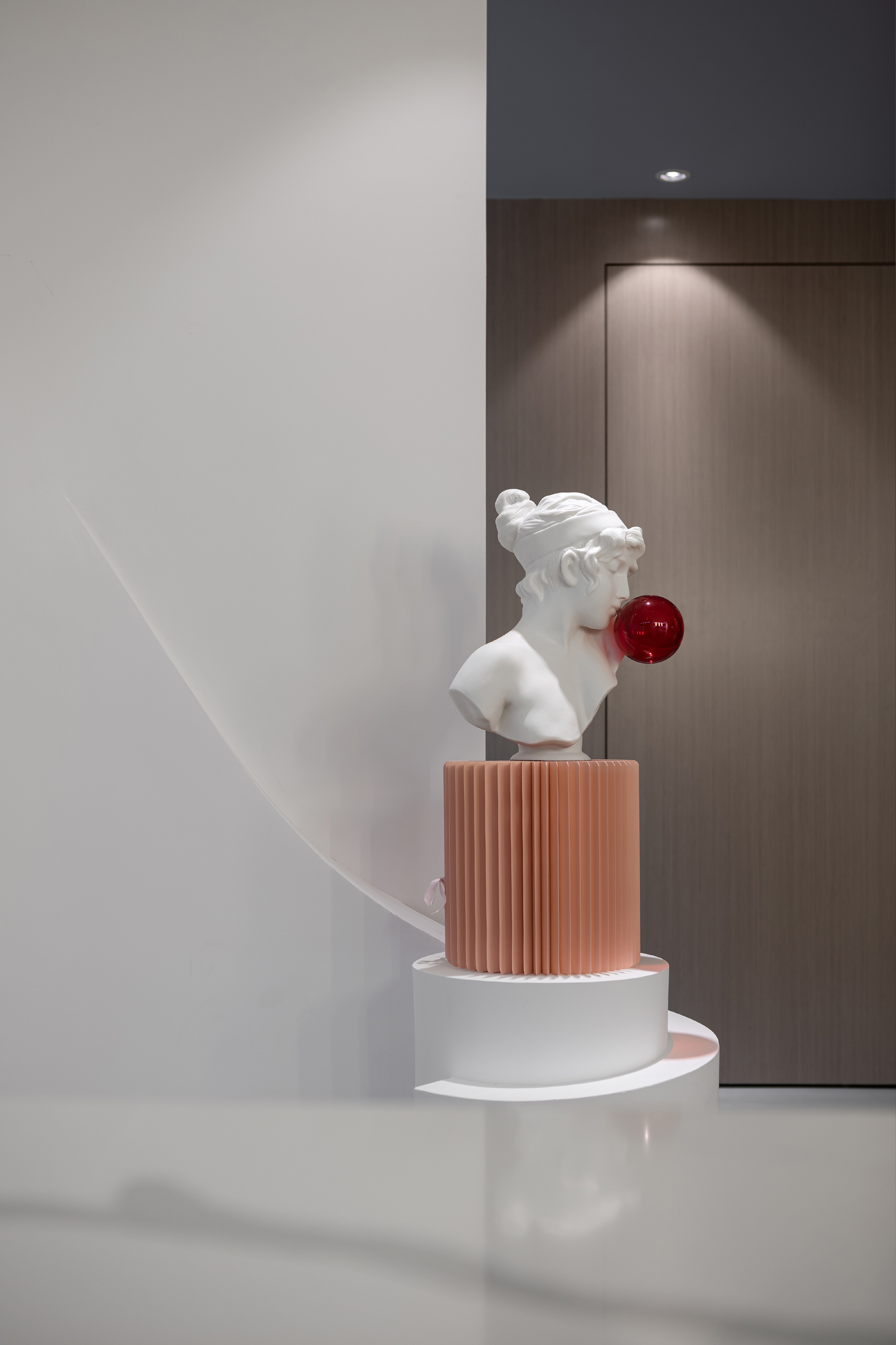 白色的石材用不对称的放置手法,使其视觉重点位于右侧,引导人走向另一种不同风格的空间。