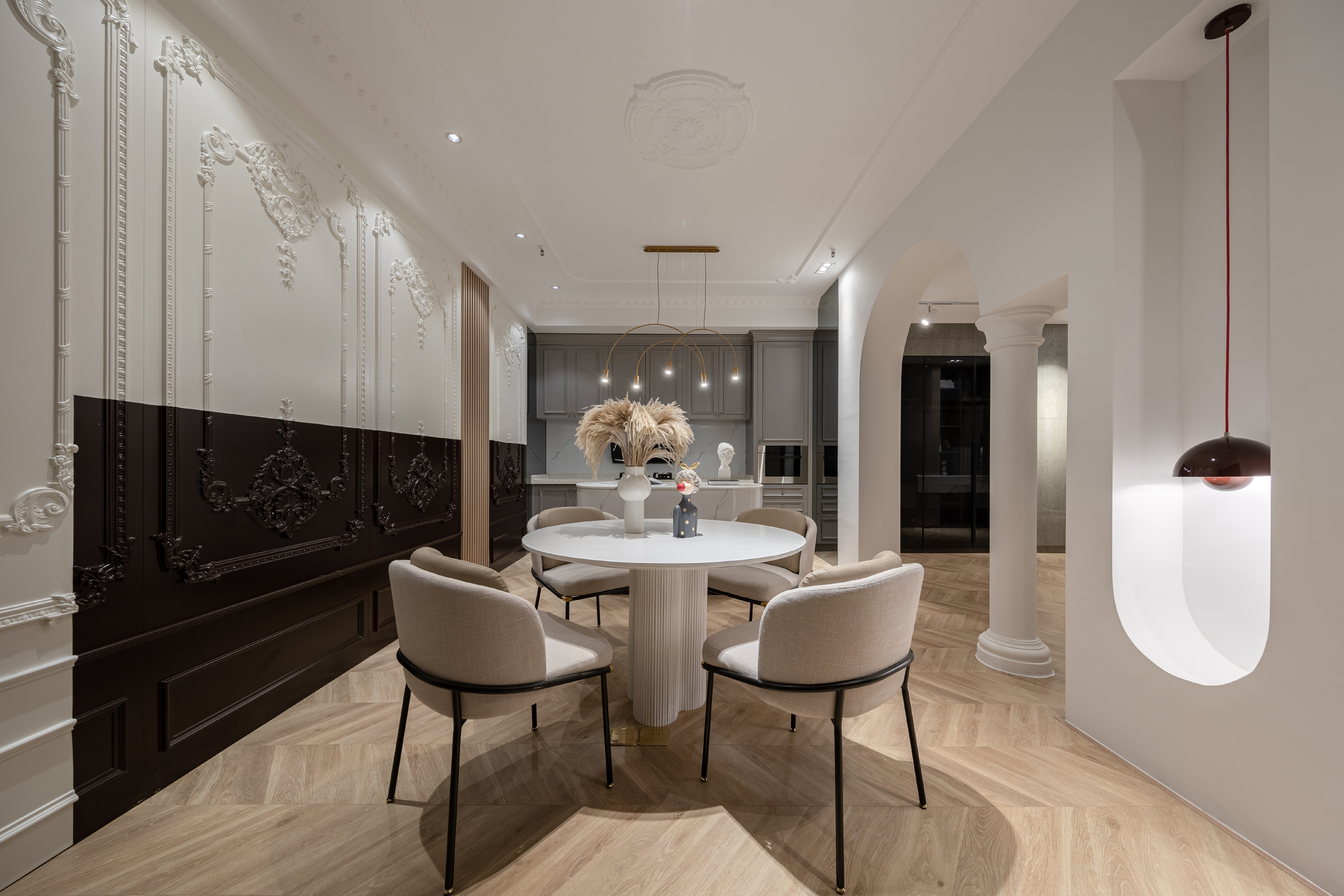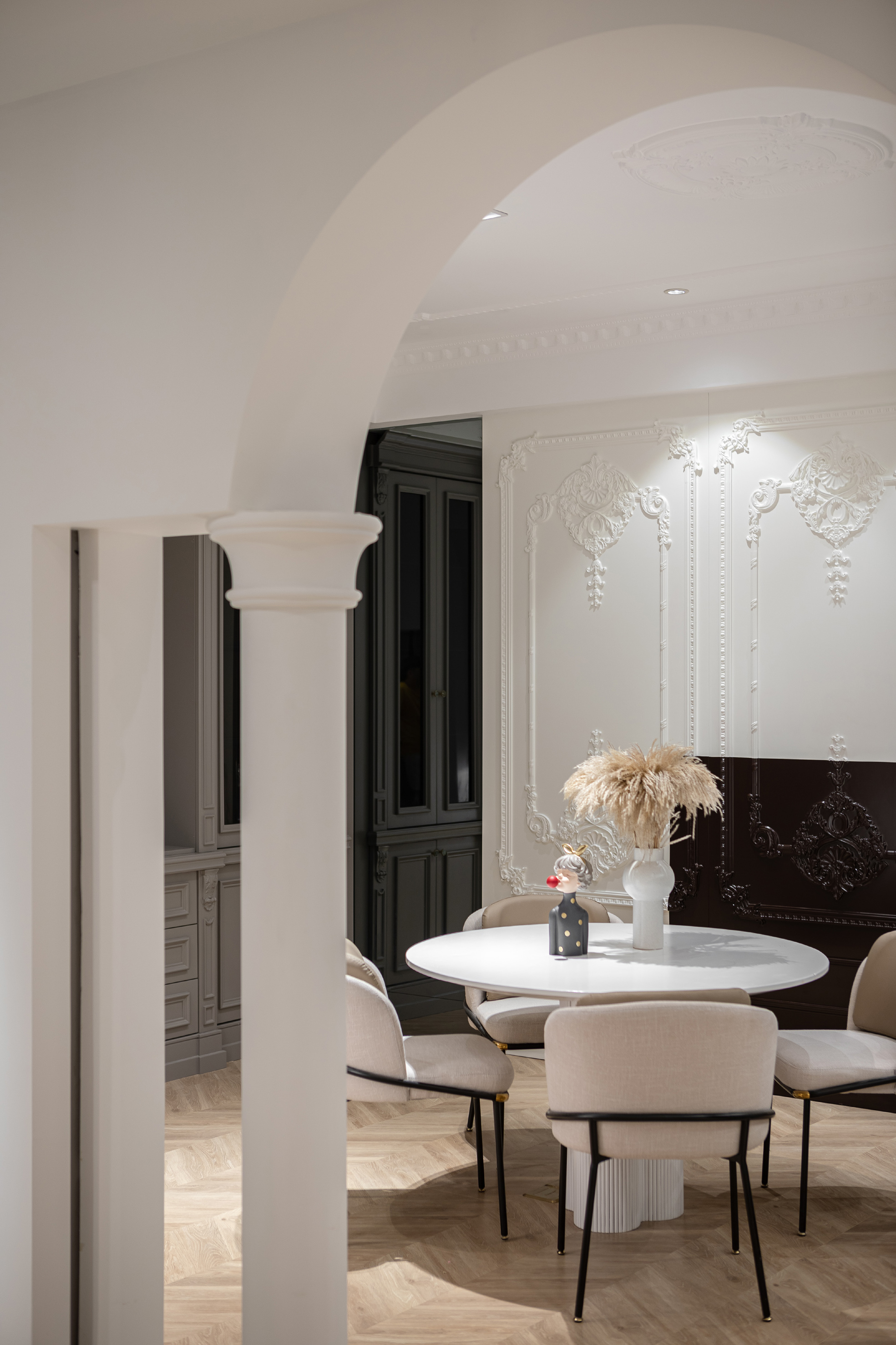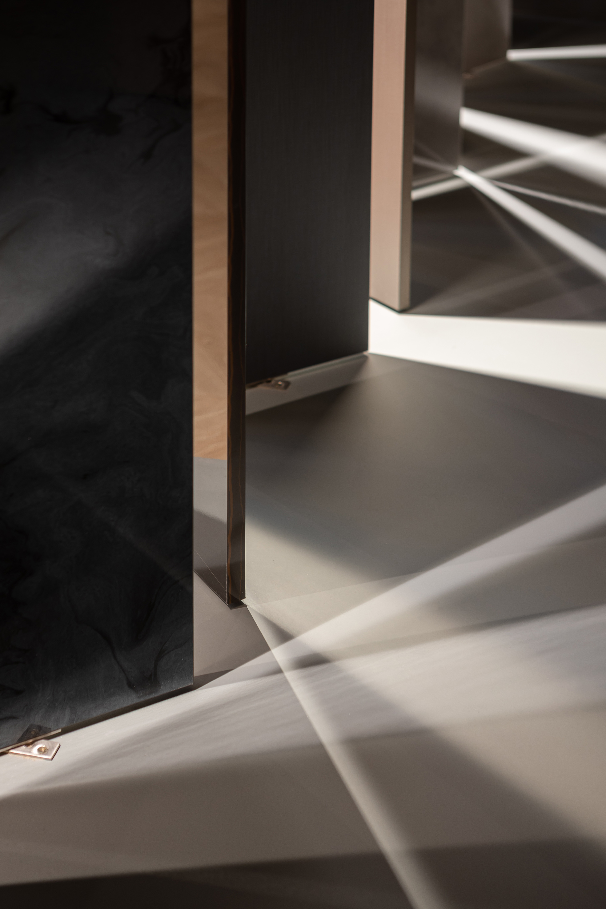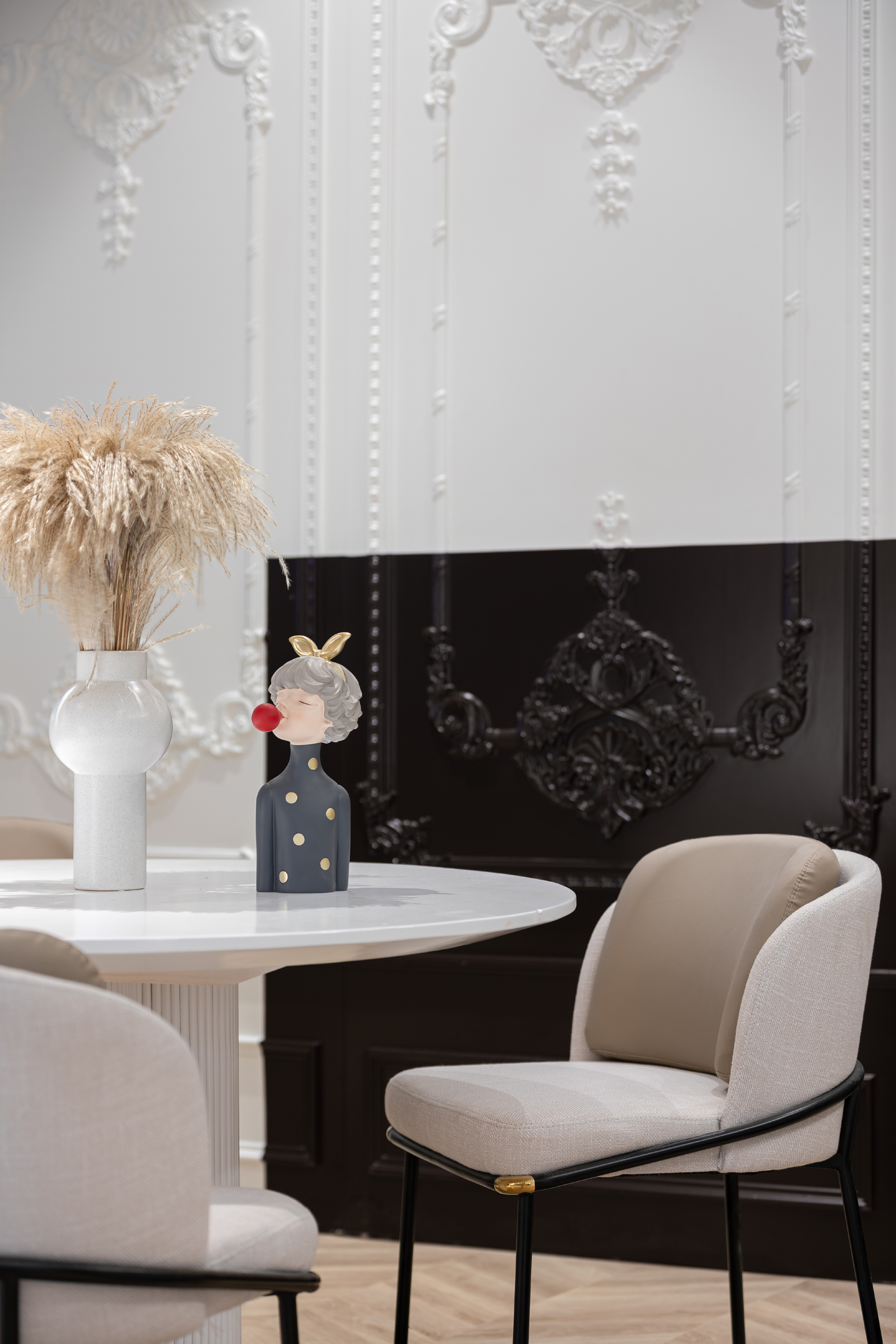 白色的石材用不对称的放置手法,使其视觉重点位于右侧,引导人走向另一种不同风格的空间。