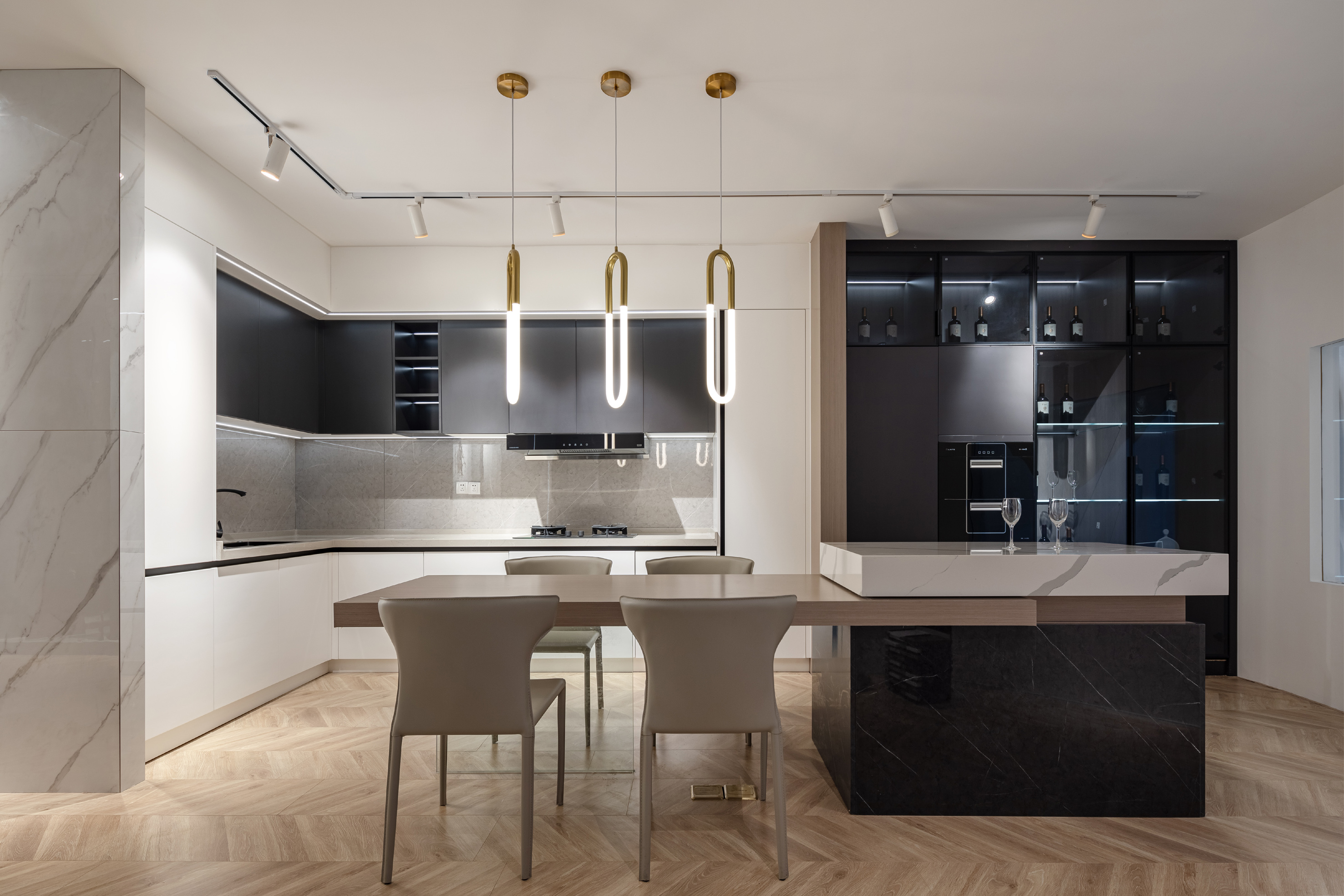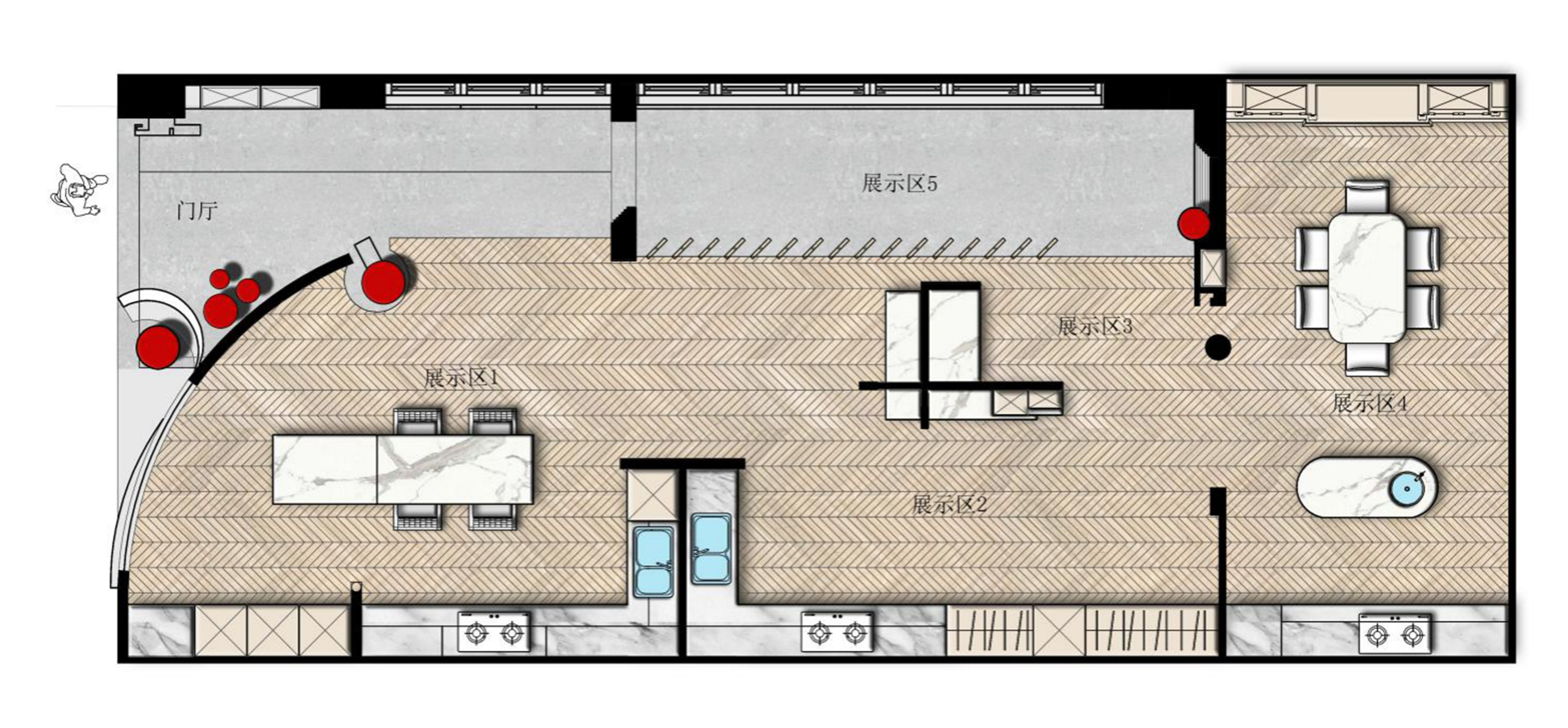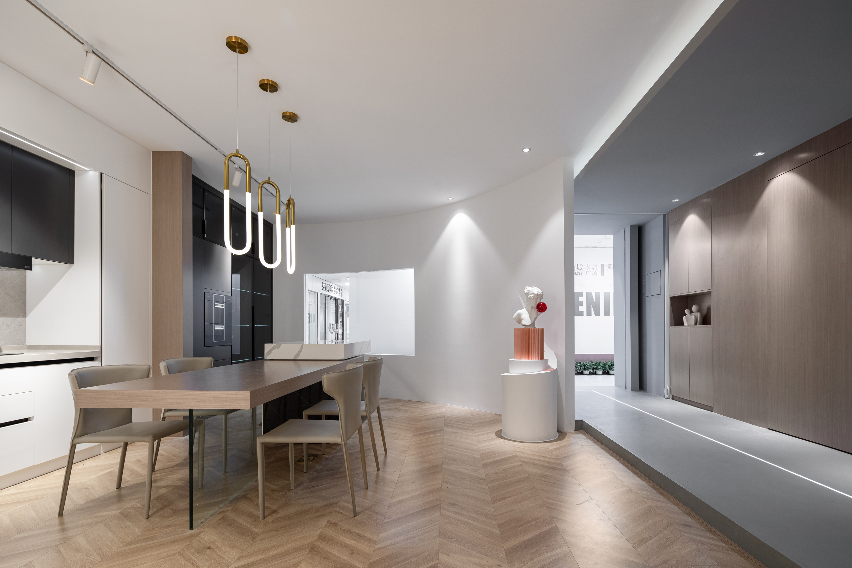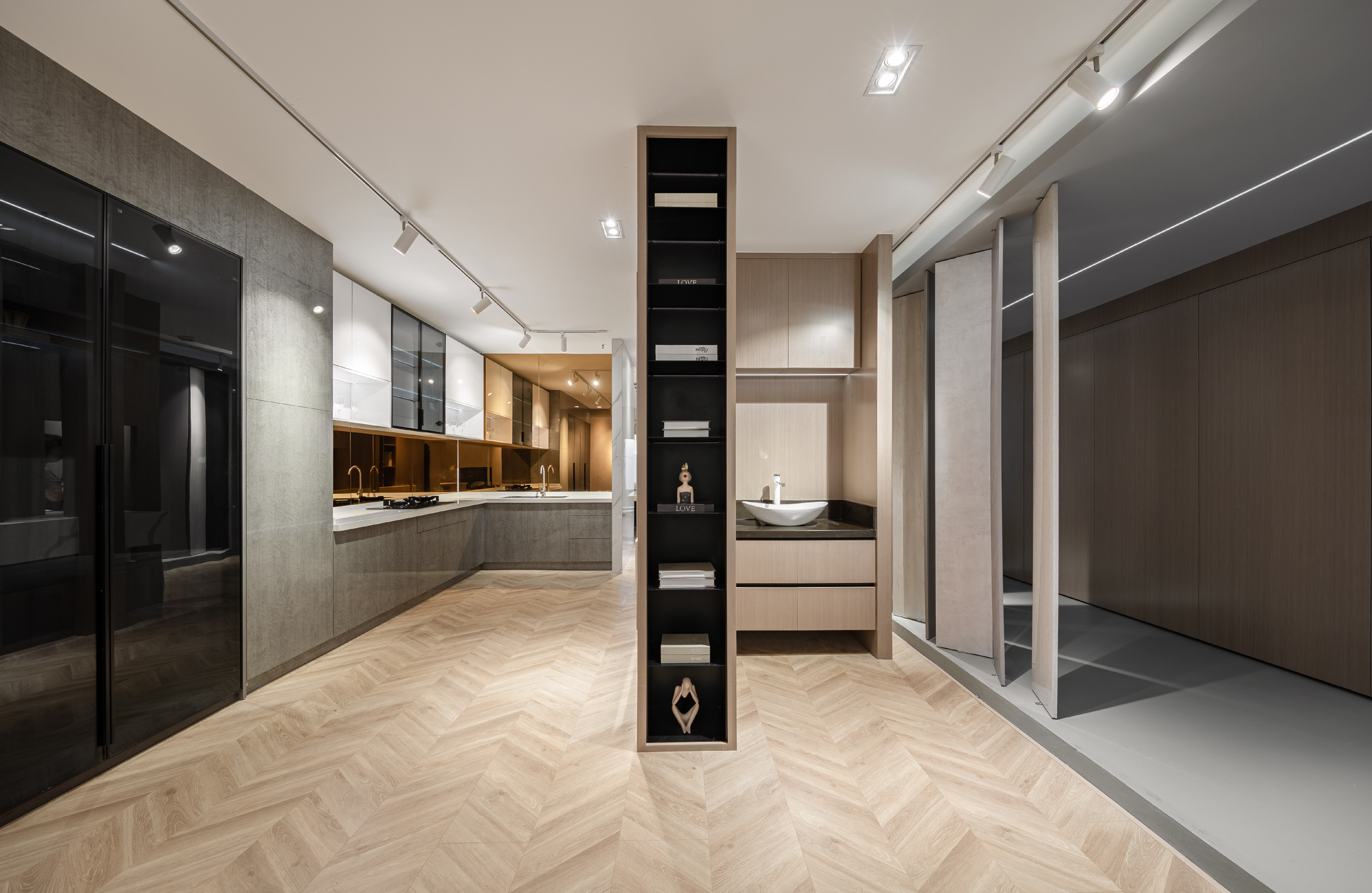 空间布局:进入展厅空间,在橱柜的分割上我们用整个体块内部切割的操作手法使其分色,并且两个立面都出现了多条平行的L形线。岛台的放置又使整体的平衡感增强。