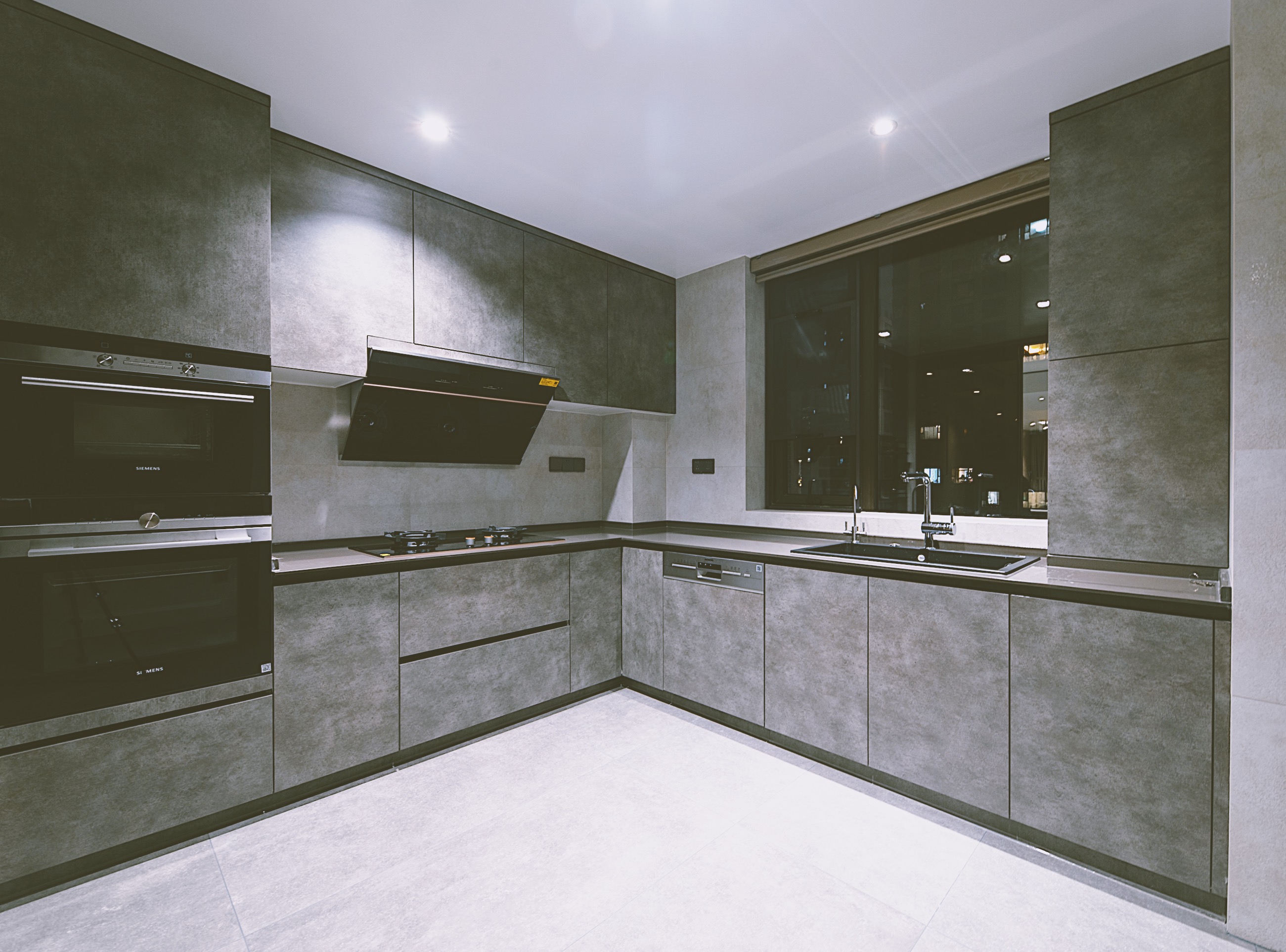 空间意境:墙面部分的水磨石铺贴符合当下的流行趋势,与黑色的柜体搭配呈现一种雅致的美感。