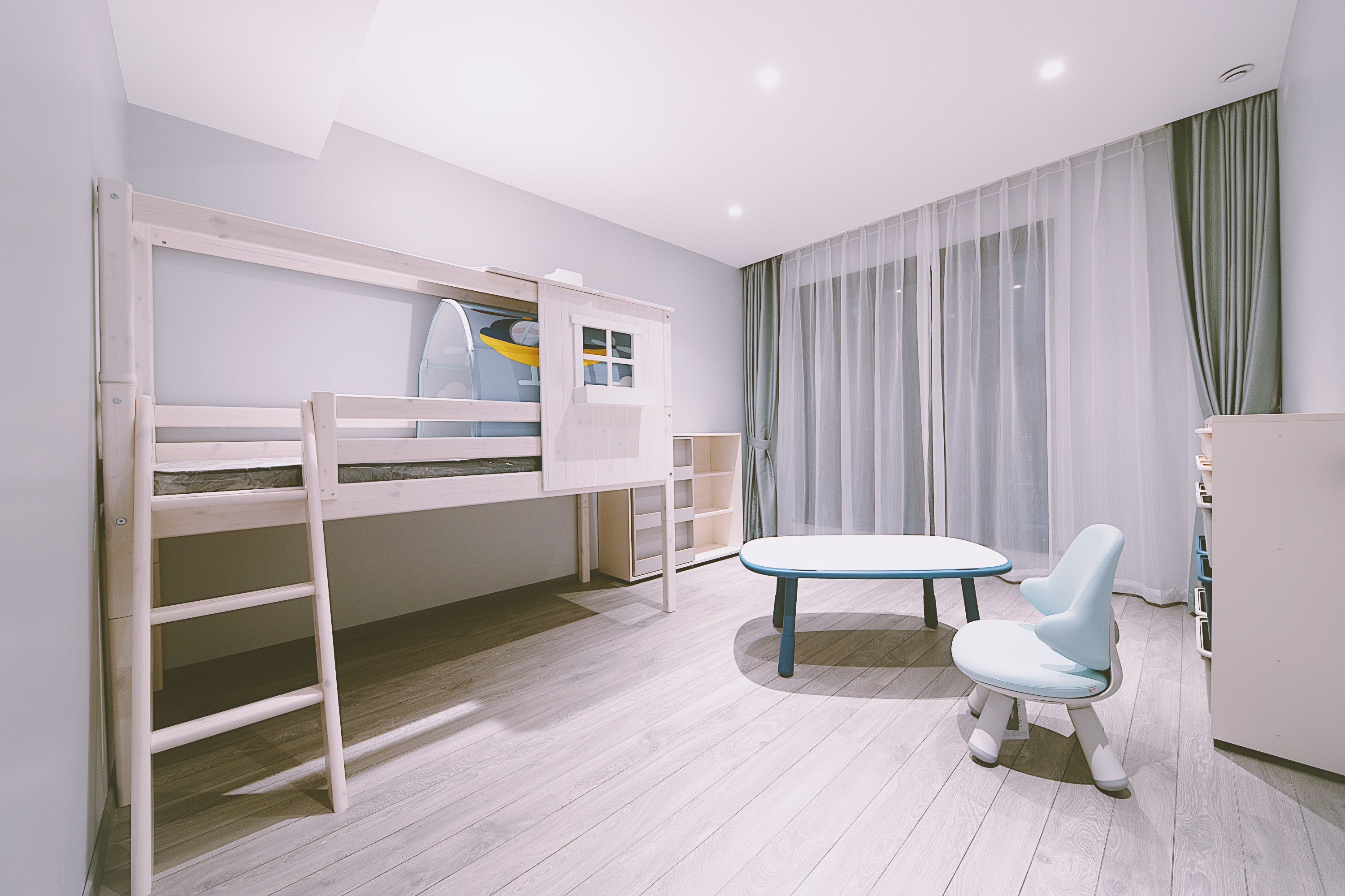 儿童房选择清新随性的蓝色,为孩子的创造力留满了发挥空间,整体的格调也非常符合小朋友可爱的性格。