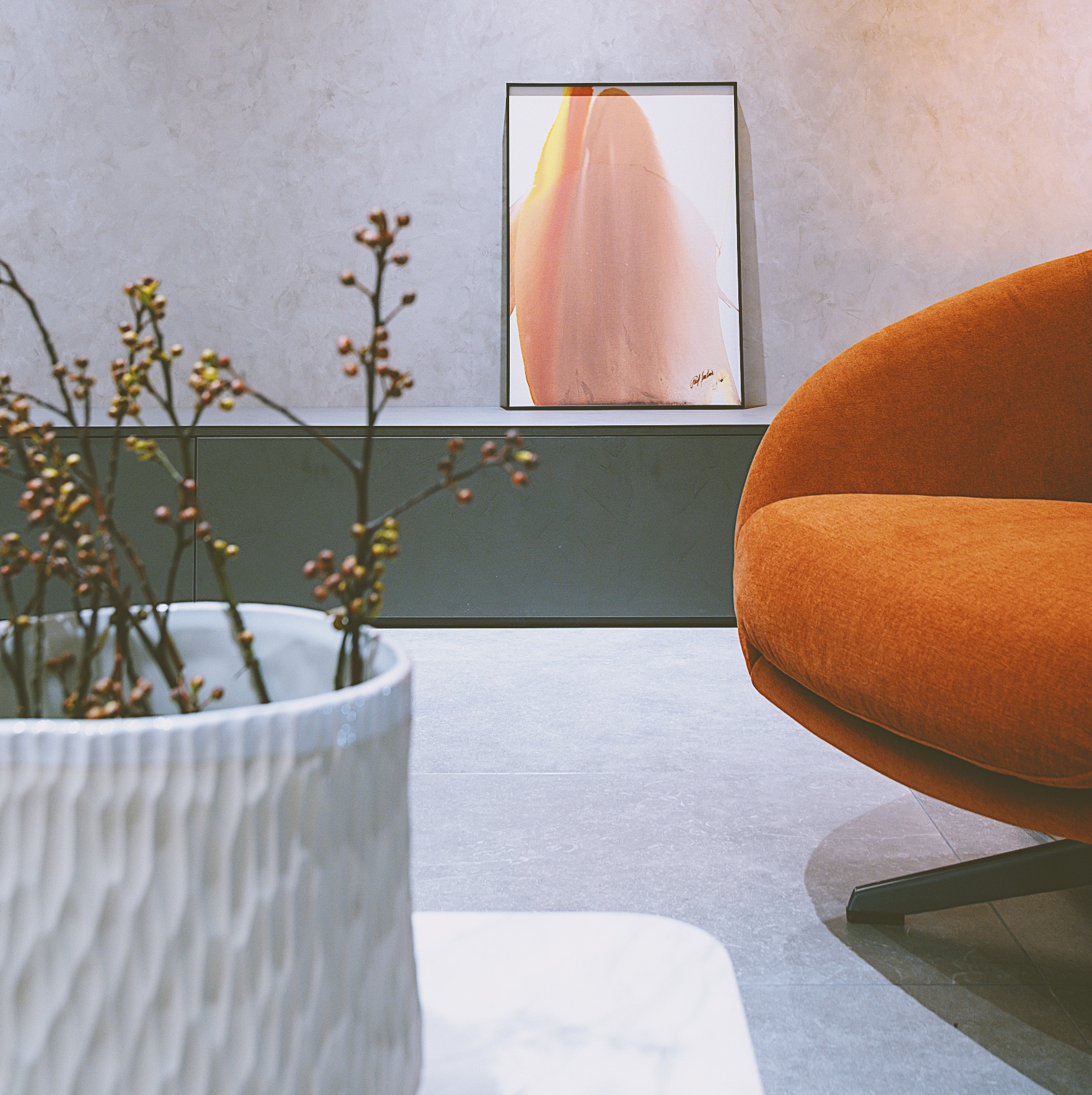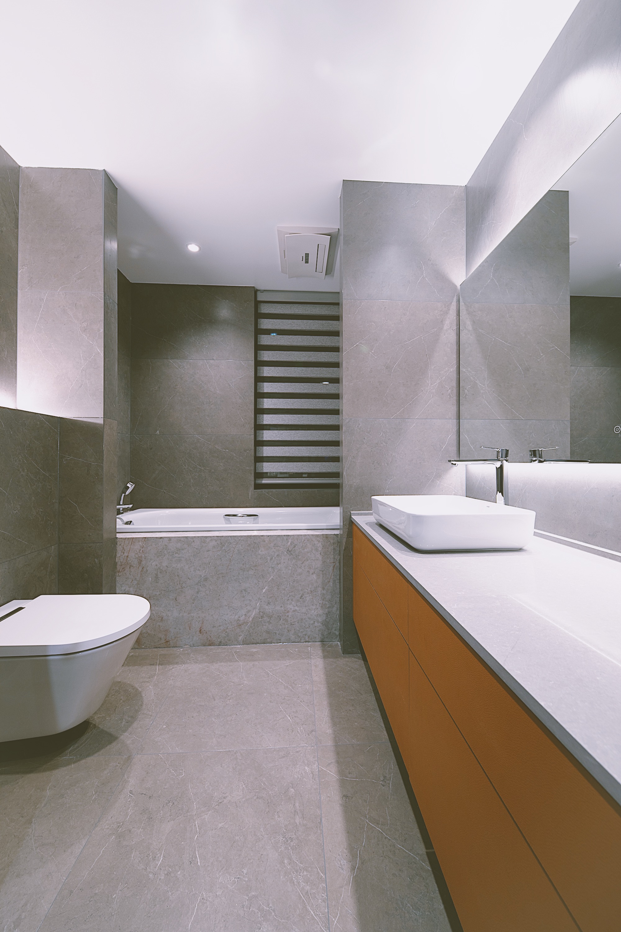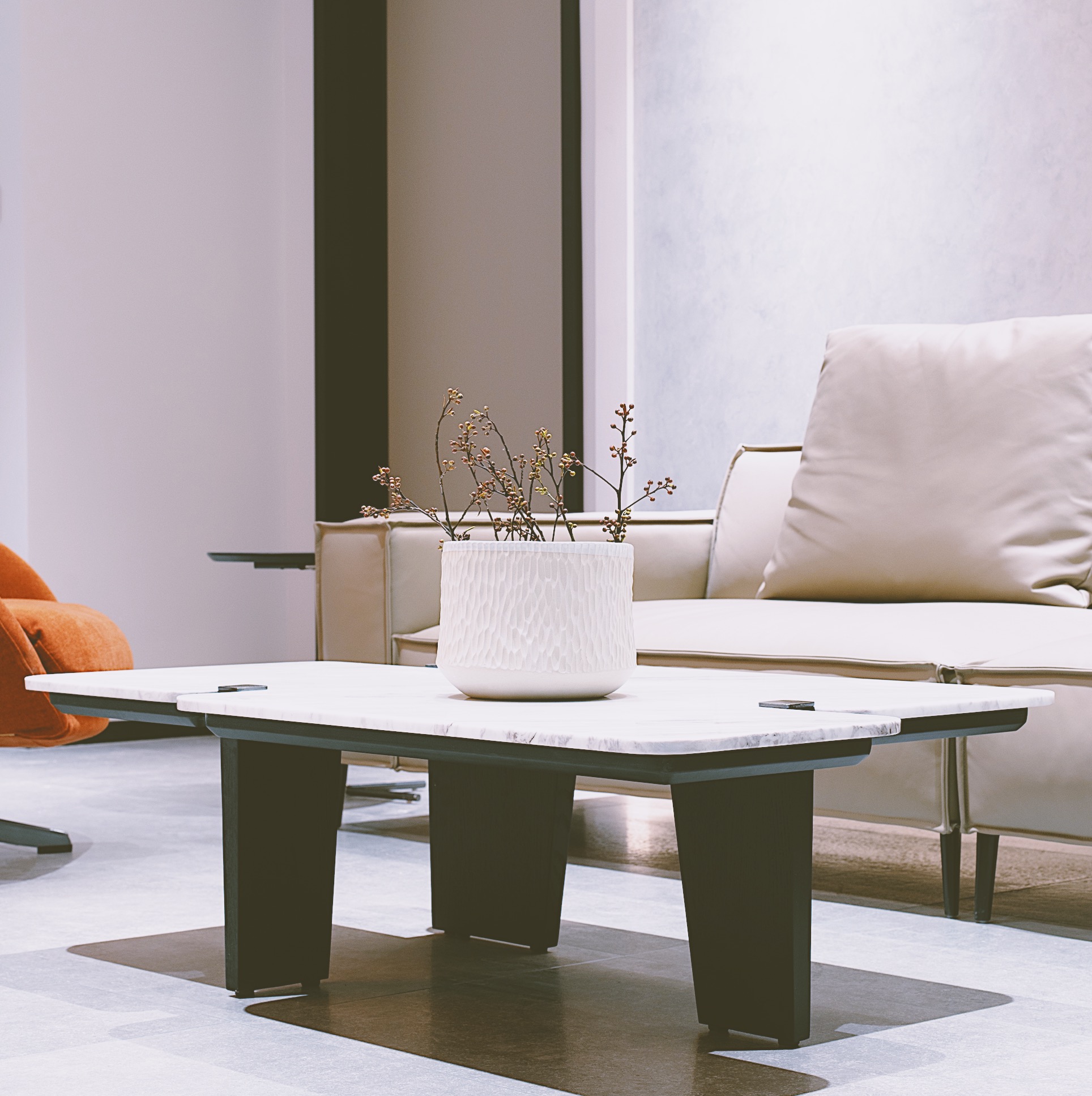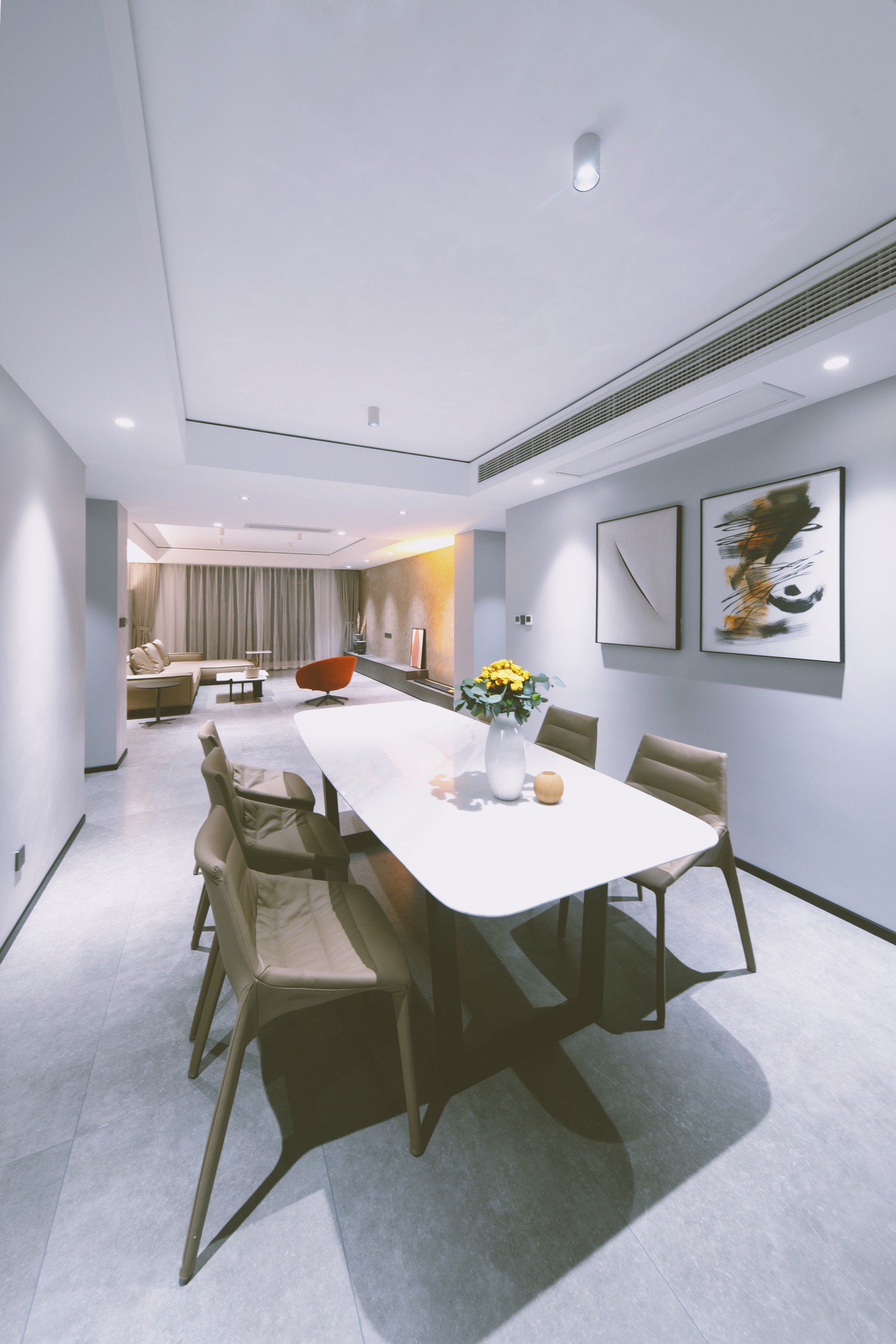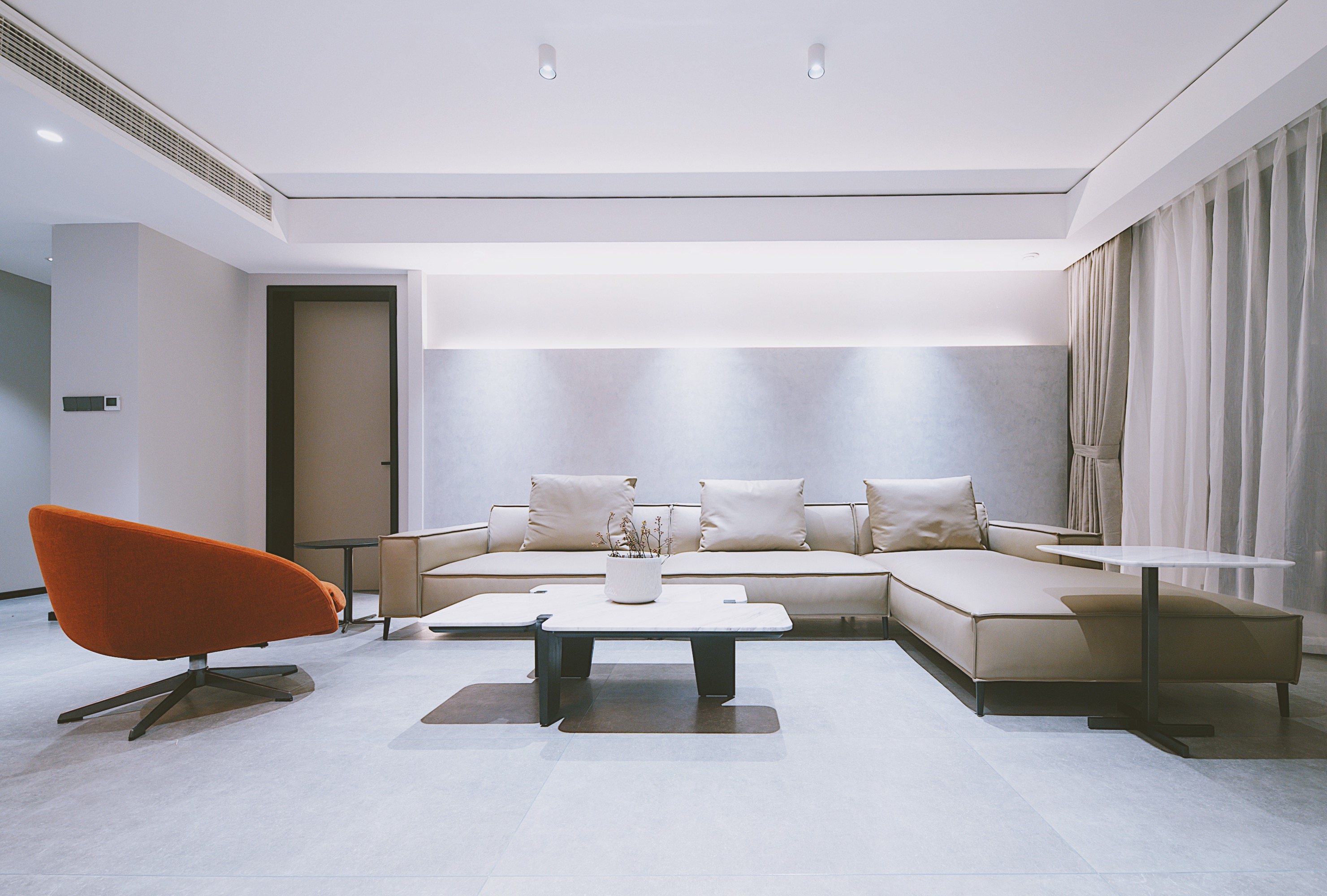 项目定位:这套大平层属于一个四口之家,父母与兄弟两人,他们对设计的要求简直可以用苛刻来形容。了解了他们喜欢单色、有线条感的图形和内饰,所以以现代极简风格为基调,明亮的橘色皮革来点缀。