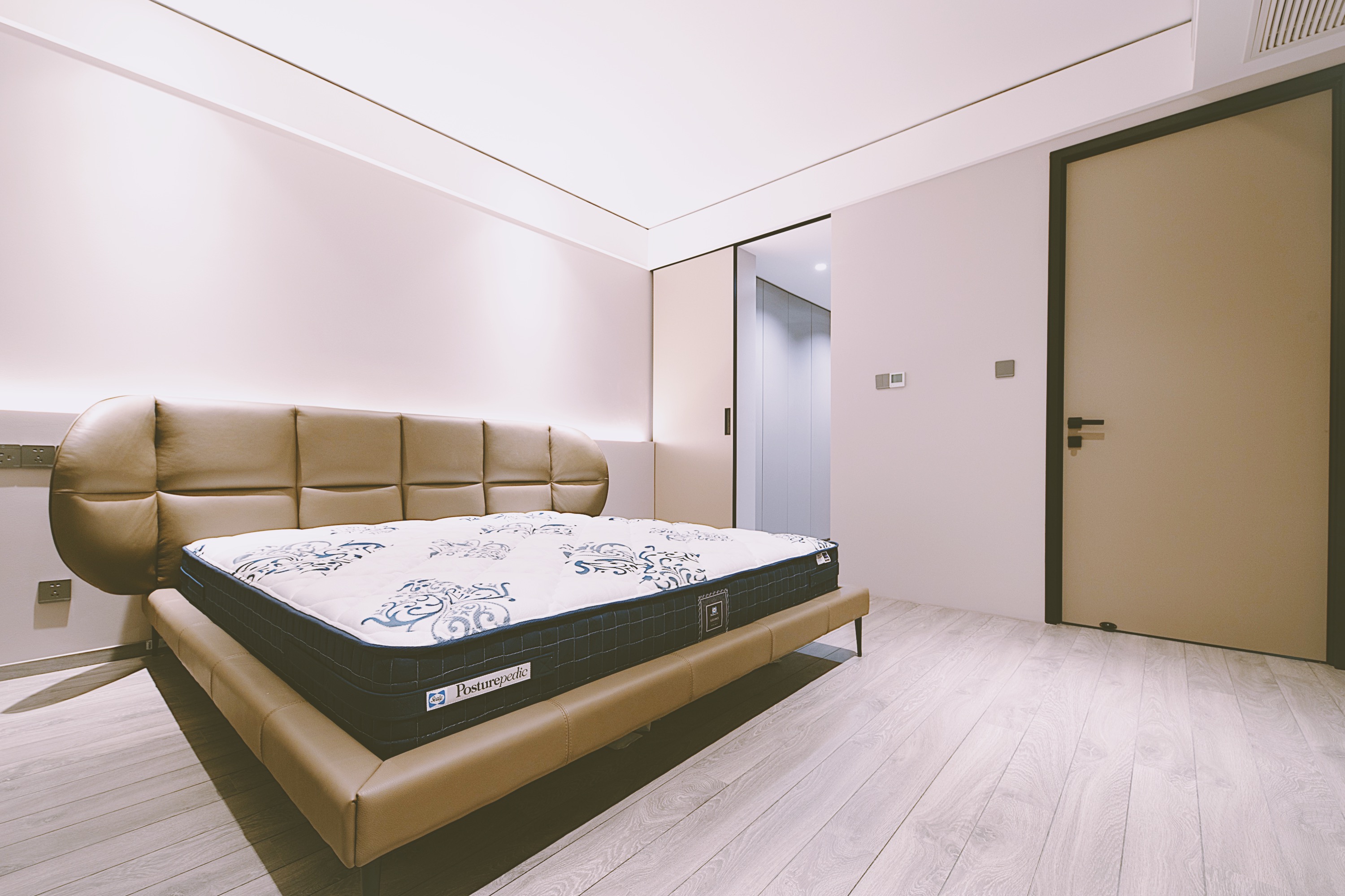 主卧室的配色方案更为温馨,材质以干净简约的乳胶漆为主。