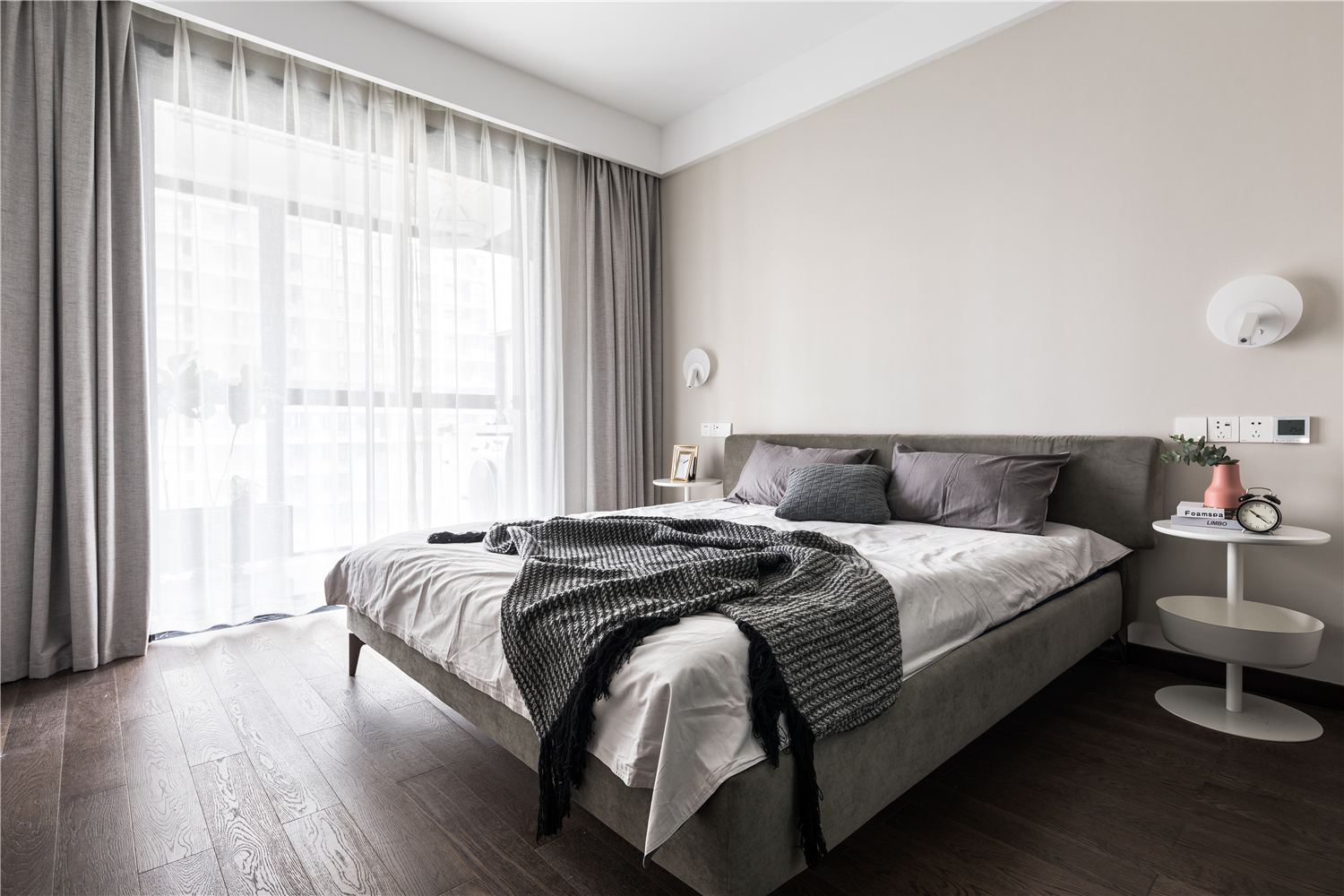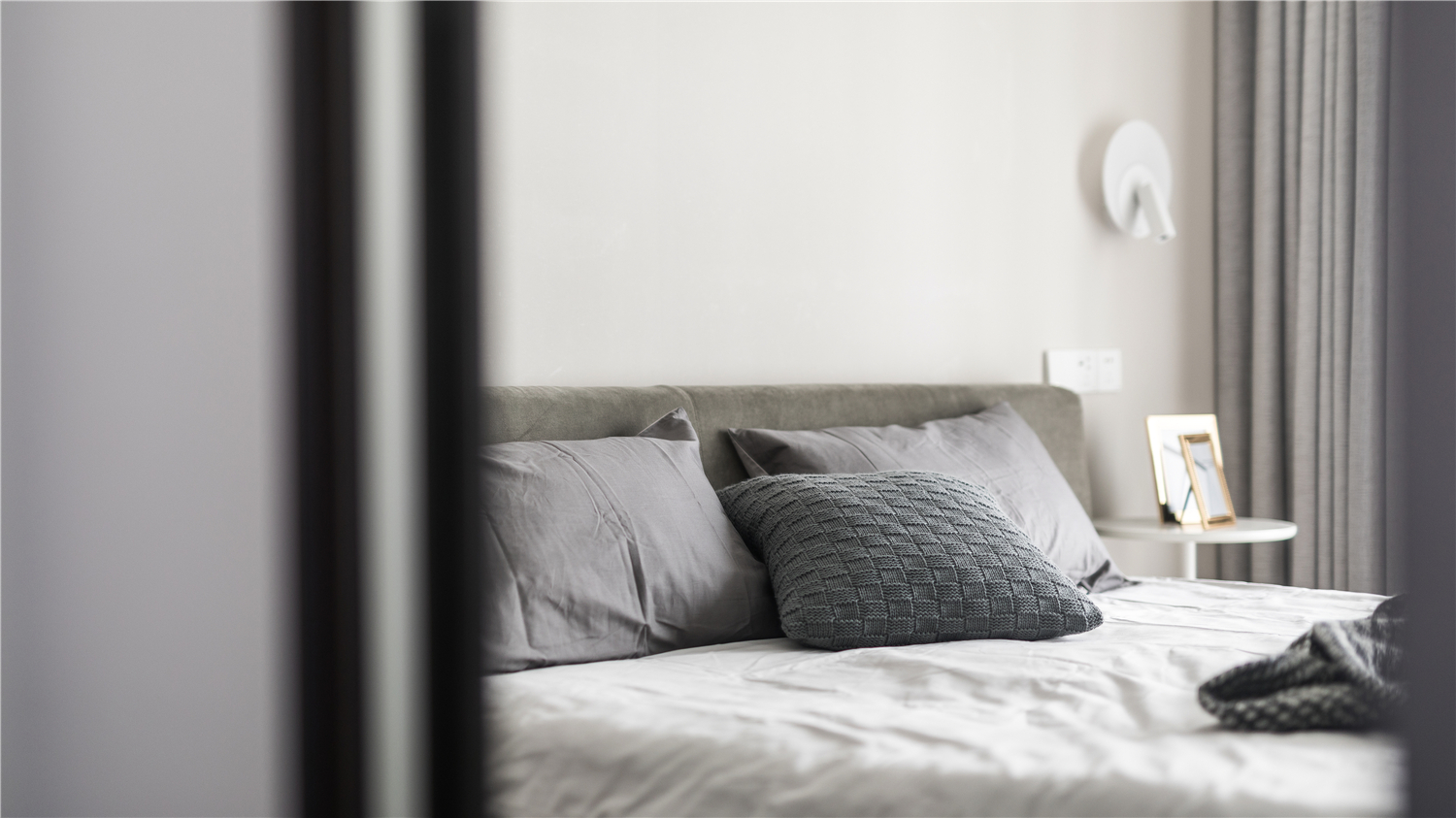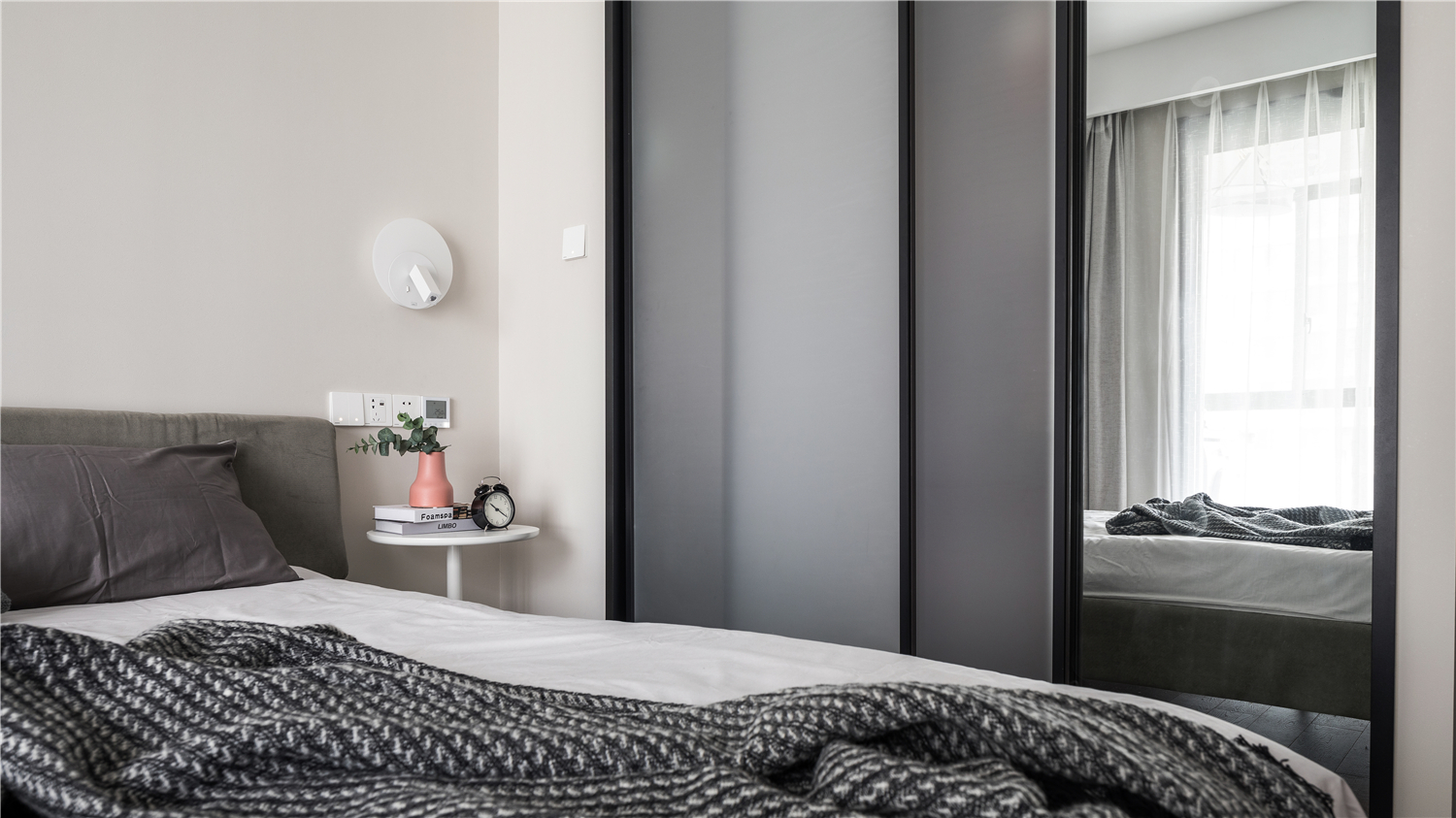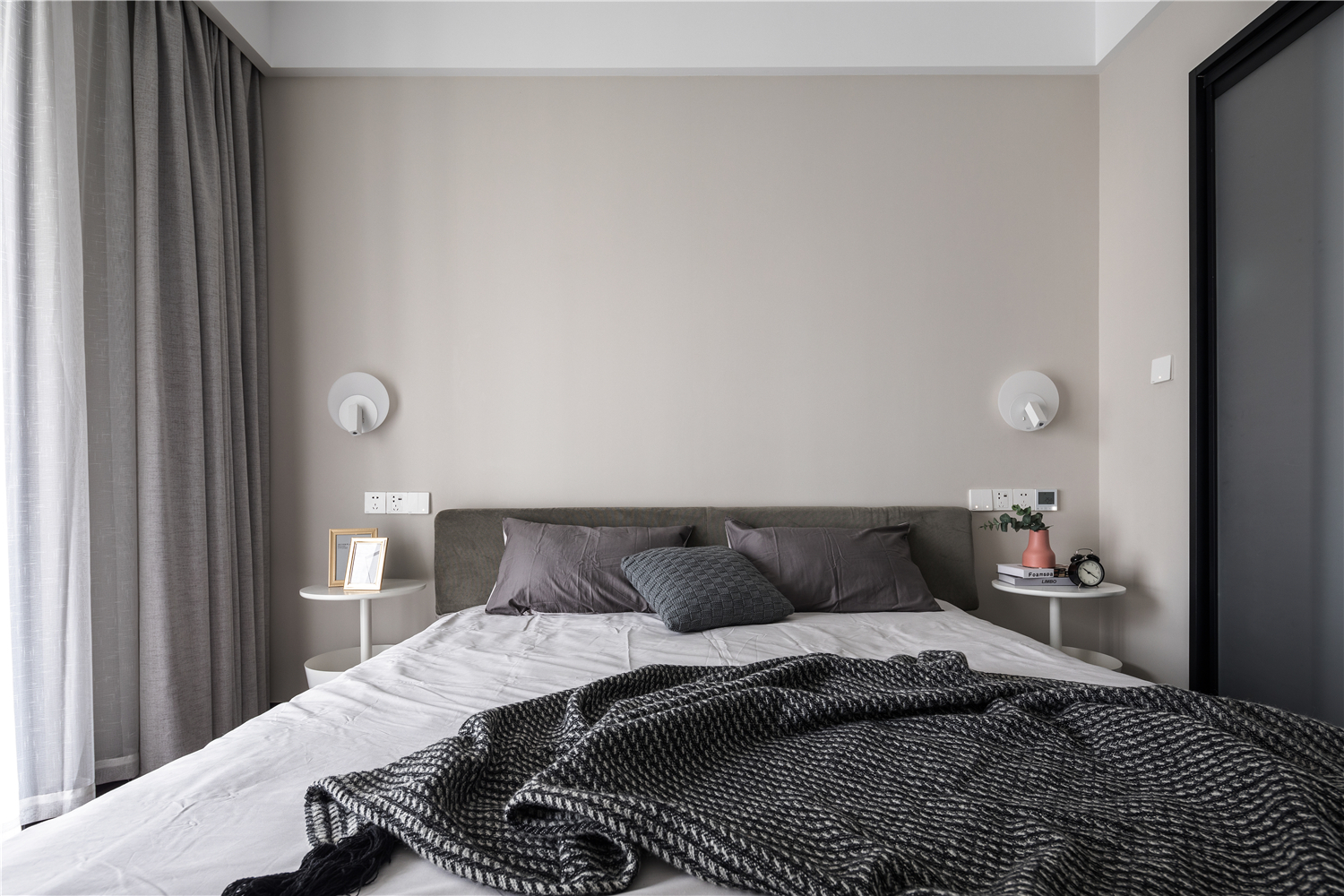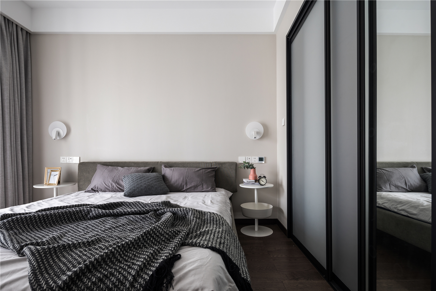 主卧是整个居家环境中相对私密的空间,整个空间以饱和度较低的色调为基底,少量的黑胡桃材质,搭配灰绿色 -