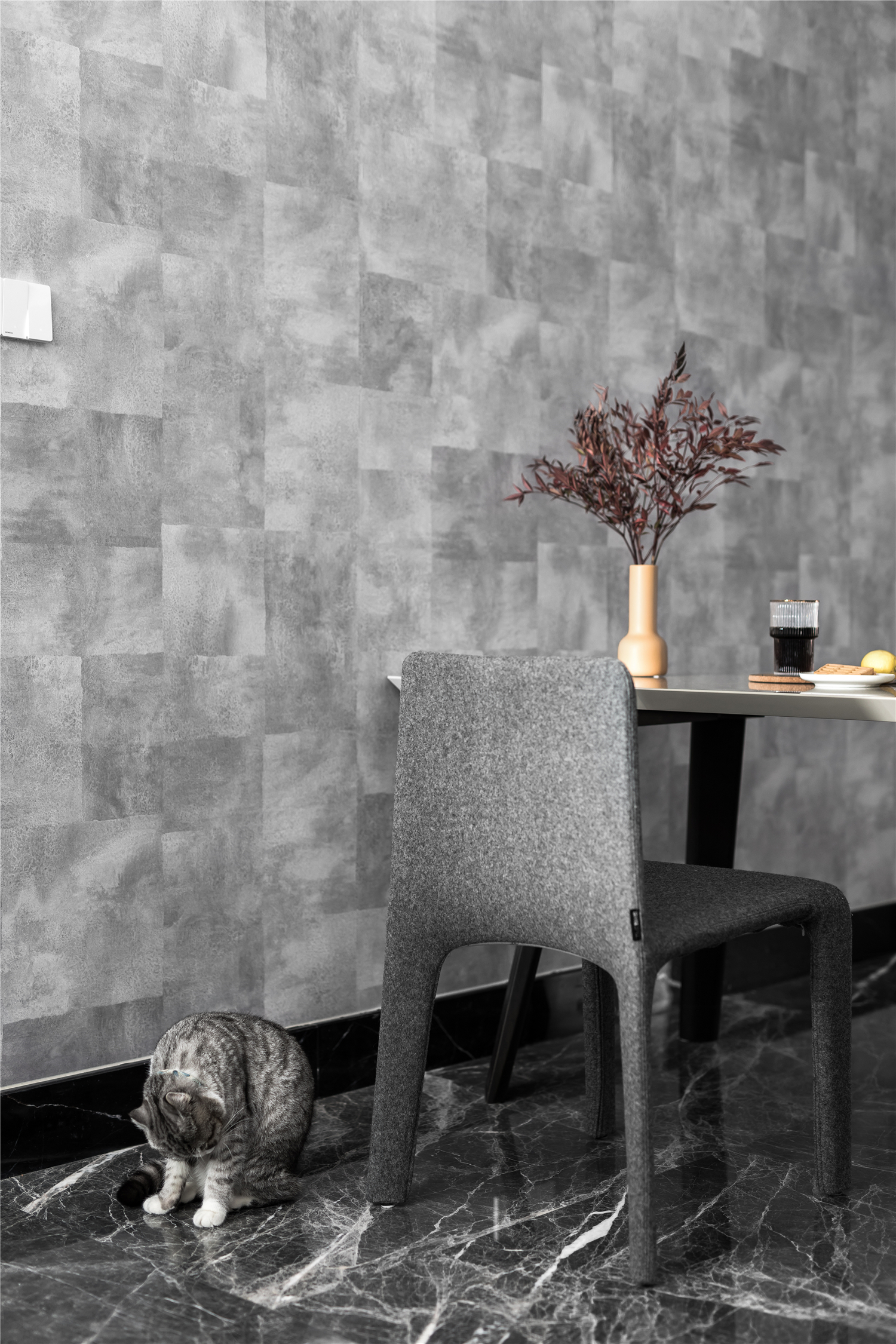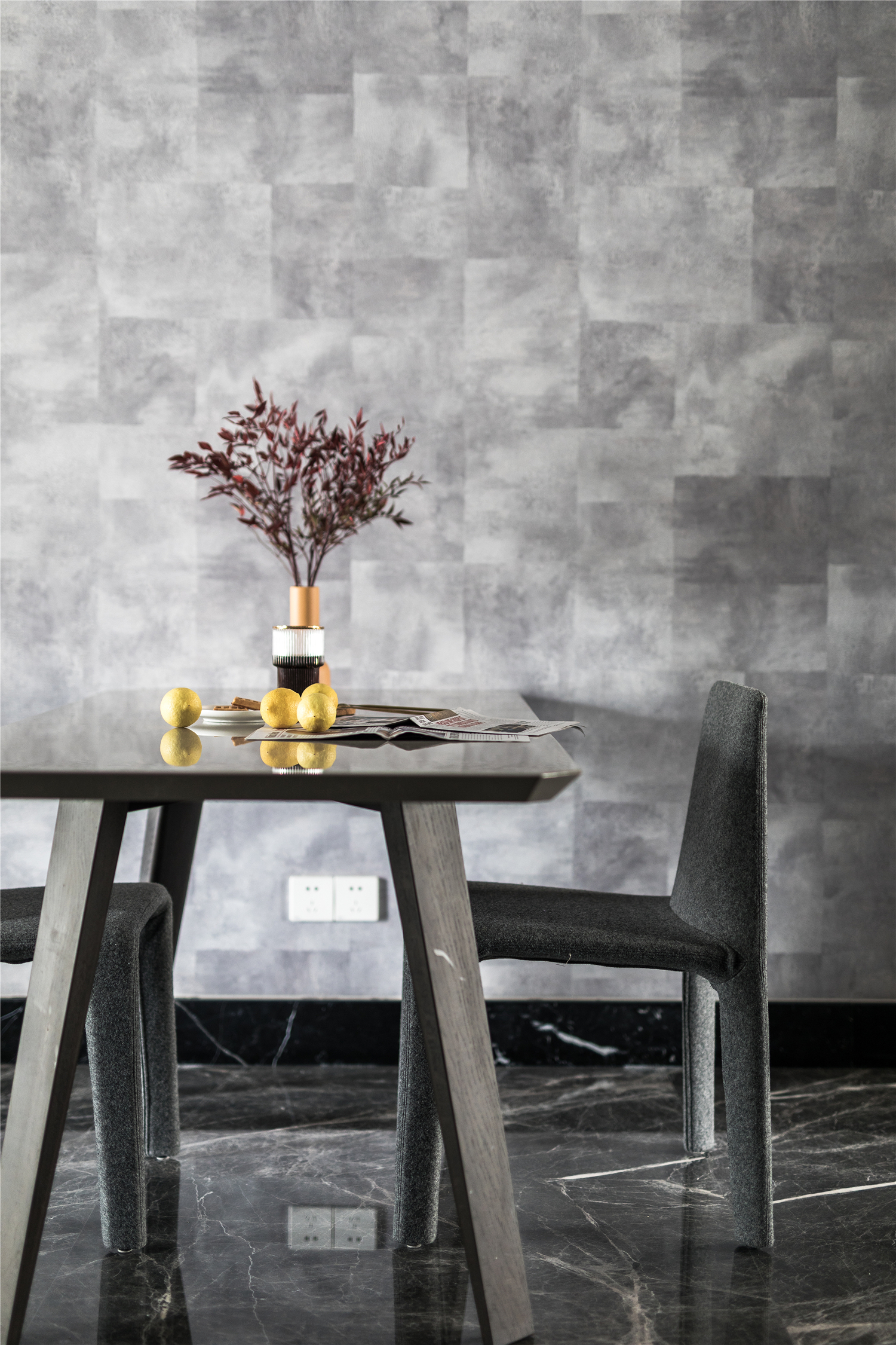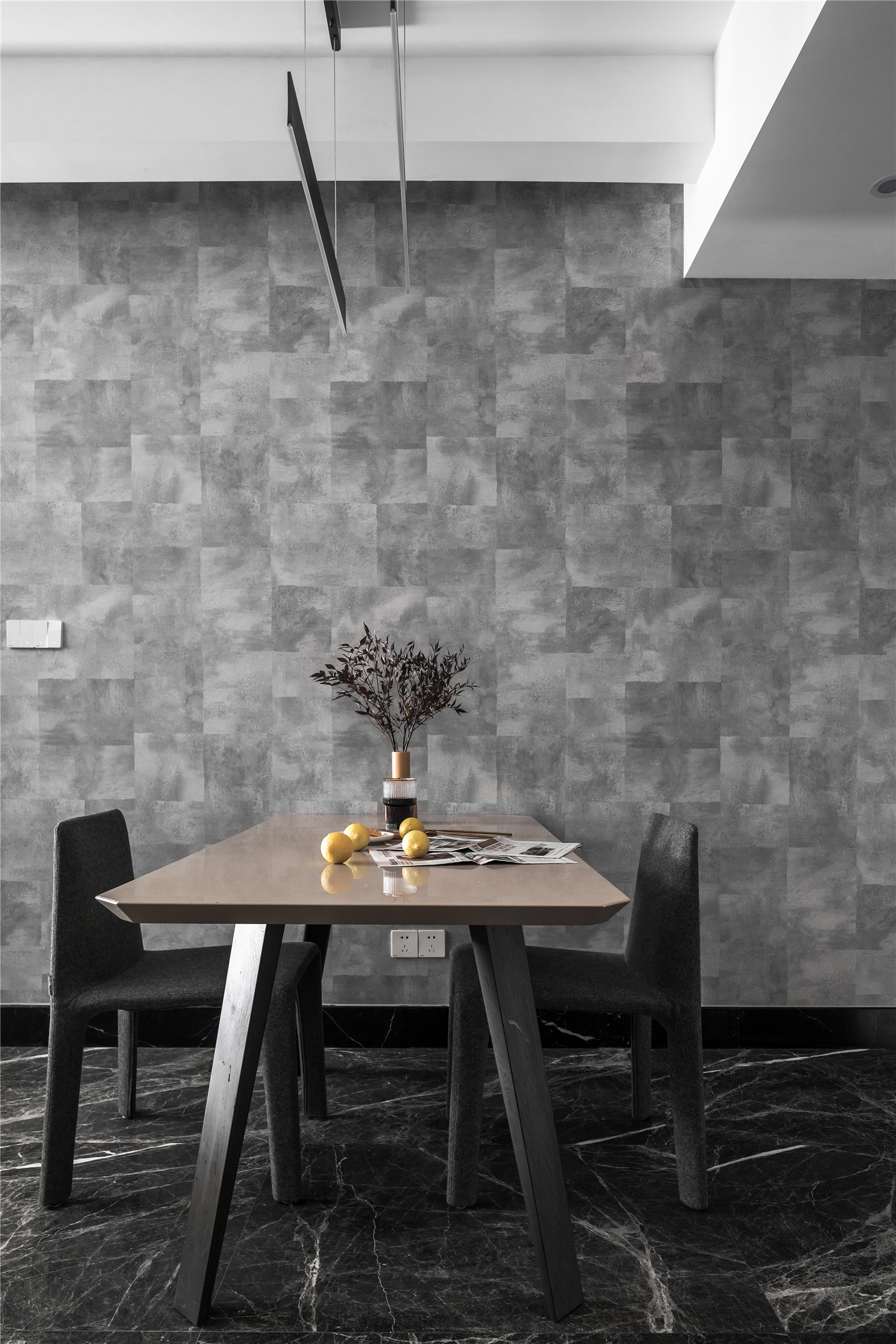 设计选材:餐桌的灰色作为中性色几乎可以搭配所有颜色,带给人冷静的感觉,此时大胆搭配了材质特殊的羊毛餐椅,再配以酷感十足的咖色金属吊灯,让整个空间既有灰色调的时尚感,又透着一丝优雅的气质。