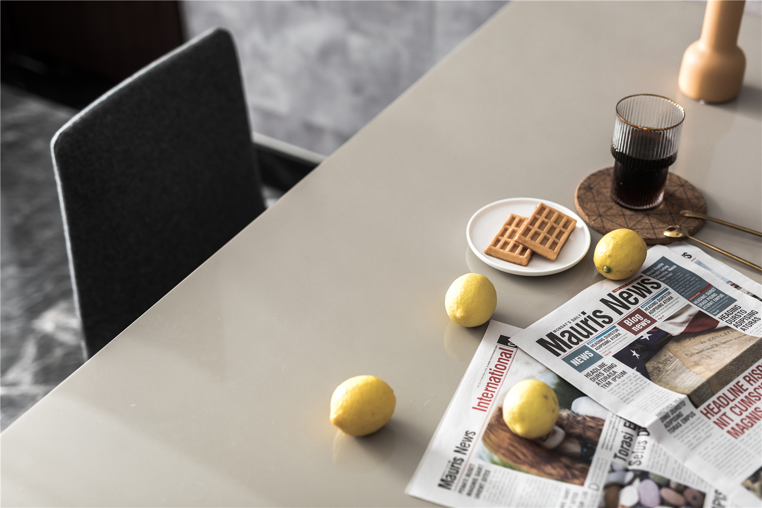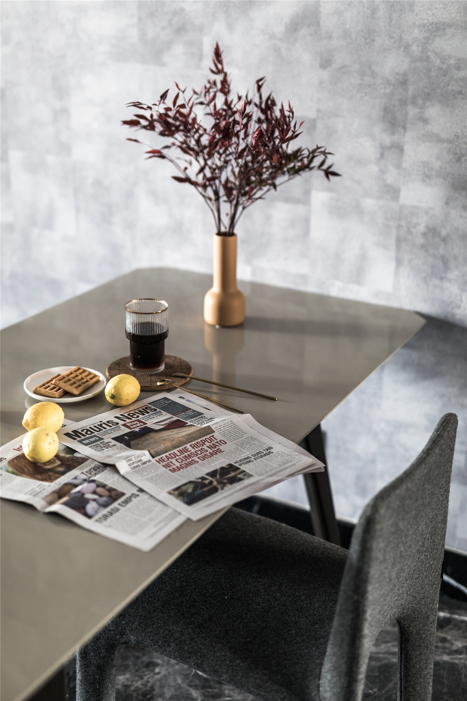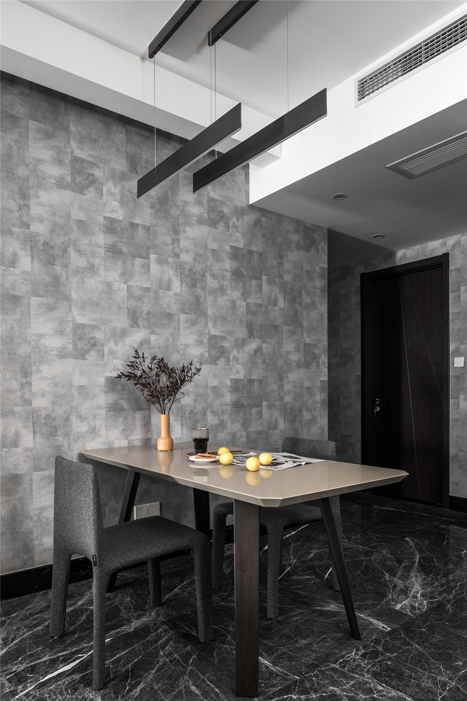 设计选材:餐桌的灰色作为中性色几乎可以搭配所有颜色,带给人冷静的感觉,此时大胆搭配了材质特殊的羊毛餐椅,再配以酷感十足的咖色金属吊灯,让整个空间既有灰色调的时尚感,又透着一丝优雅的气质。