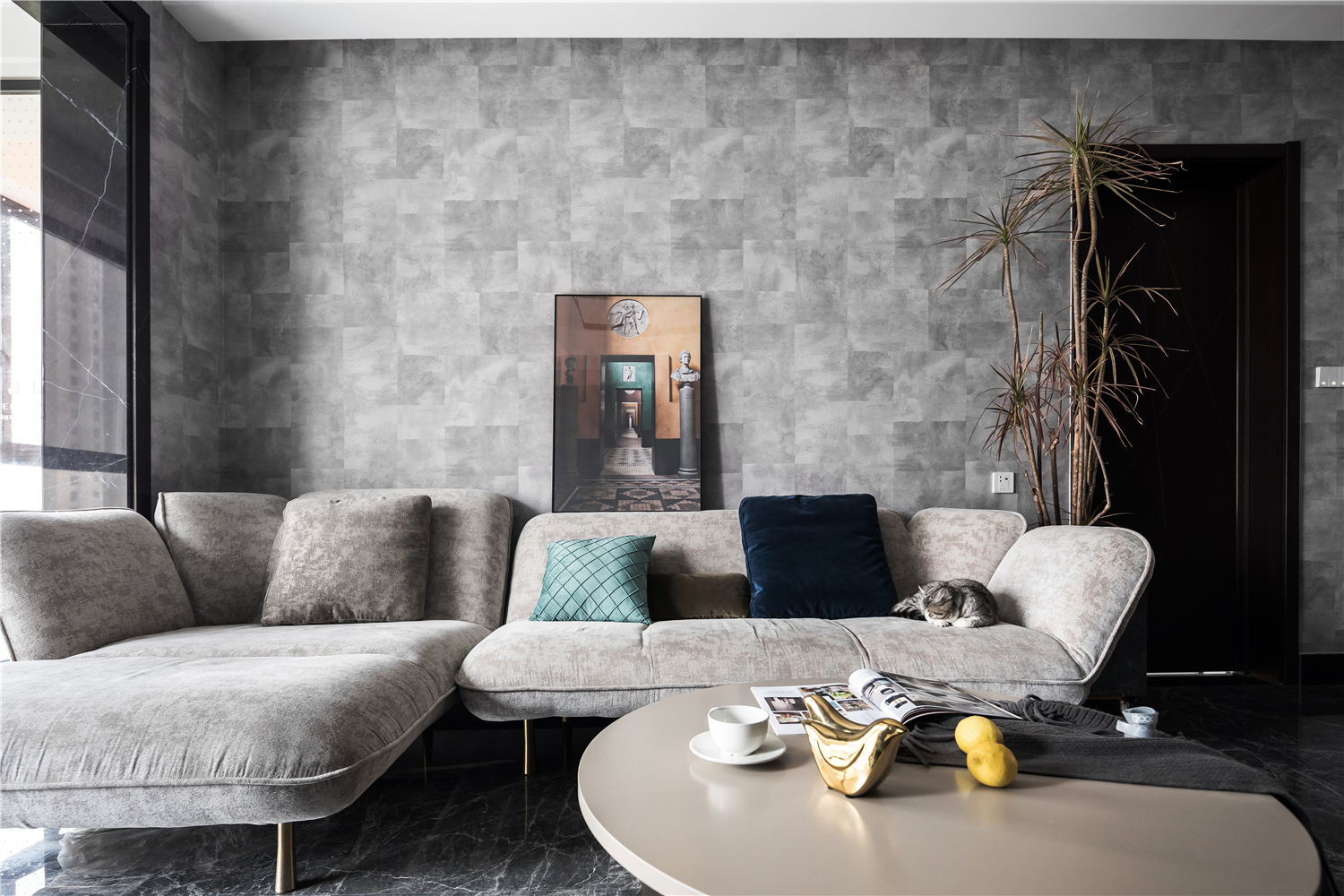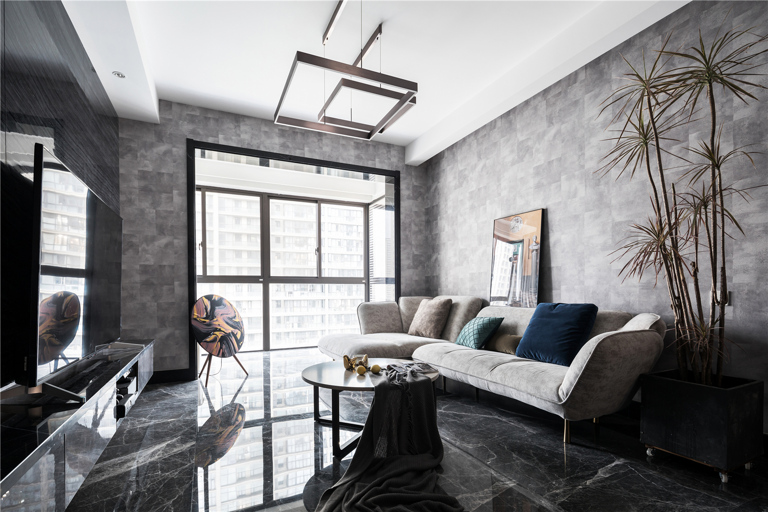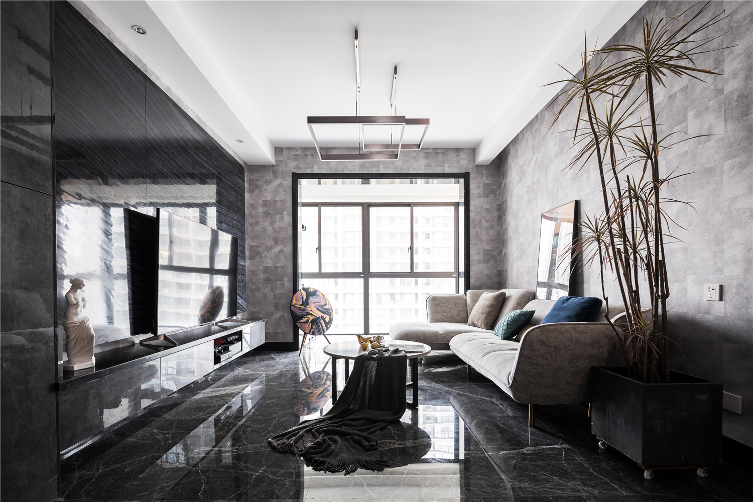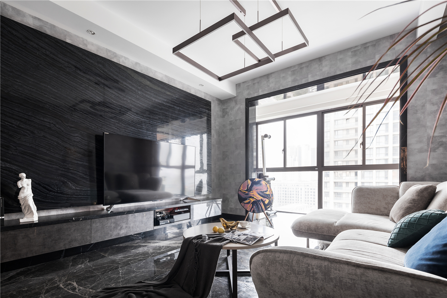 空间意境:电视背景采用黑色大理石,背后和顶部的灯带在夜晚烘托出一个舒适幽静的观影氛围。清浅的冰川灰沙发点缀丝绒质感的抱枕,似乎沾染了阳光的温度,平衡了之间的色彩关系。