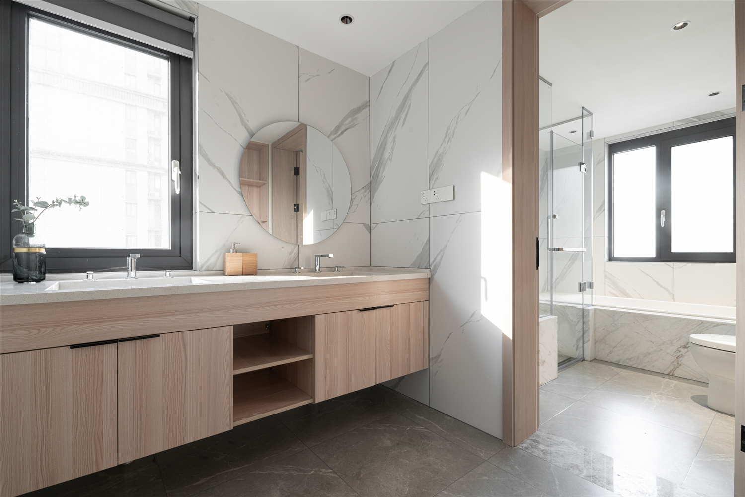 ⑥ 内卫做了干湿分离的设计,干区做了双台盆以保证使用率最大化,湿区同时保留了淋浴区与浴缸,保证了主人在生活档次上的一定需求。