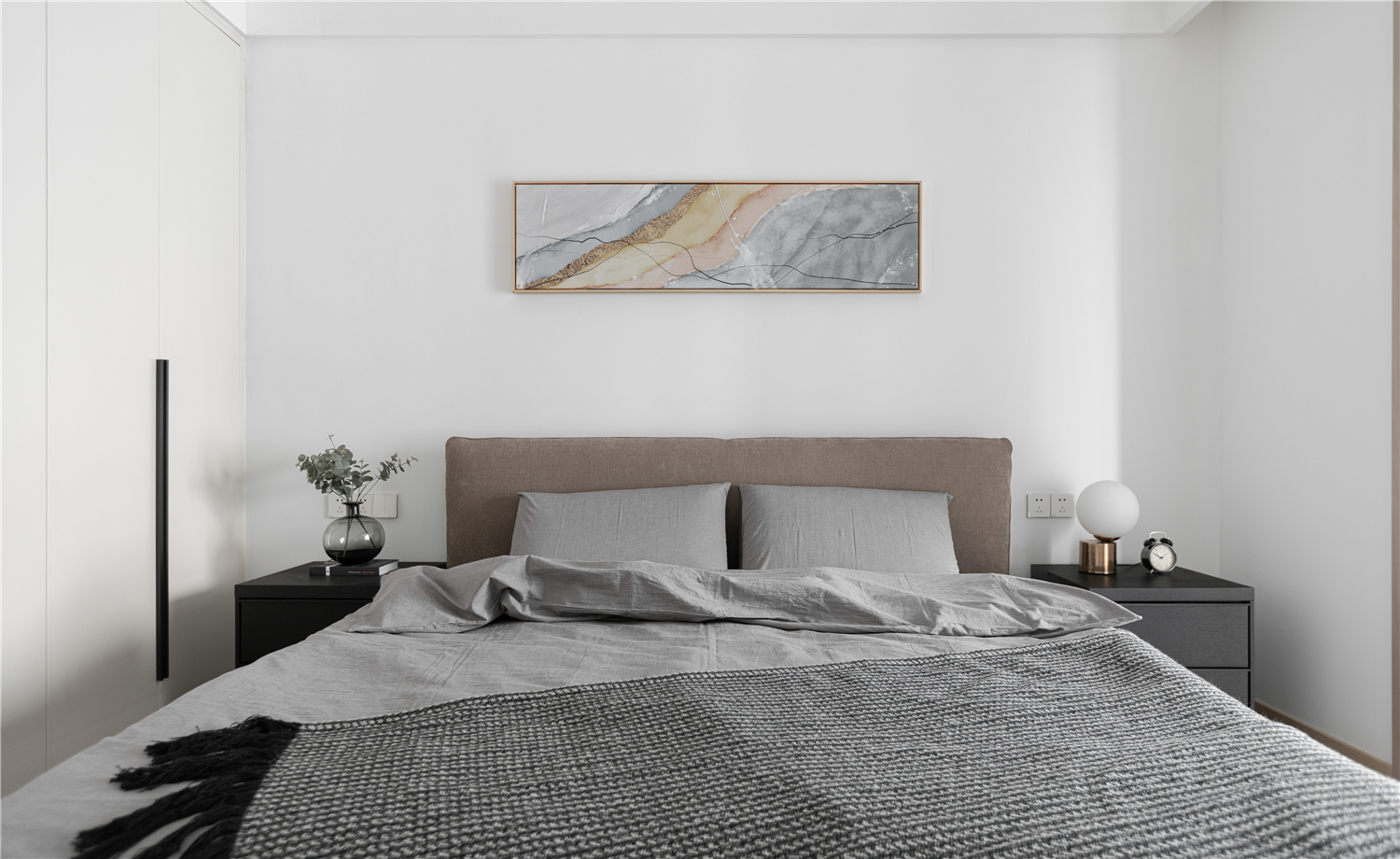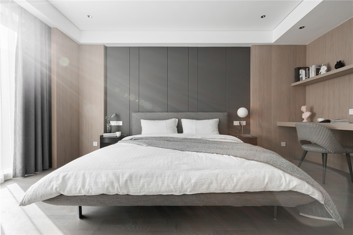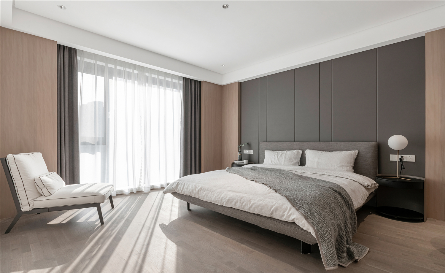 主卧将简洁做到了极致,木色和白色是最舒服的色系,而灰色又是最包容最内涵的颜色,可以给疲惫的身心一个放松的港湾。从睡眠的需求和体悟出发,在这个休息为主要功能的容器里,装进去最舒适的颜色和材质,打造一个纯粹的、本真的兼具审美的睡眠空间。