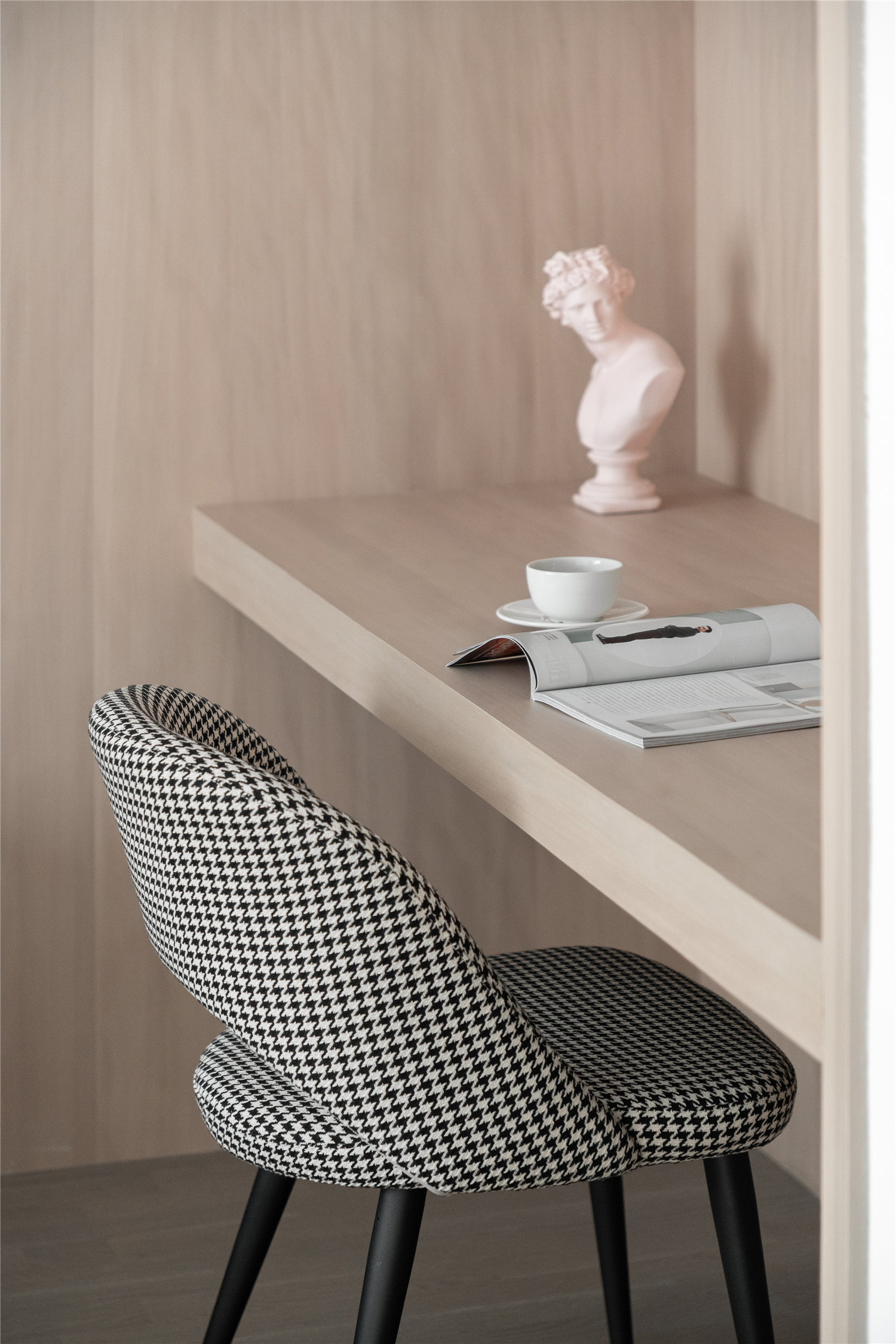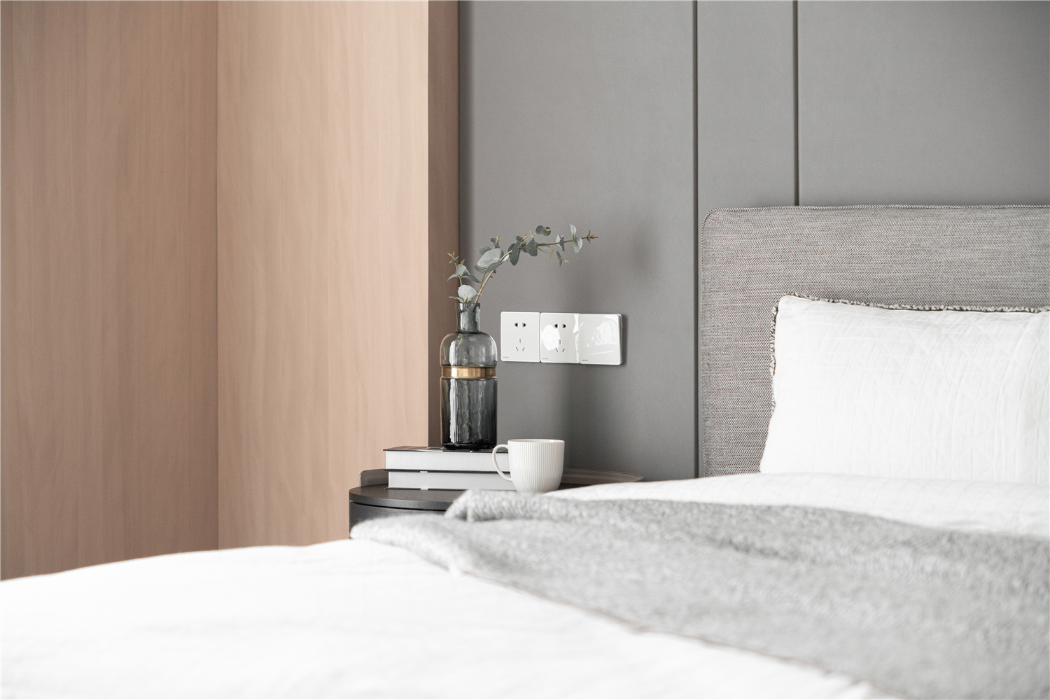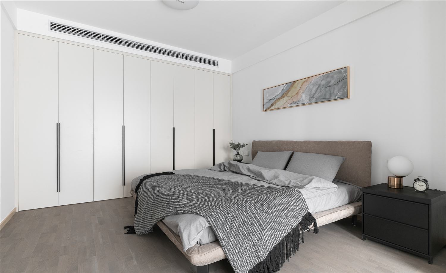 主卧将简洁做到了极致,木色和白色是最舒服的色系,而灰色又是最包容最内涵的颜色,可以给疲惫的身心一个放松的港湾。从睡眠的需求和体悟出发,在这个休息为主要功能的容器里,装进去最舒适的颜色和材质,打造一个纯粹的、本真的兼具审美的睡眠空间。