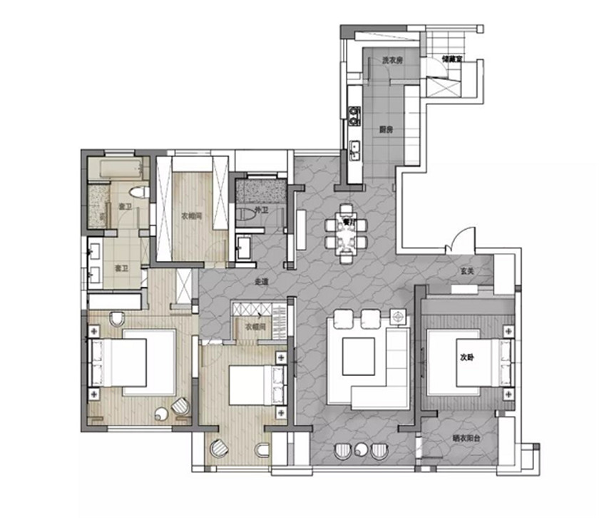 ② 朝南的所有阳台都融入卧室变成景观阳台,保证卧室空间整体性,加强采光。