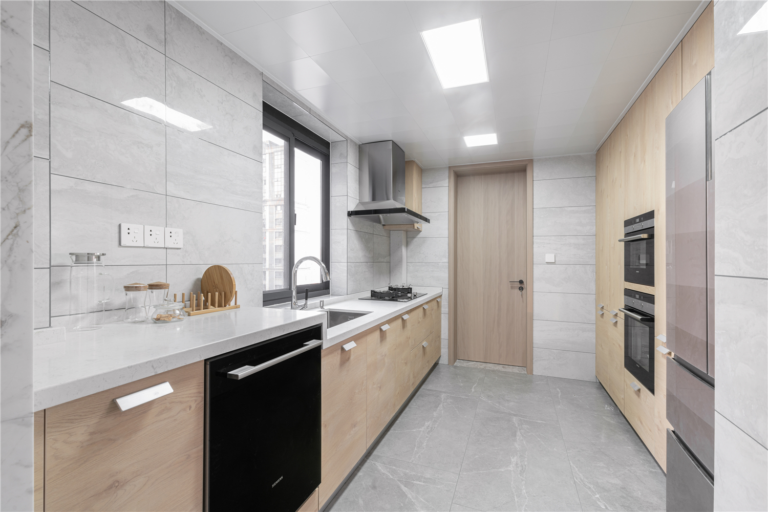 设计选材:暖白色的石材台面,原木色的柜体,与主色调完全呼应的配色,让厨房整体都显得自然清新。