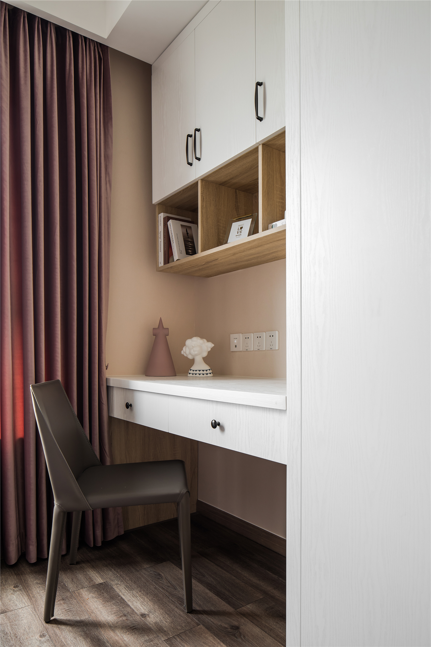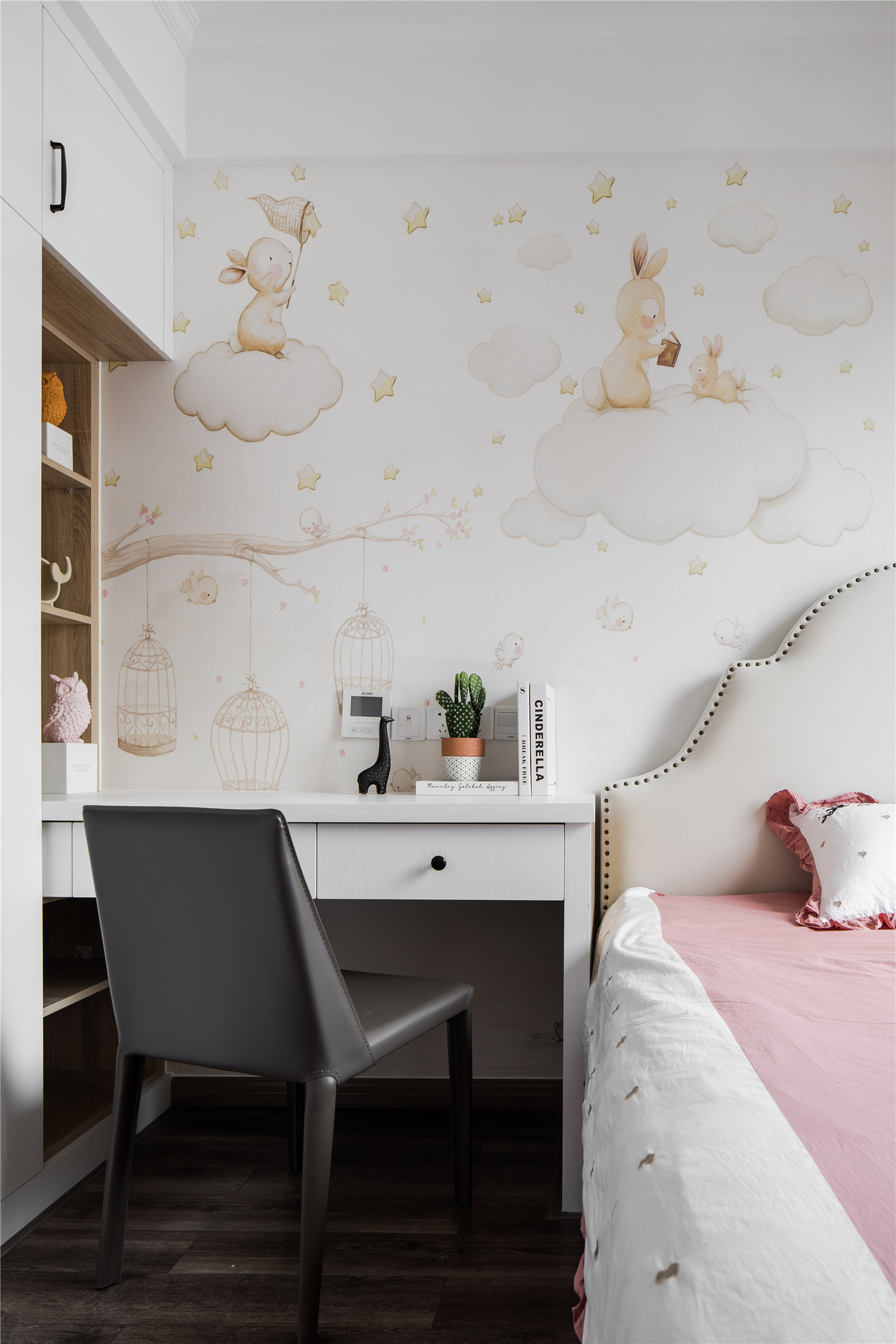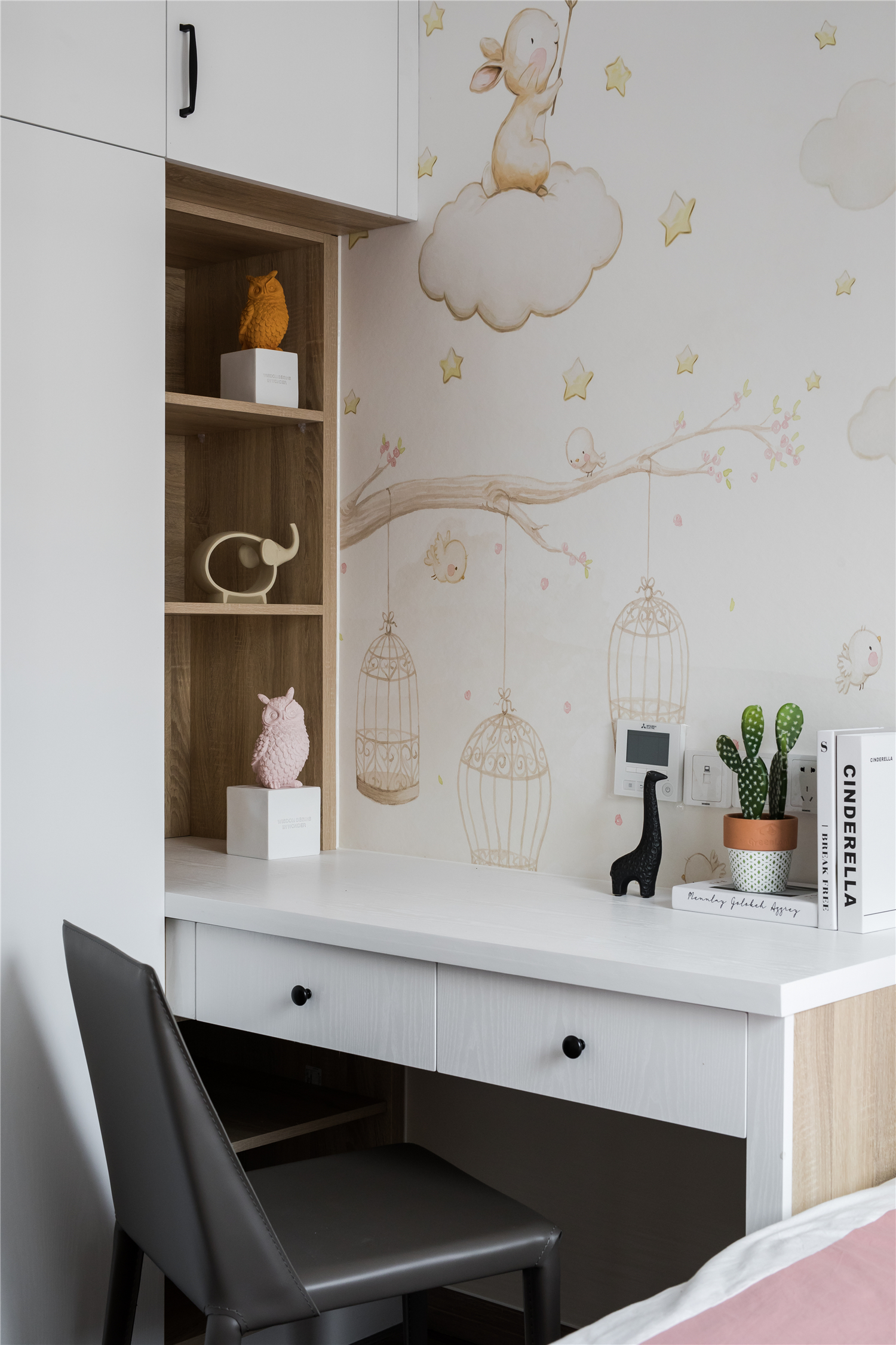儿童房元气甜蜜的珊瑚粉与白色搭配不显过分甜腻,给小公主们一个糖果般的空间。同时做了书桌衣柜一体式,满足了小公主们学习置物的需求。