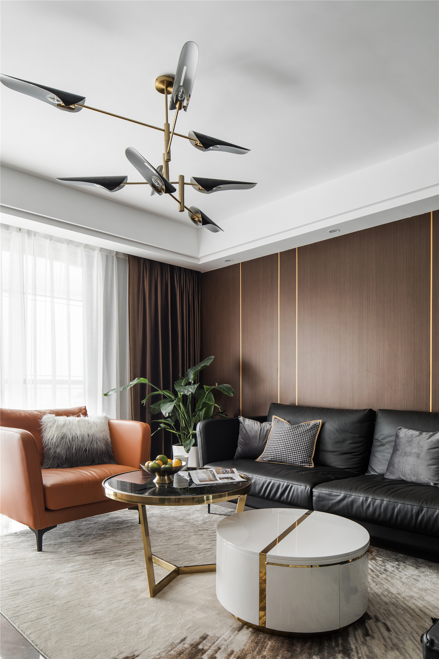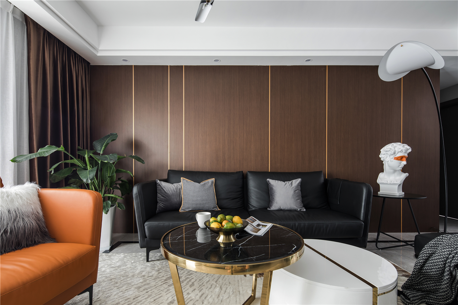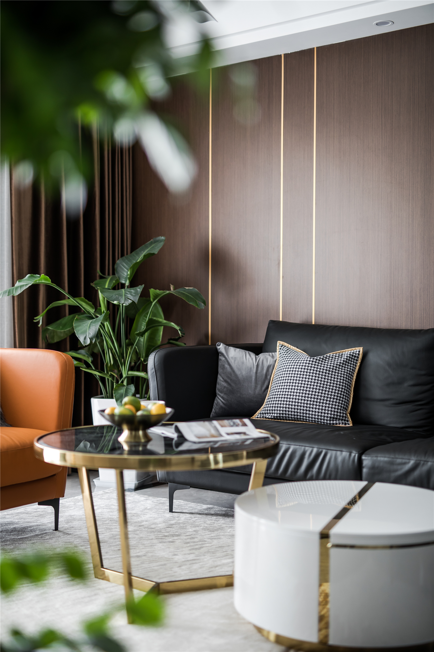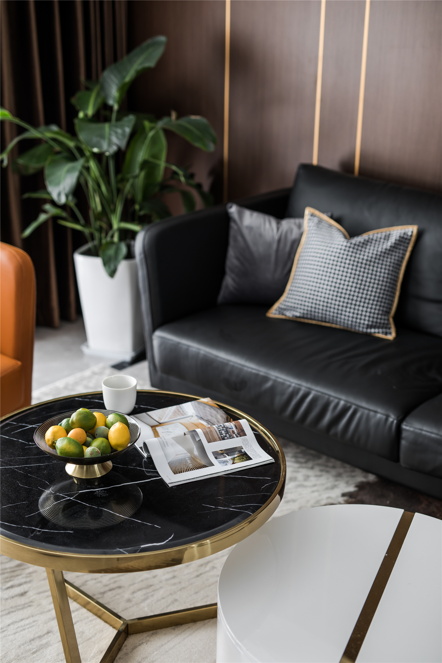 设计选材:简约的家具,黑色的沙发,大理石台面的茶几,再搭配一些金属元素,空间也变得更加精致细腻。