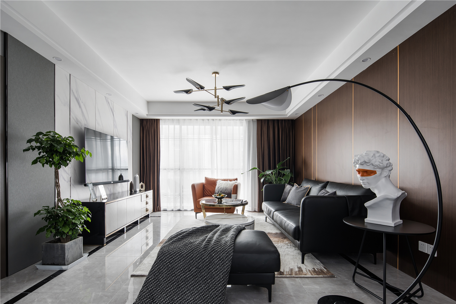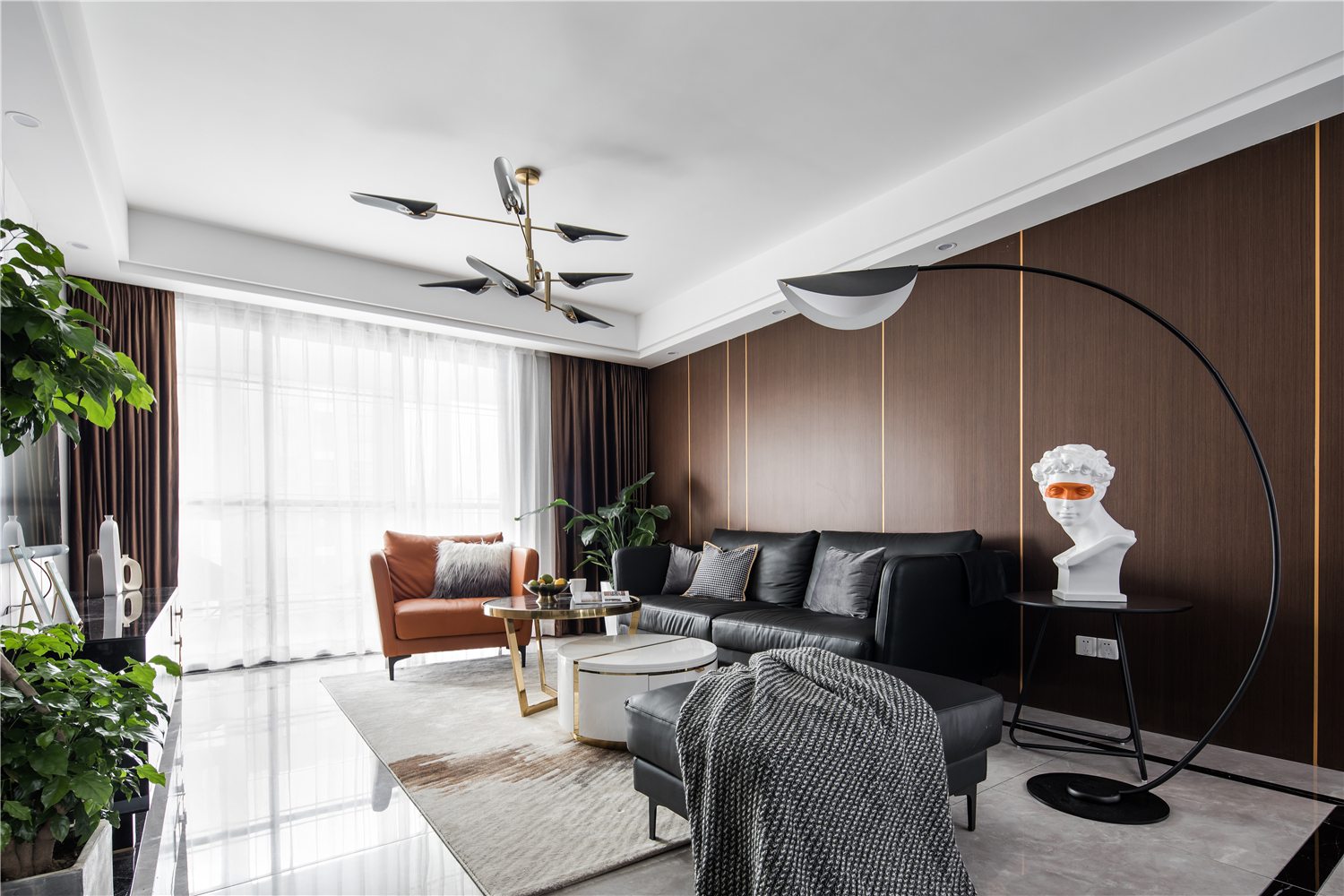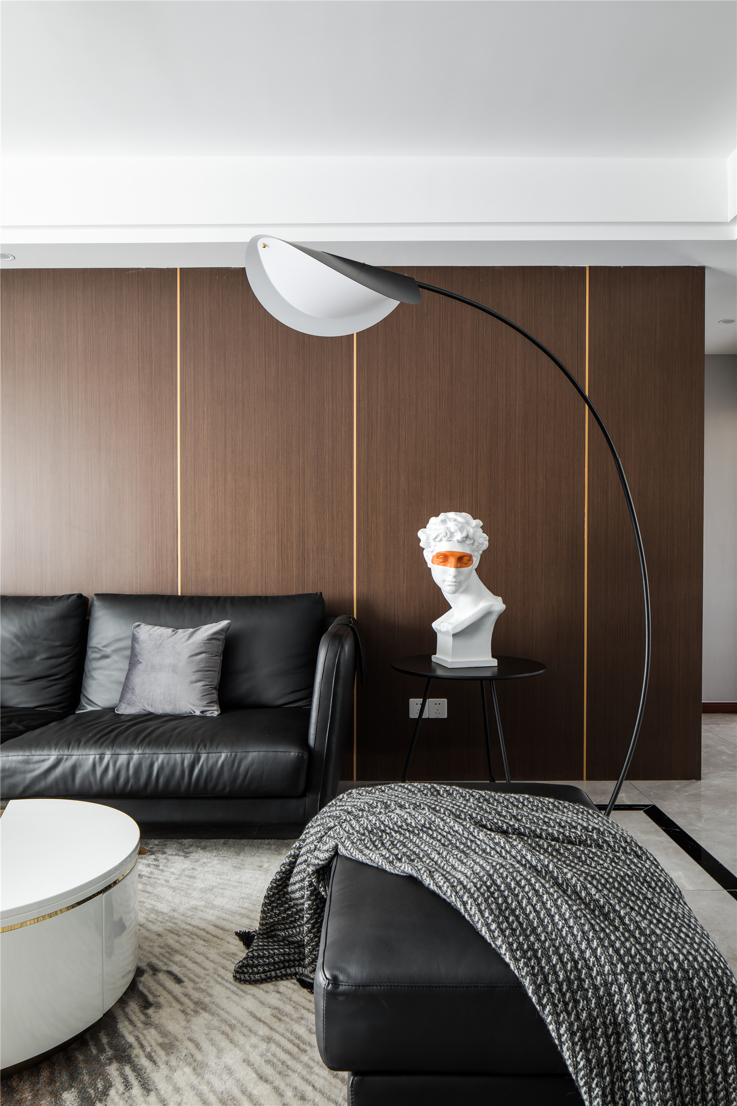 设计选材:简约的家具,黑色的沙发,大理石台面的茶几,再搭配一些金属元素,空间也变得更加精致细腻。