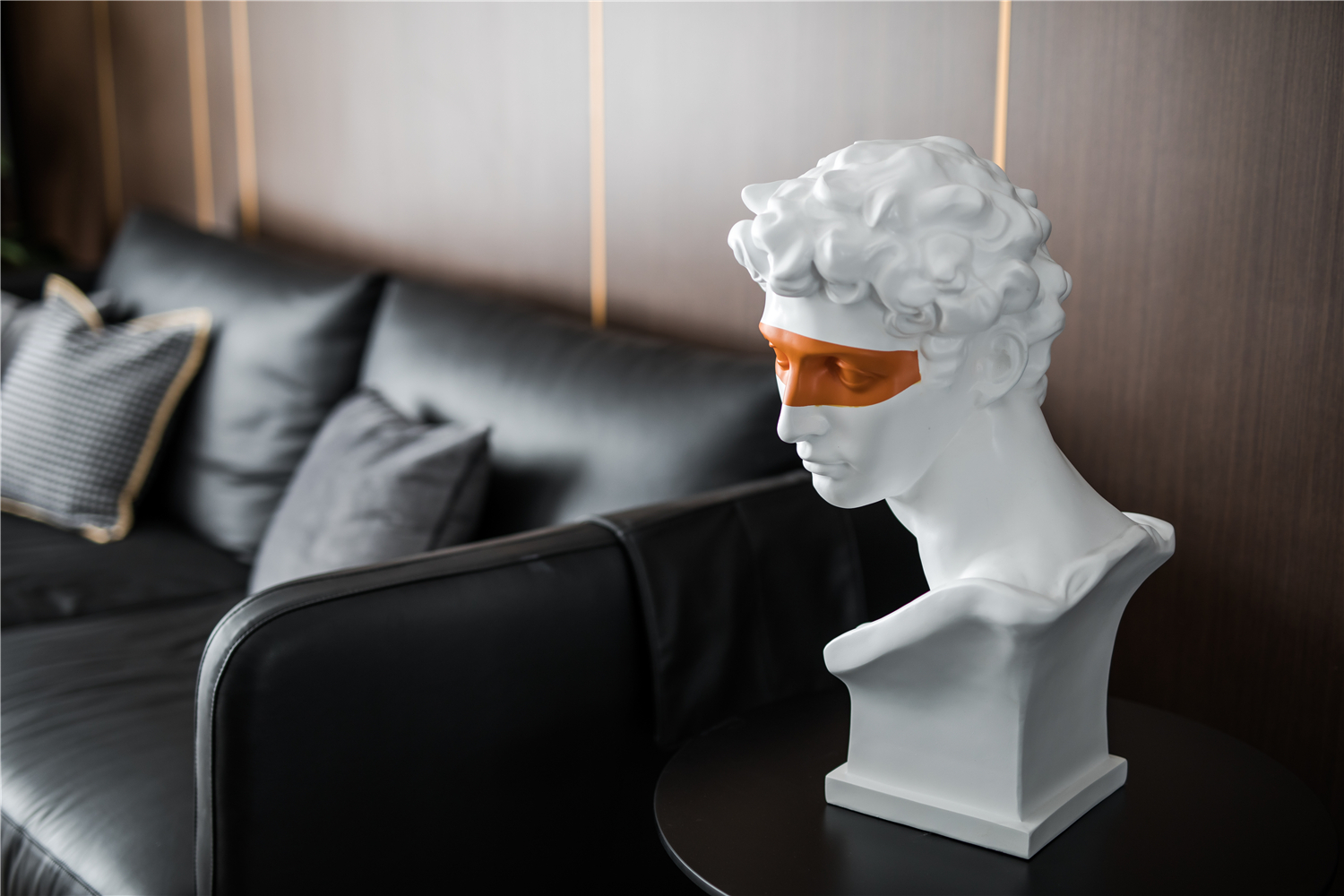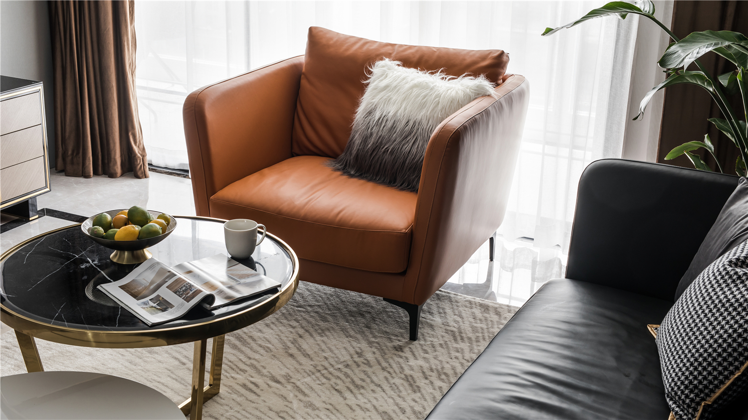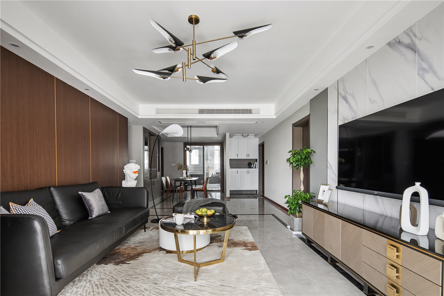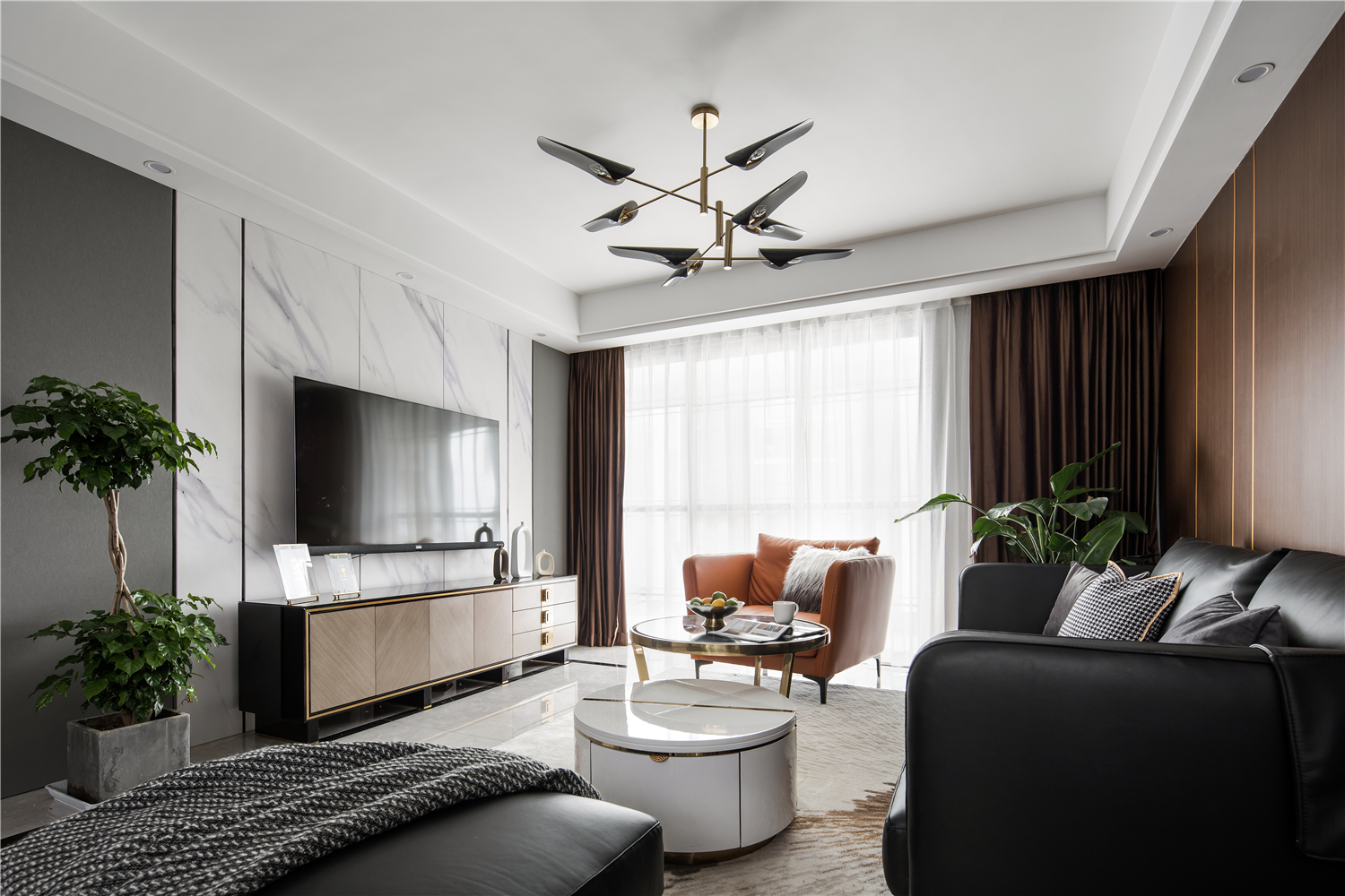 设计选材:简约的家具,黑色的沙发,大理石台面的茶几,再搭配一些金属元素,空间也变得更加精致细腻。