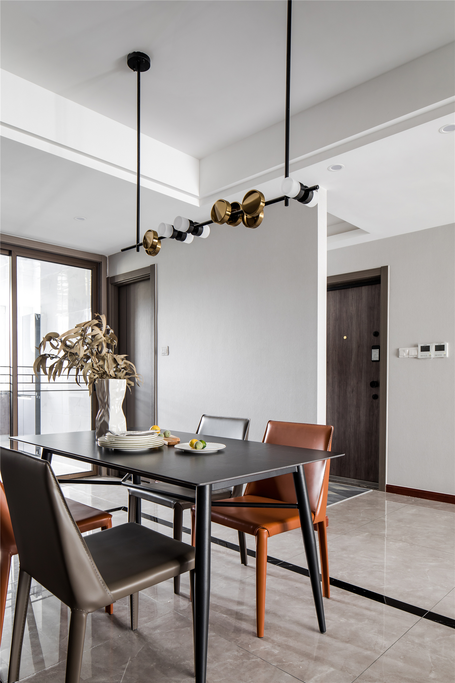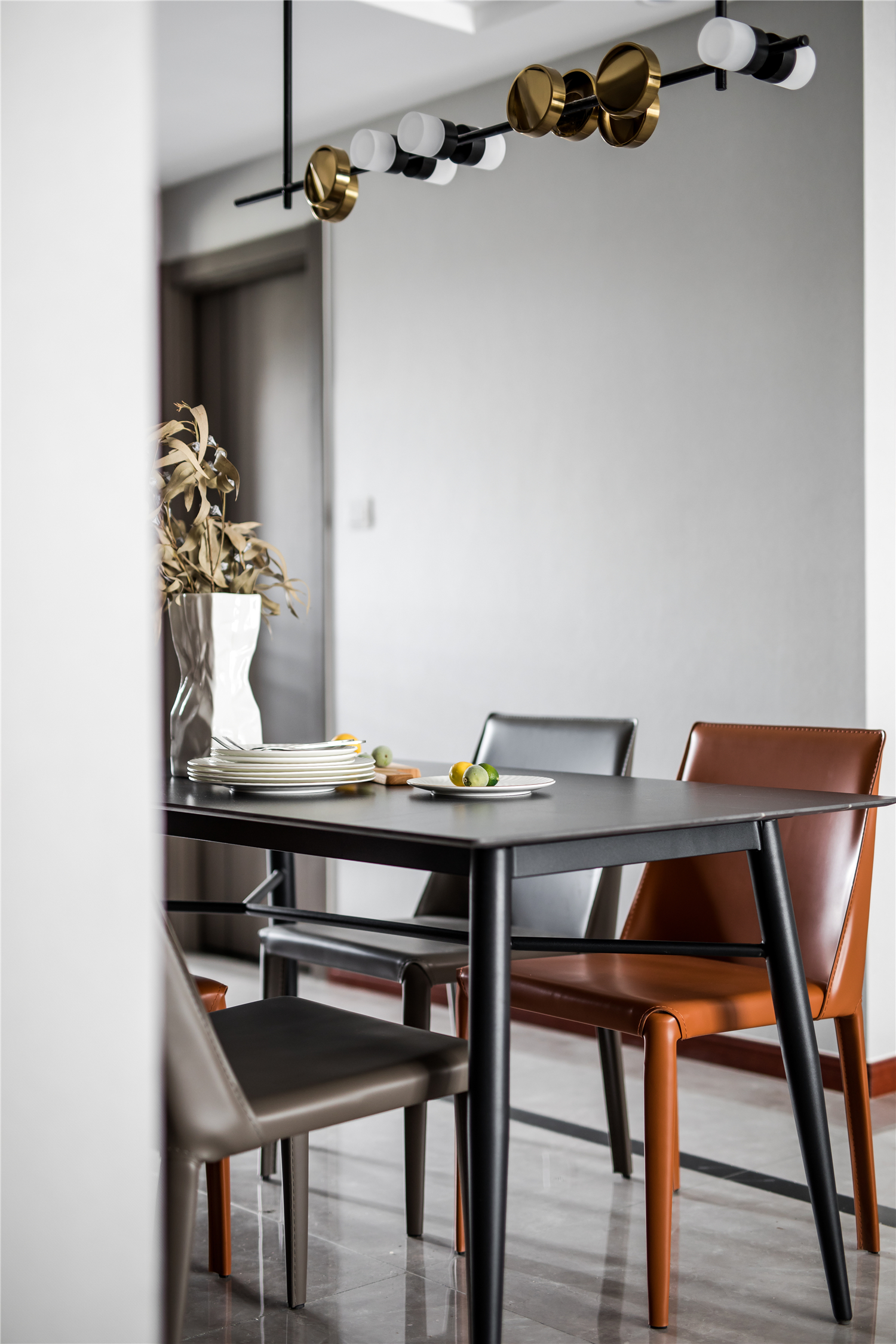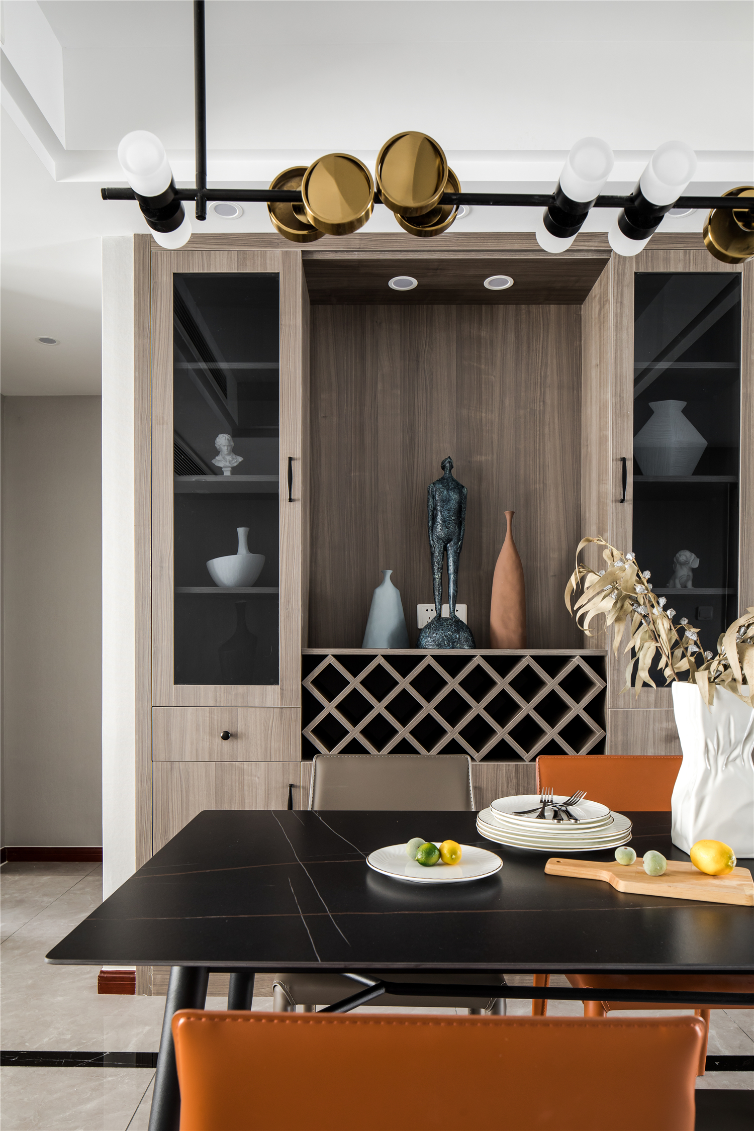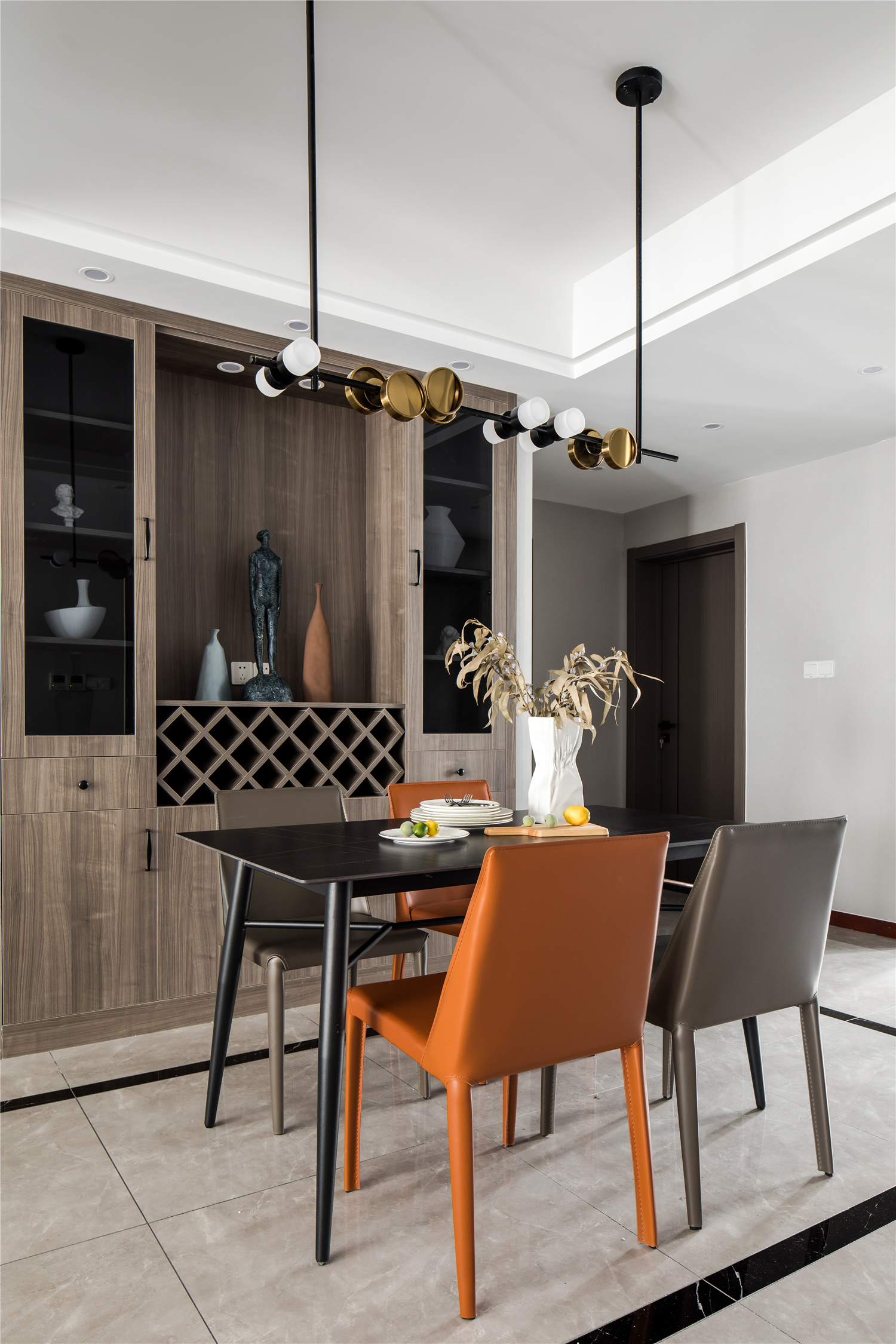 餐桌也是黑色台面,搭配咖色橘色餐椅点缀,刚好与胡桃木色的酒柜完美的结合。多头的吊灯,正对着餐桌,让就餐变得更有食欲,带来赏心悦目的生活亮点。空间造型多变而有层次感,打破视线的单一与无趣。 -