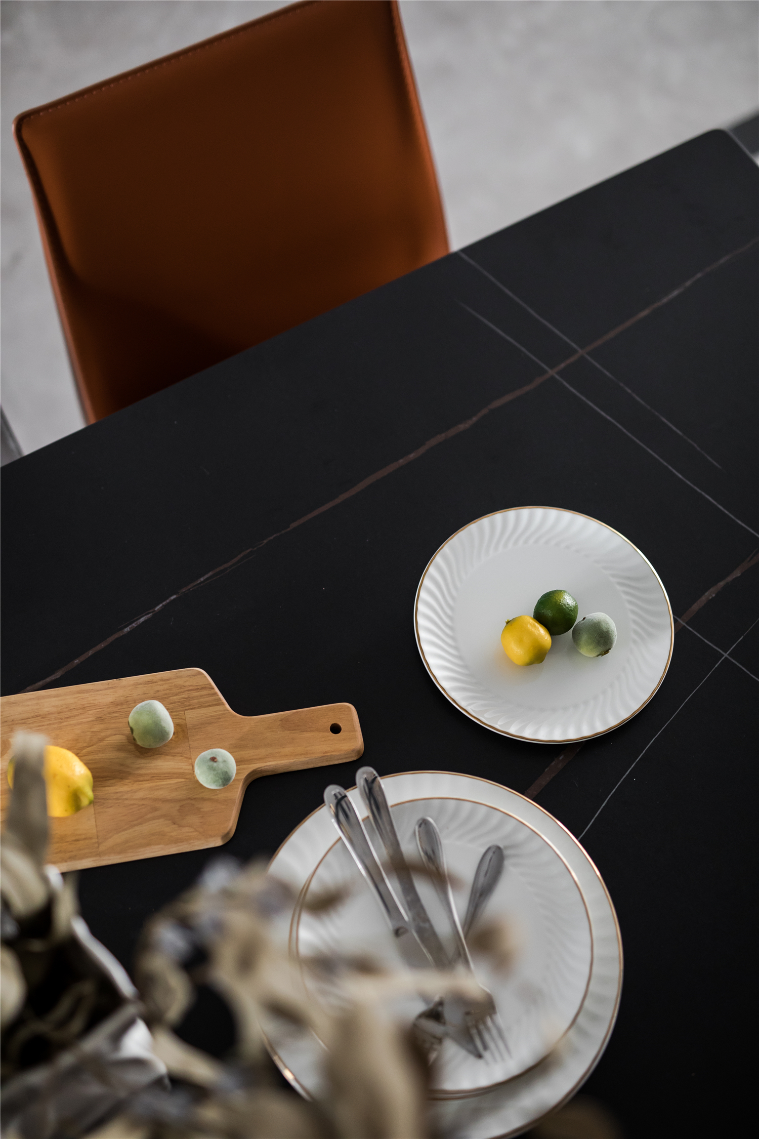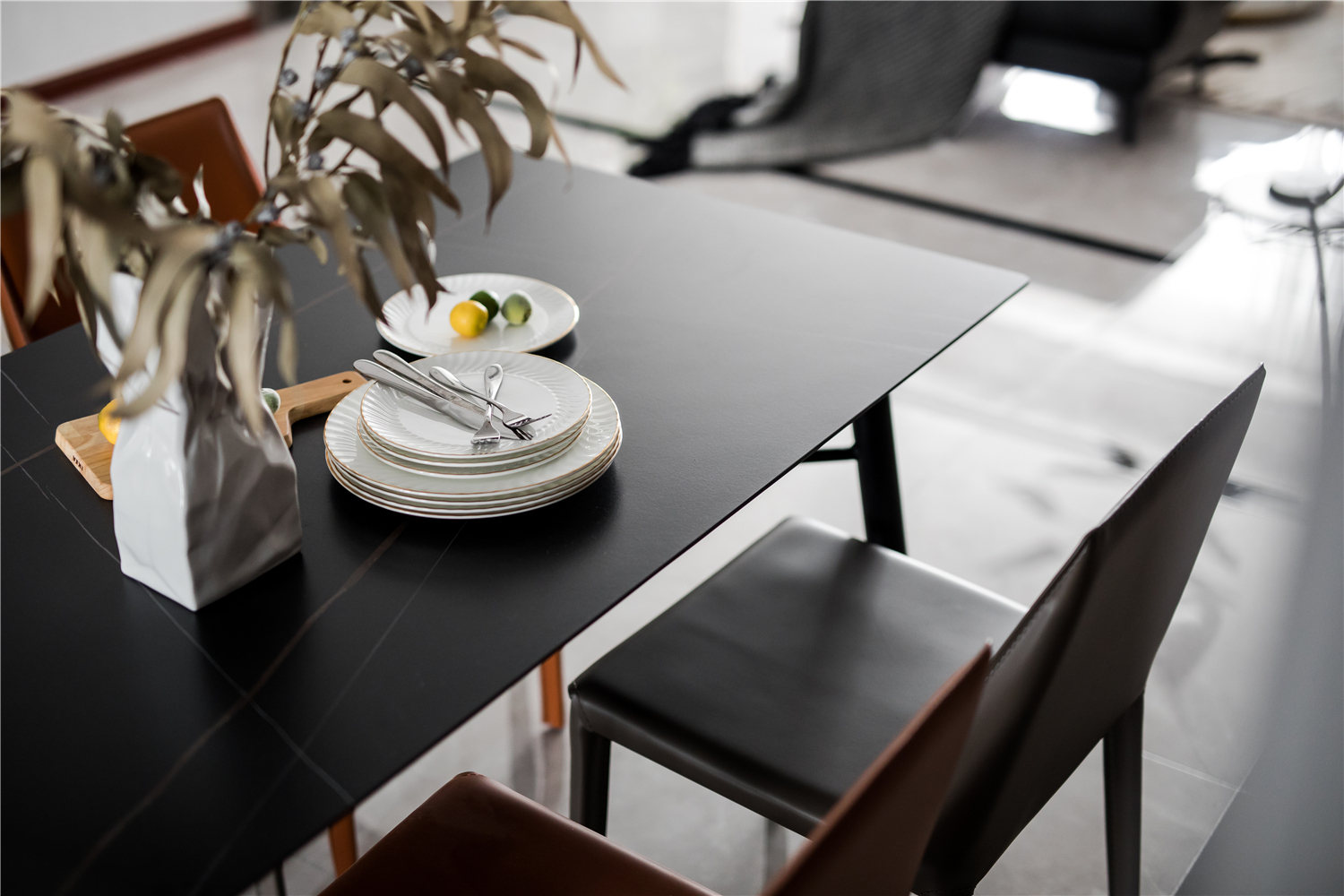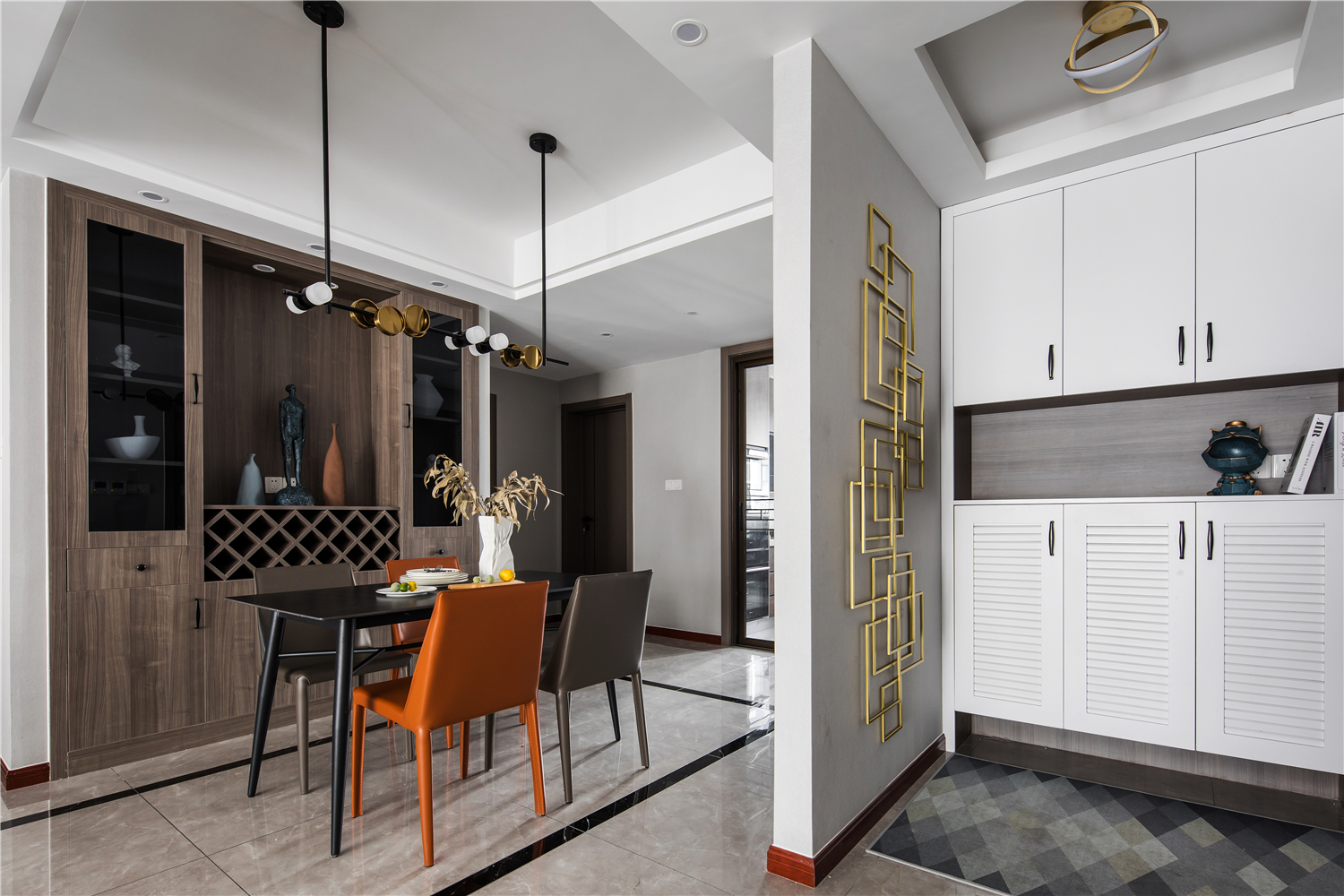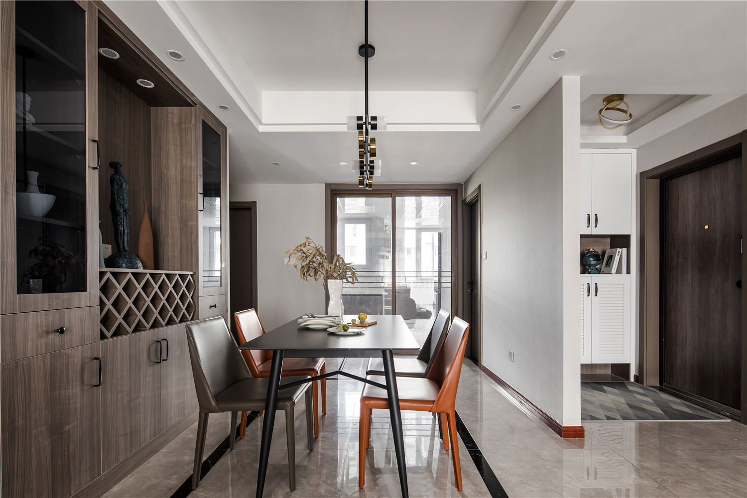 餐桌也是黑色台面,搭配咖色橘色餐椅点缀,刚好与胡桃木色的酒柜完美的结合。多头的吊灯,正对着餐桌,让就餐变得更有食欲,带来赏心悦目的生活亮点。空间造型多变而有层次感,打破视线的单一与无趣。 -