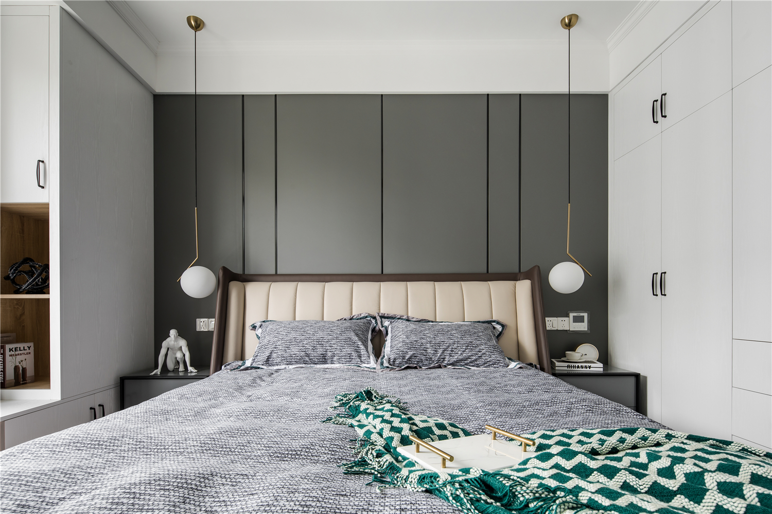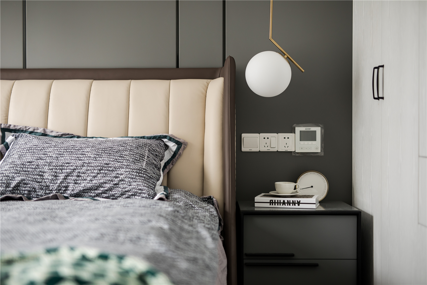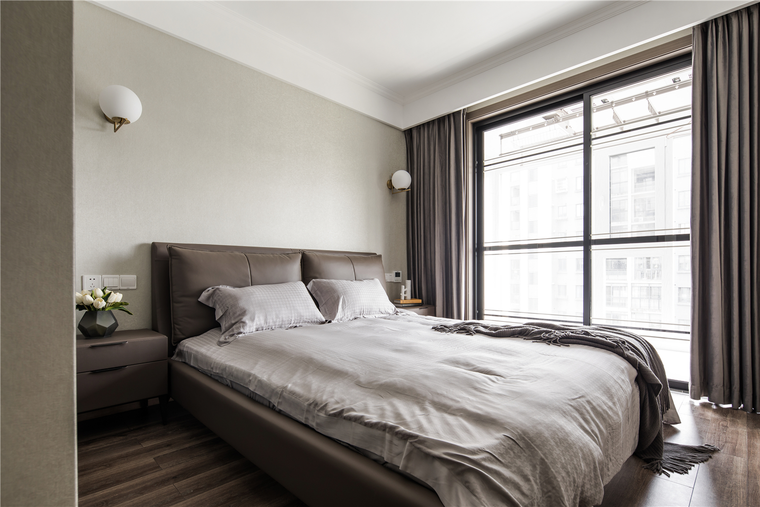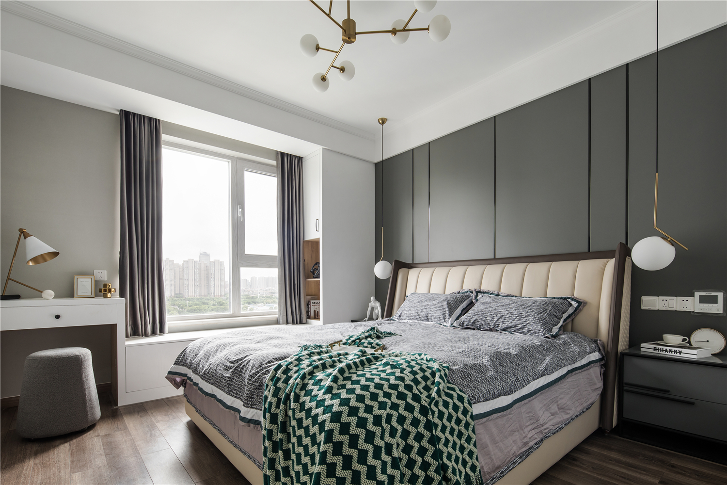 空间布局:主卧简约干净的空间,以灰绿色调为主,飘窗也加入了灰色的坐垫,整体布置简约舒适而又惬意自然。