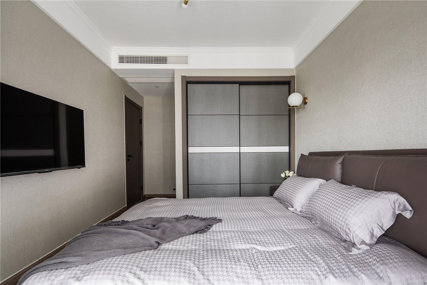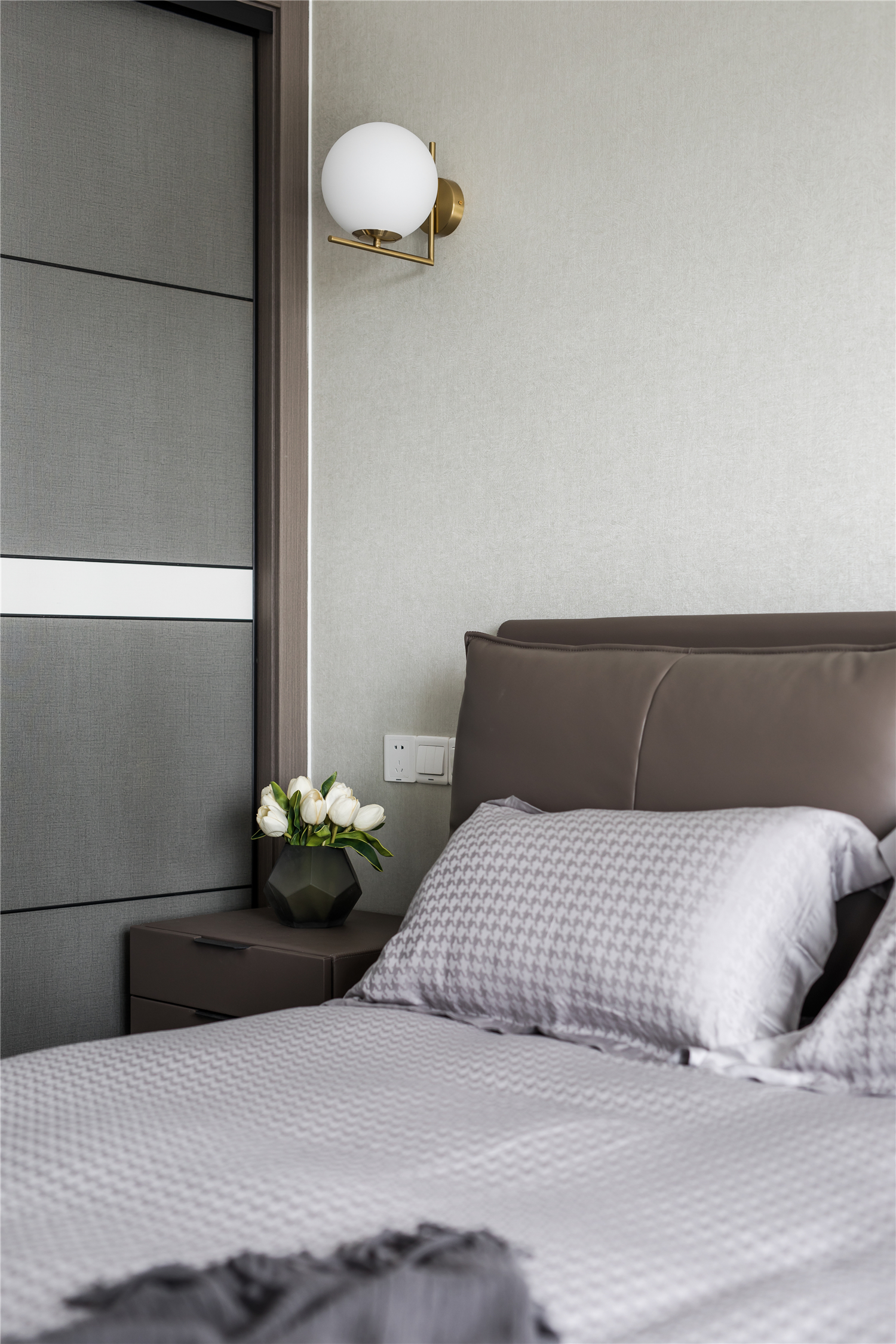 次卧选用驼色、咖色等暖色与高级灰相搭配,细节之处点缀金色光芒,自然而克制的呈现空间精致优雅之感。