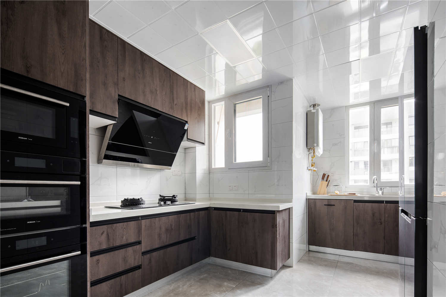 空间意境:客厅胡桃木的沉稳,与宁静优雅的灰色地砖地形成对比,雪花白大理石为客厅电视背景,简洁的黑白色块看起来非常雅致。
