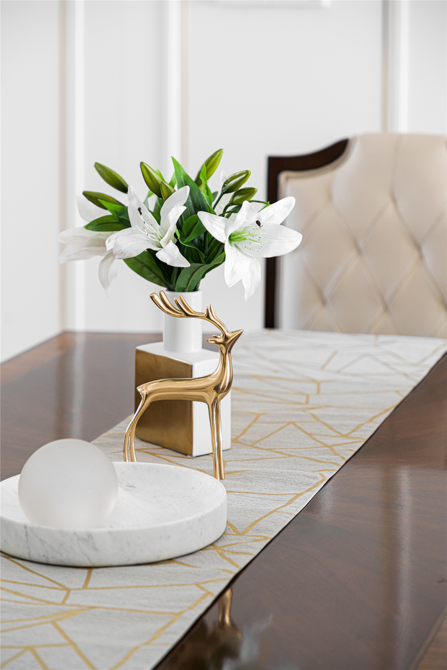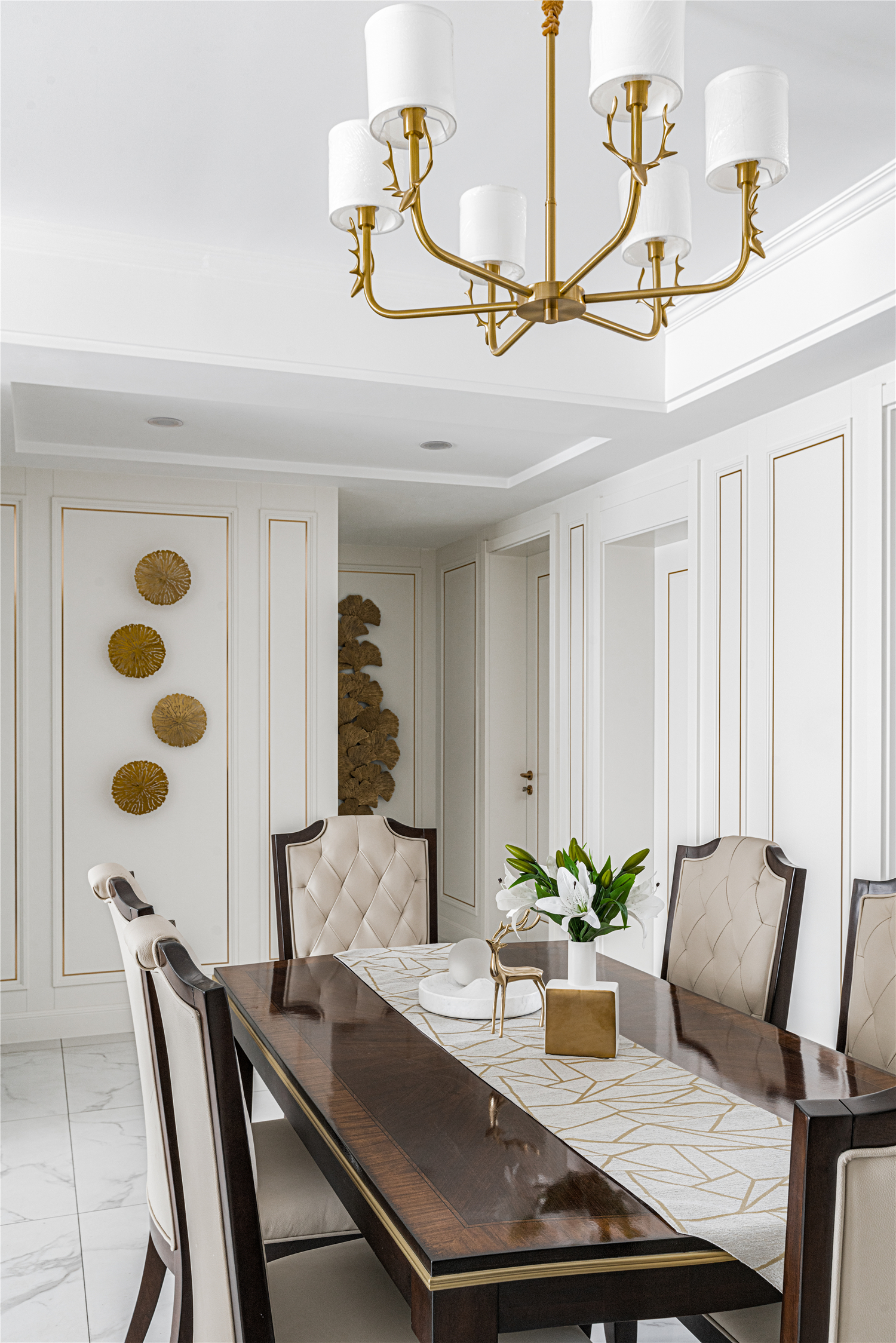 餐厅空间原本颜色简淡,我们在原基础上添置了实木软包拼接的餐桌椅,用恰当好处的设计笔法,给空间带来了优雅的魅力与庄重之感。一盏米色金属吊灯以最明媚欢快的光辉,点亮一家人美好的餐桌时光。