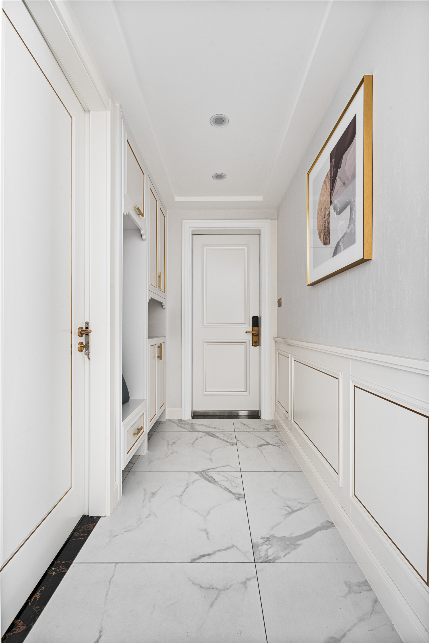 全屋色系采用浅米色,用特有的明度和柔光缓解疲惫。用浅米色的温柔缱绻包容年少的率真,既要成长也要守住初心。配套的鞋柜精巧细致,足够安放进出门的鞋履,右侧柜体设计了衣柜让衣物有了很好的去处。极具创意抽象的装饰画,几近优雅,是初遇的时刻。 -